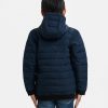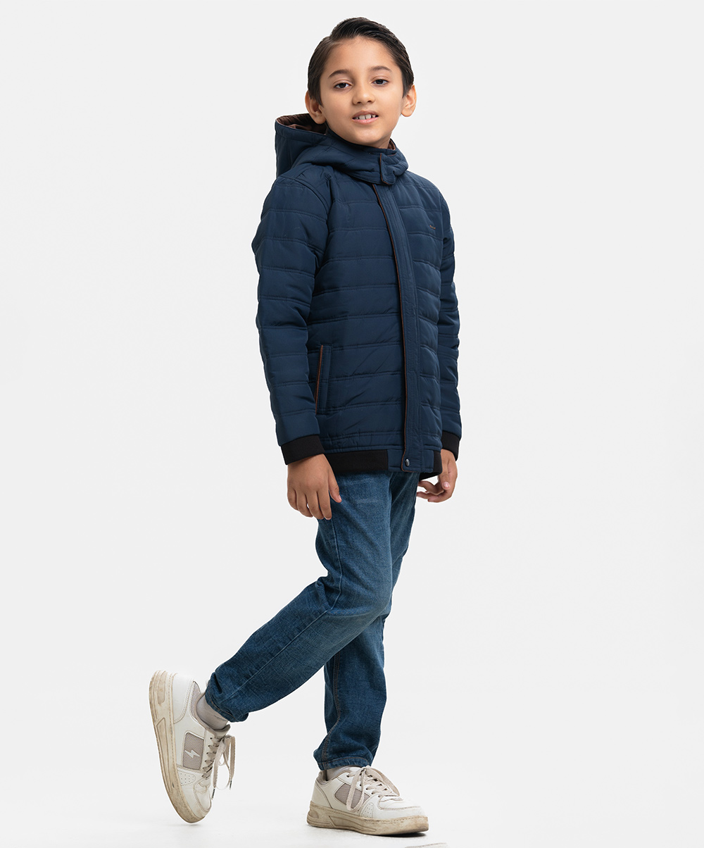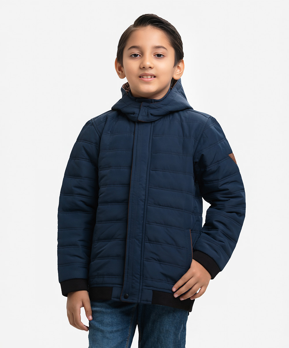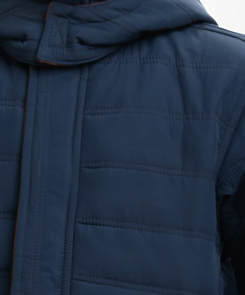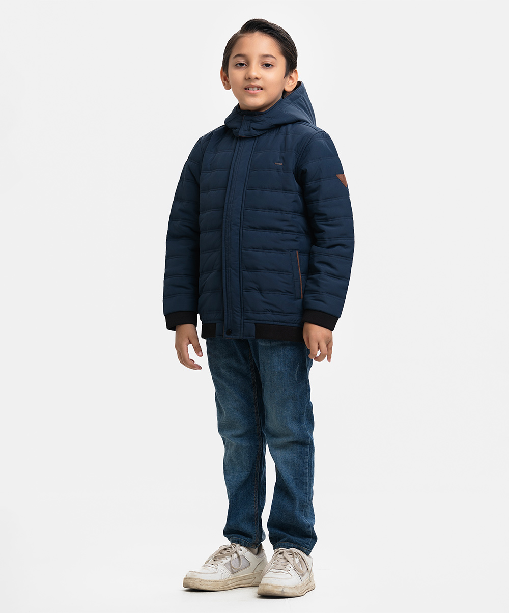 Detachable hoodie jacket in padded puff fabric. Enclosed zipper closing with side pockets.
