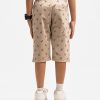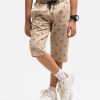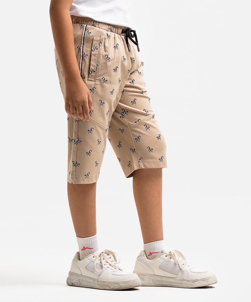 Kid boys printed three-quarter pant in cotton knit single jersey fabric. Concealed elasticated on the waistline with two side pockets and one patch pocket.