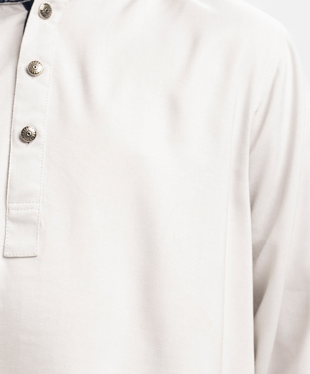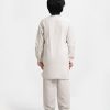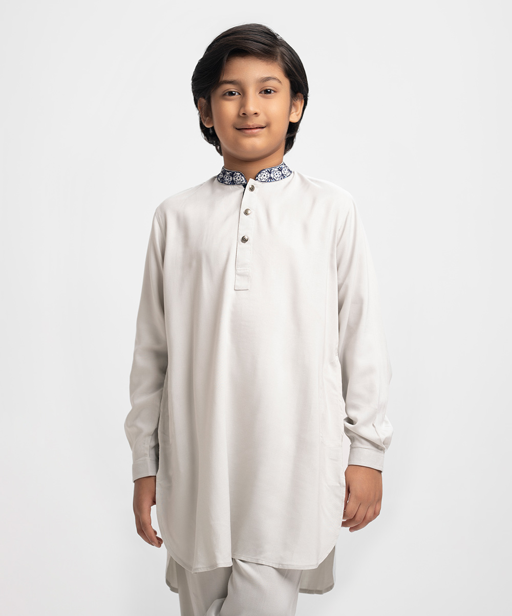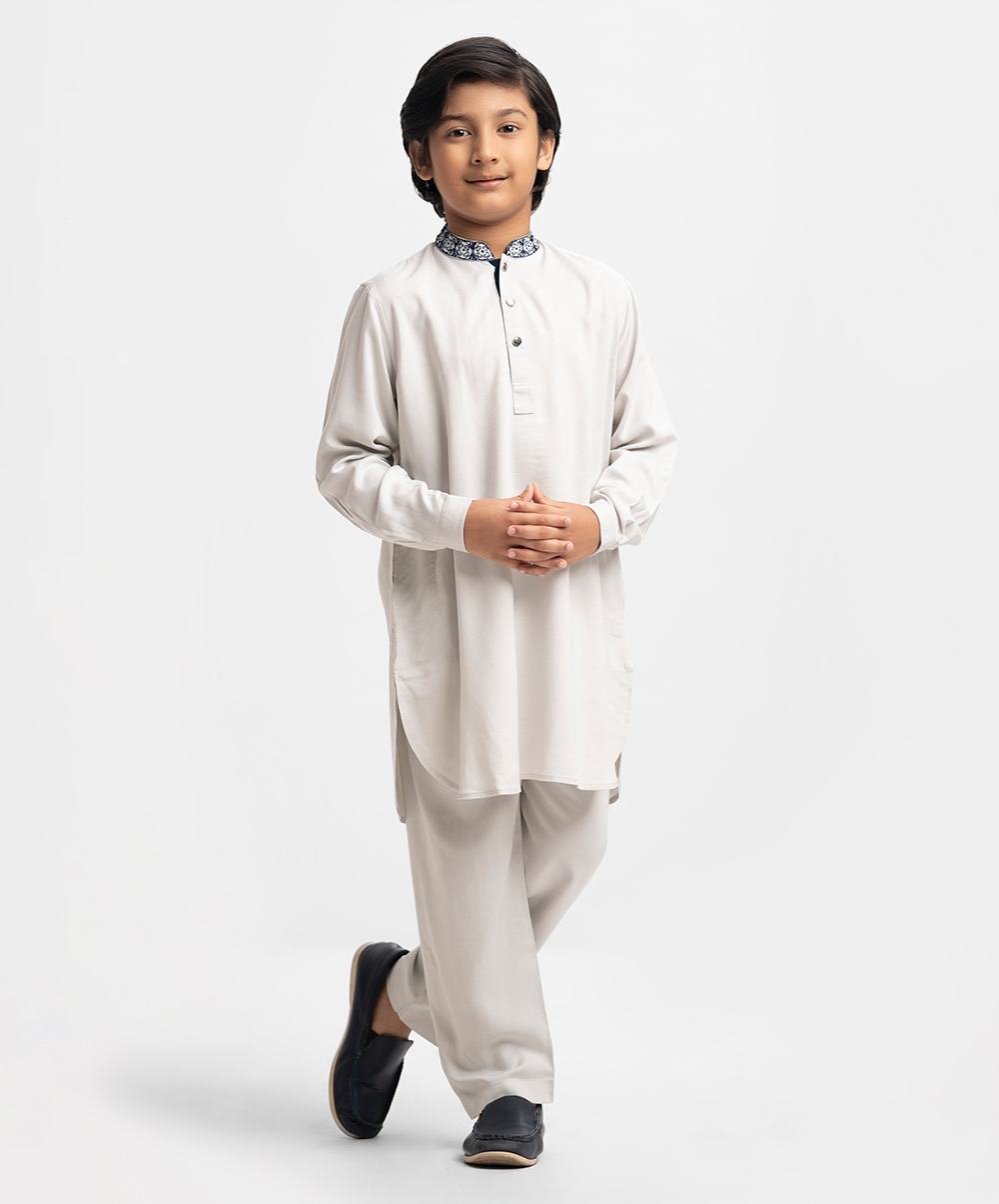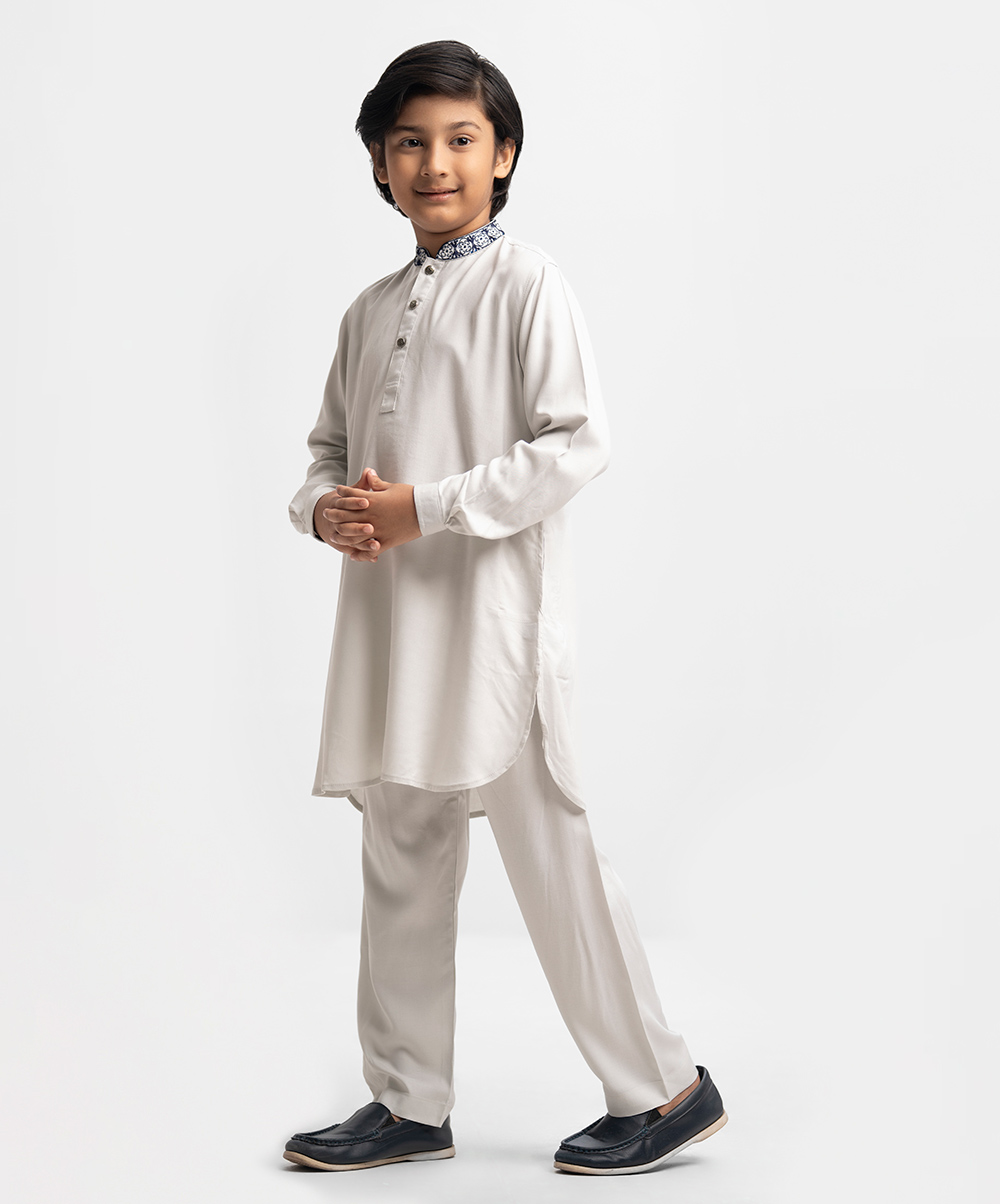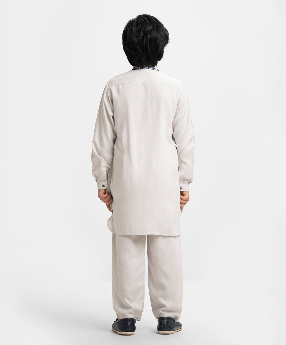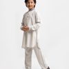 Kid boys kabli panjabi and pajama set in viscose fabric. Mandarin collar with karchupi work, full sleeves. Inseam pockets on the sides.