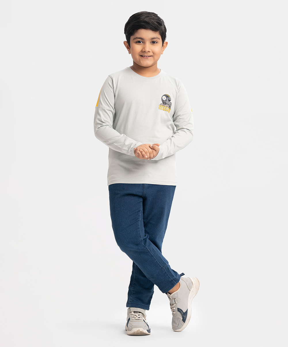 Kid boys t-shirt in cotton single jersey fabric. Full sleeves, round neck. Print at front.