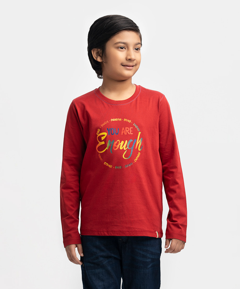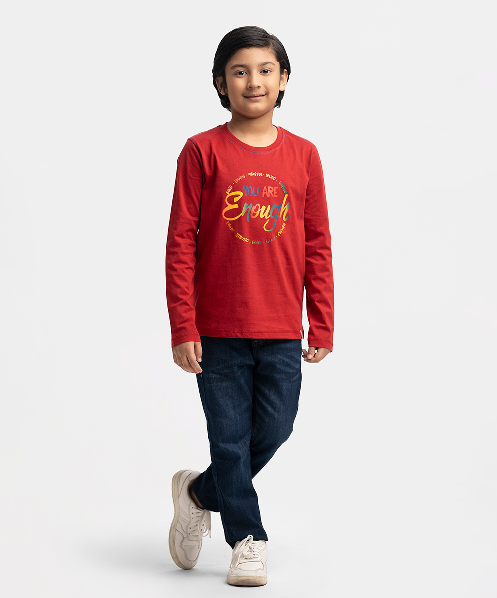Kid boys t-shirt in cotton single jersey fabric. Full sleeves, round neck. Typographic print at front.