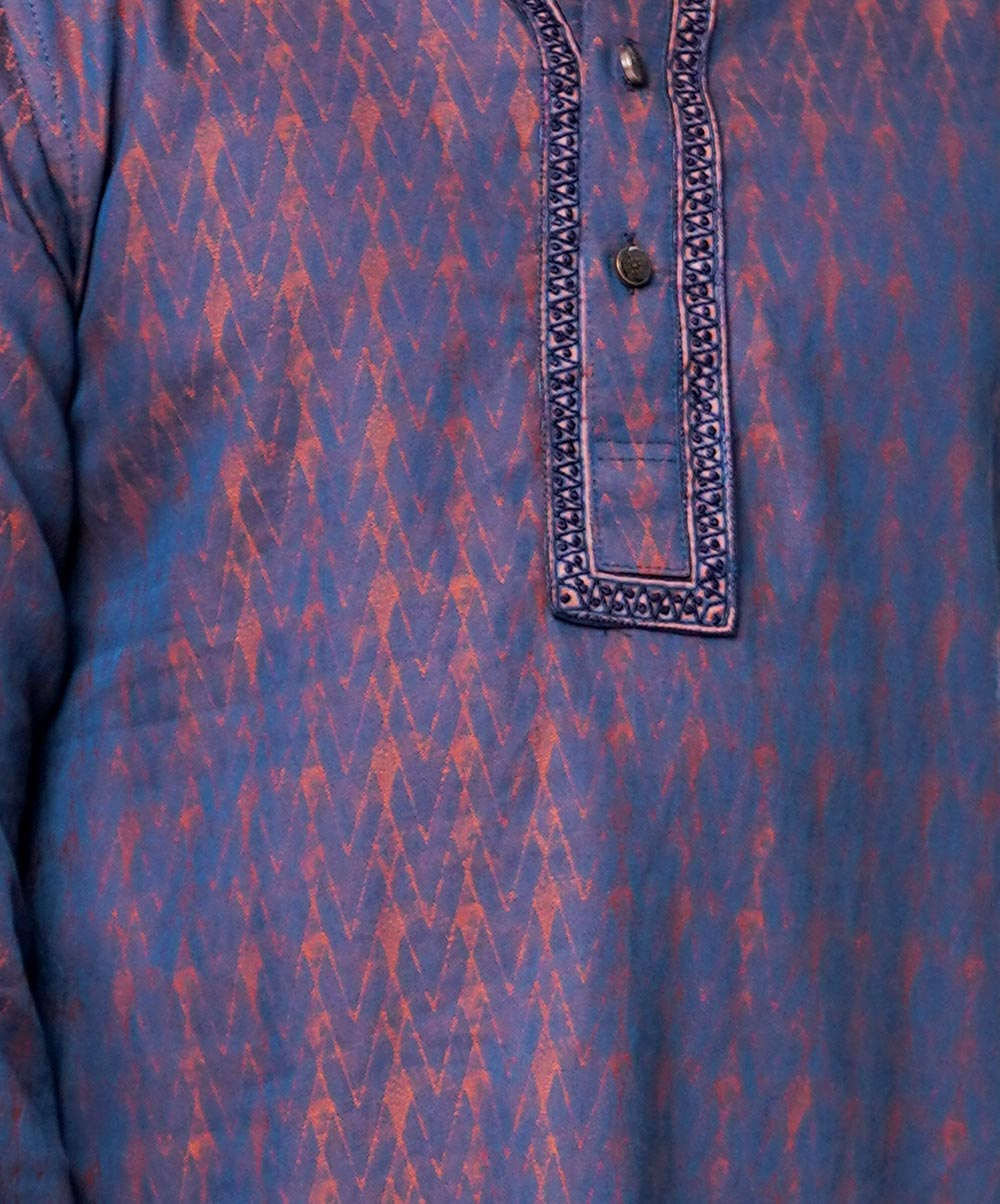Blue Panjabi in Jacquard Cotton fabric. Designed with minimal karchupi on the collar and placket.