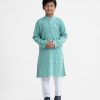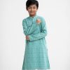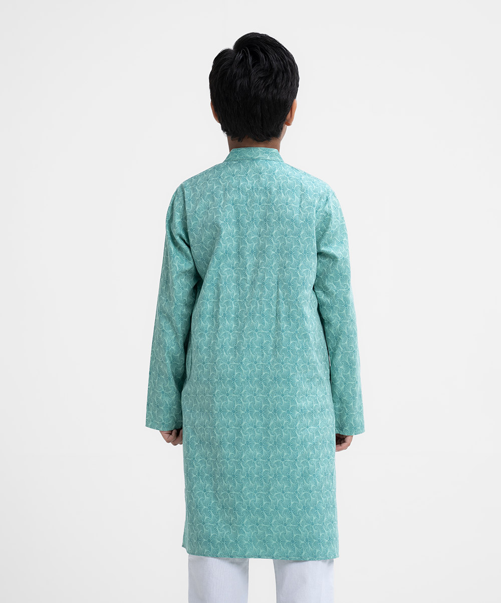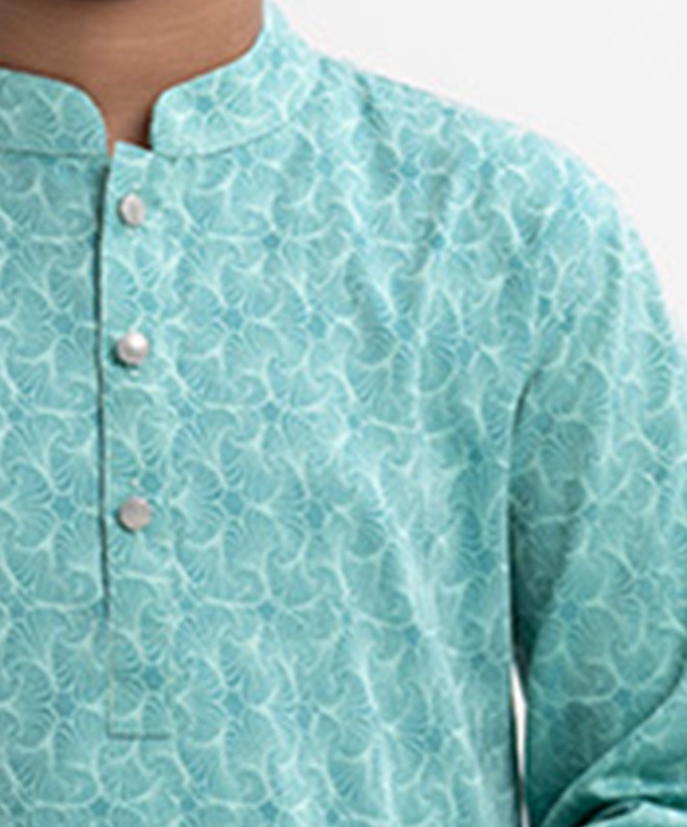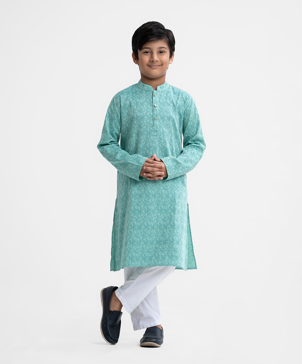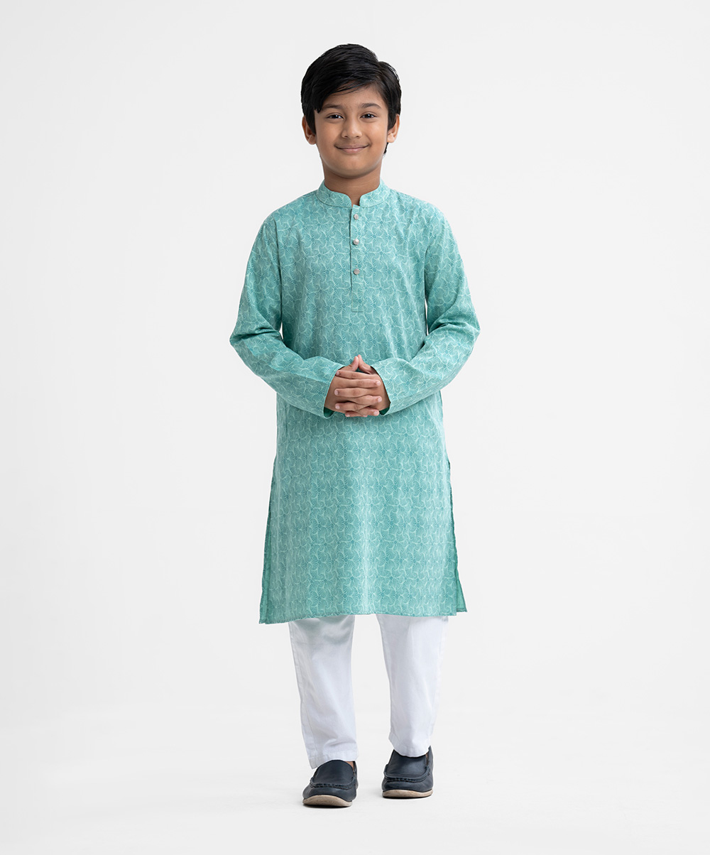 Kid boy’s panjabi in Jacquard fabric. Mandarin collar, buttons placket & full sleeves. Inseam pockets.