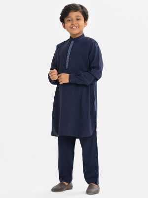Kid boys panjabi in printed viscose fabric. Mandarin collar and inseam pockets. Long sleeve with line stitching