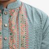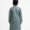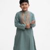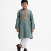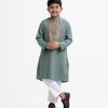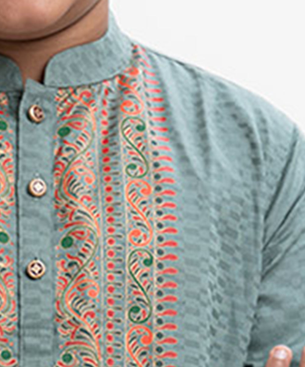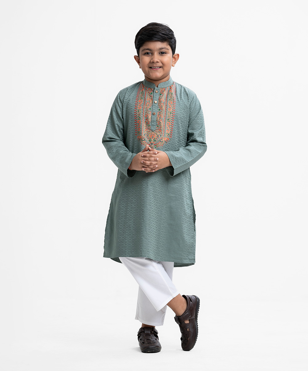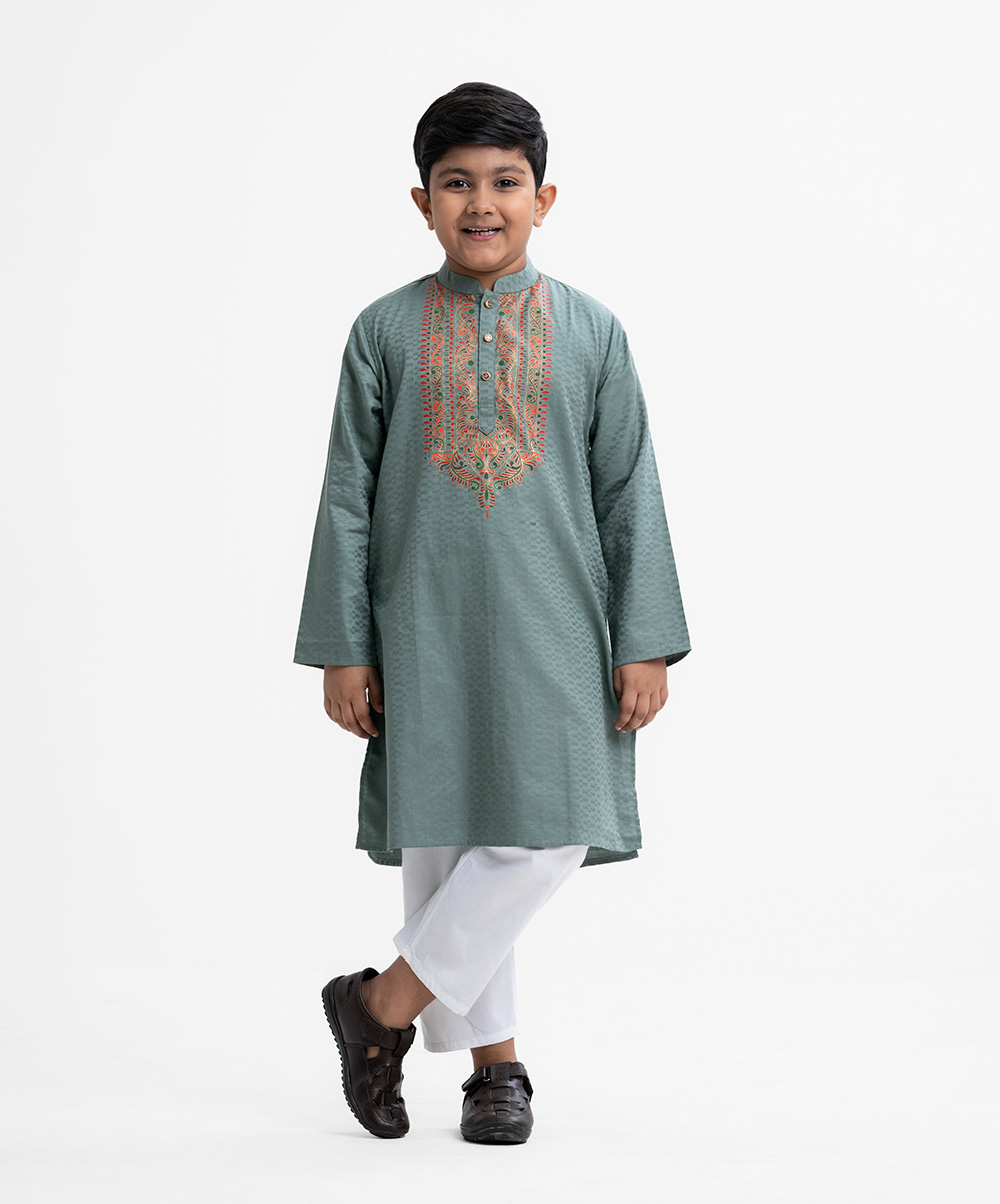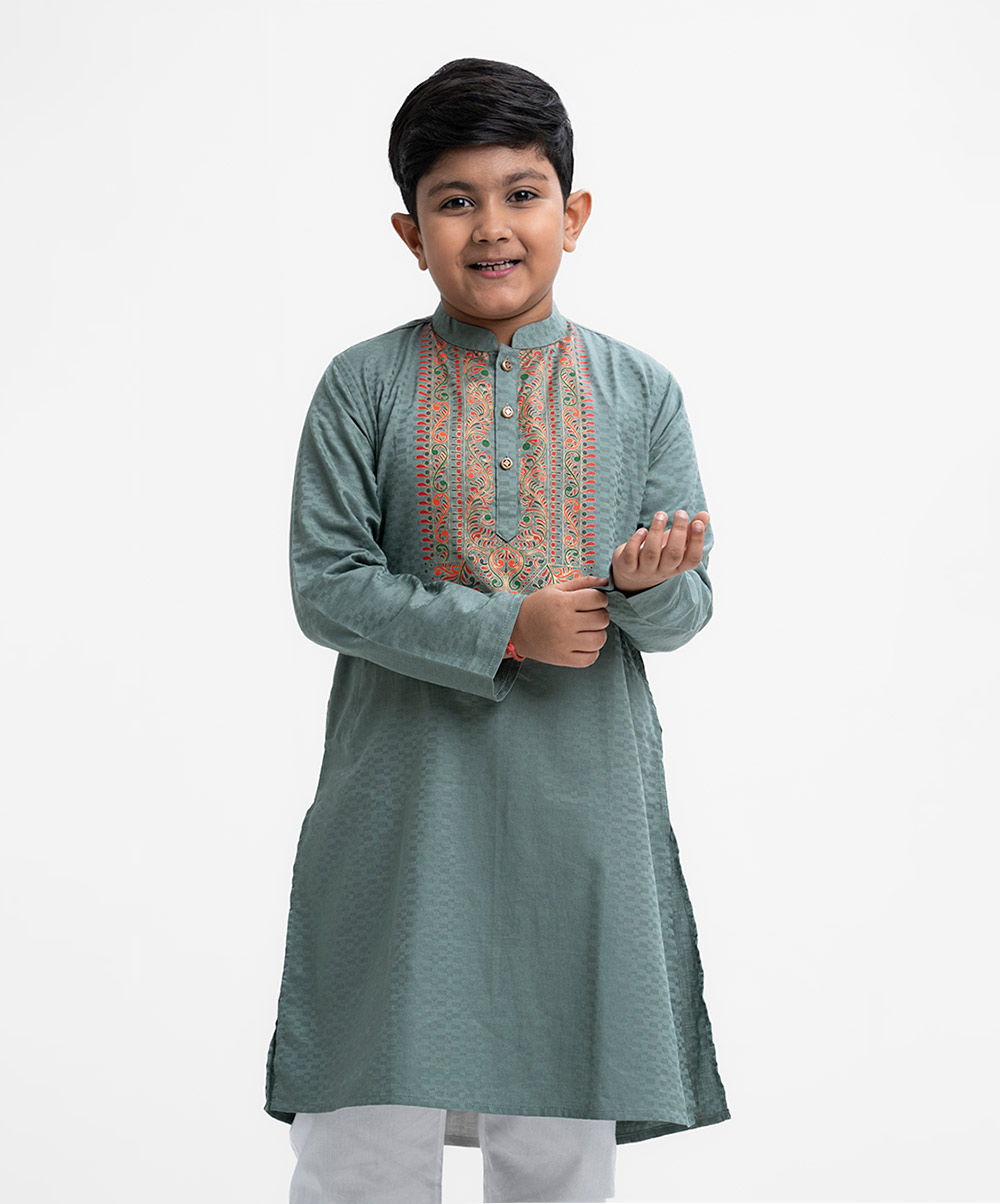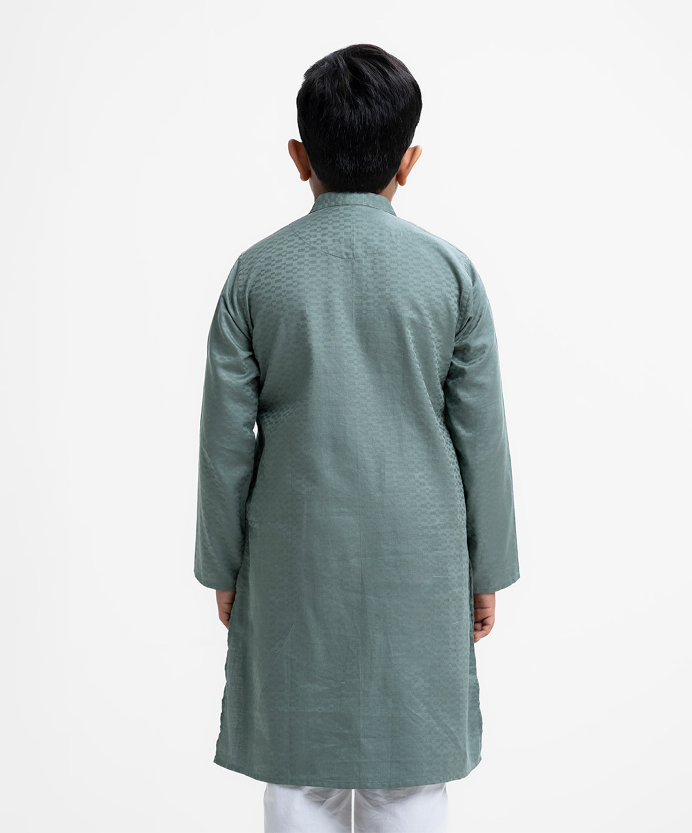 Kid boy’s panjabi in cotton jacquard fabric. Mandarin collar, buttons placket & full sleeves cuff. Inseam pockets & print details at front.