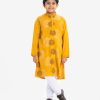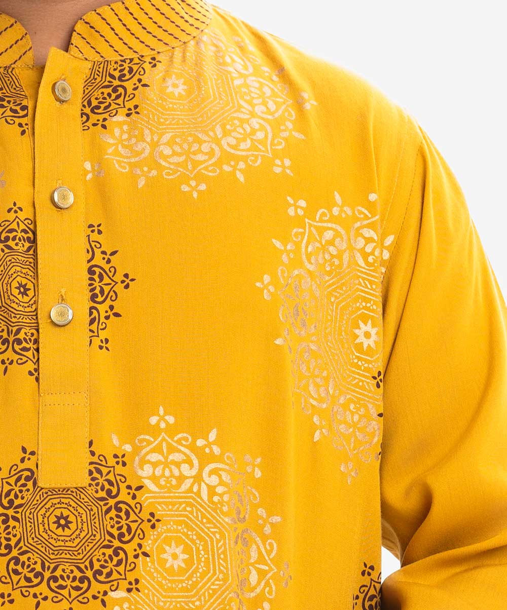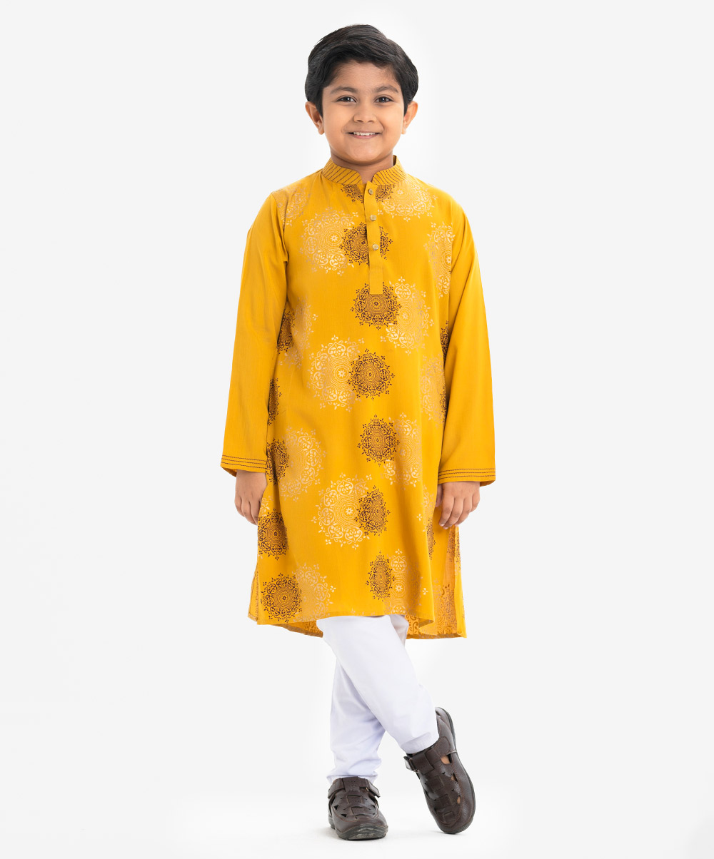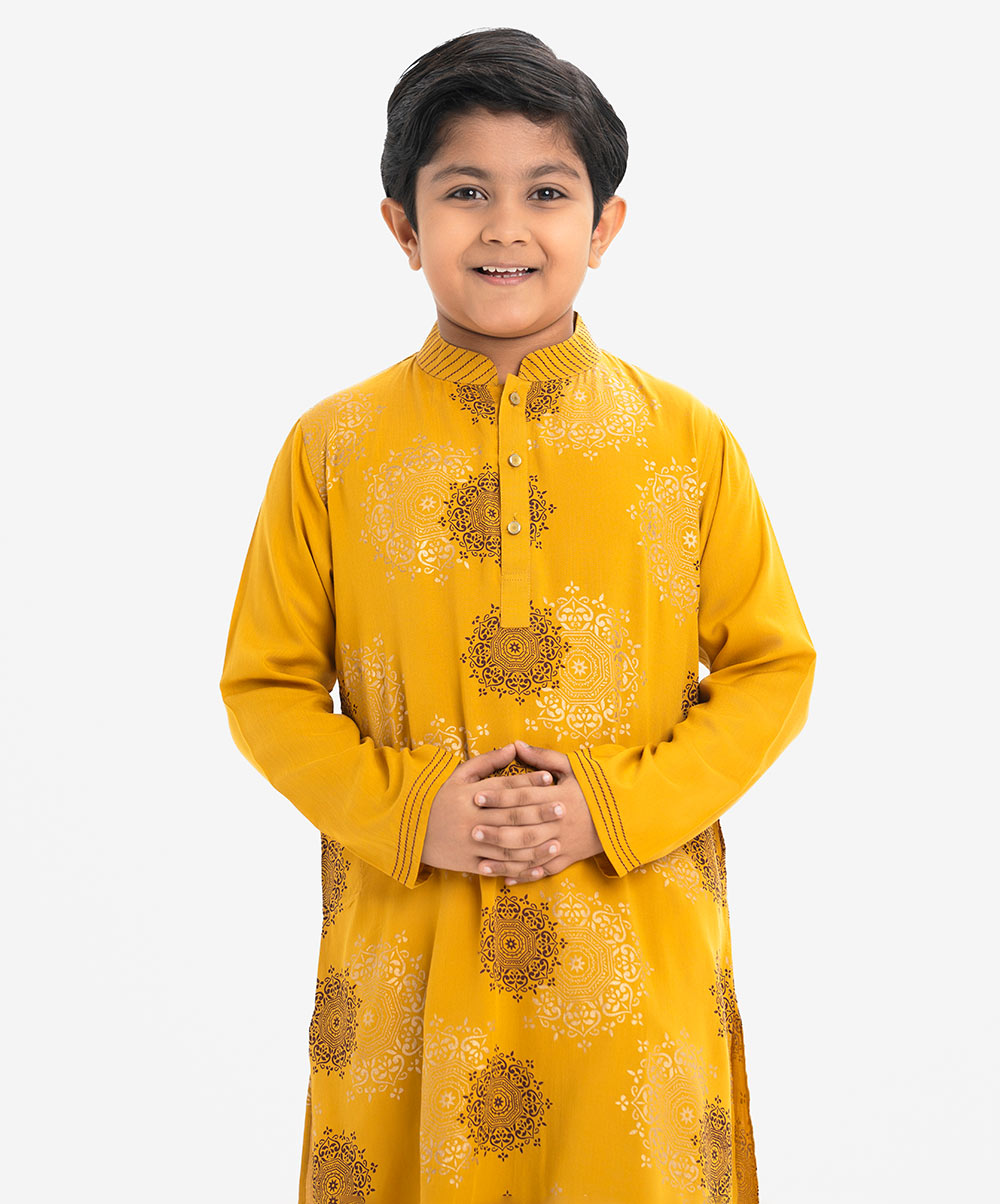 Kid boys mandala printed panjabi in viscose fabric. Line stitching at the mandarin collar and the full sleeves hem. Inseam pockets.