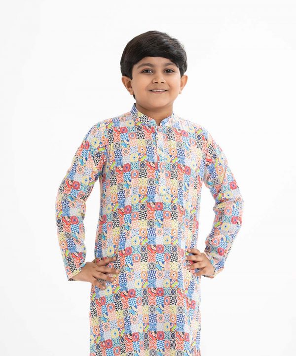 Kid boys’ printed panjabi in cotton fabric. Mandarin collar, inseam pockets and long sleeves.