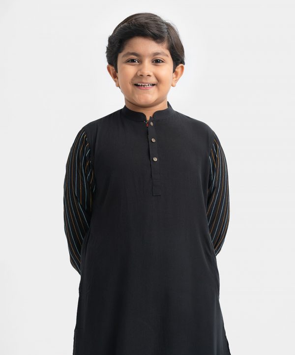 Kid boys panjabi in viscose fabric. Printed cotton fabric patch at the mandarin collar, placket and sleeves hem. Line stitching at full sleeves & inseam pockets.