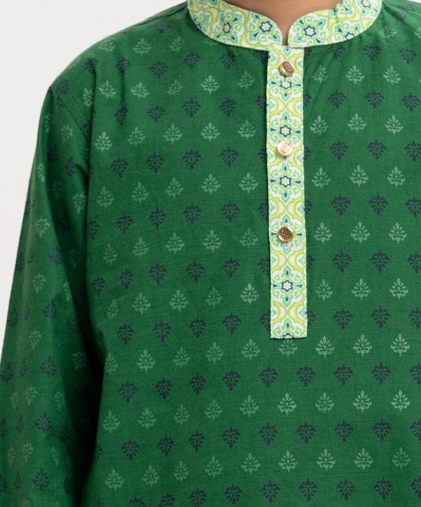 Kid boy’s panjabi in printed cotton fabric. Patch at mandarin collar, buttons placket & full sleeves. Inseam pockets.