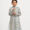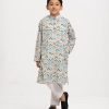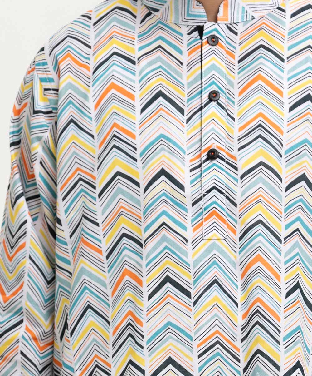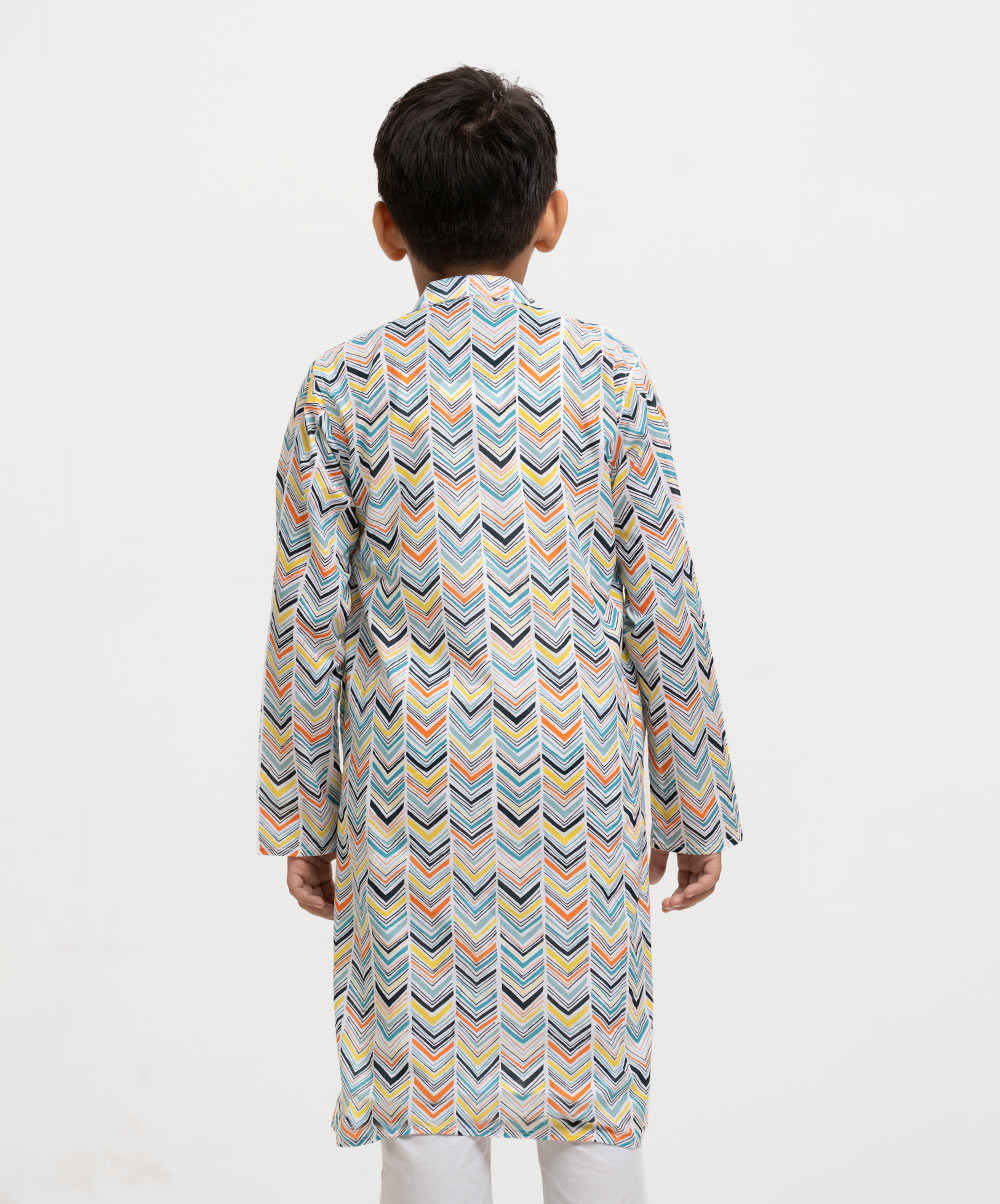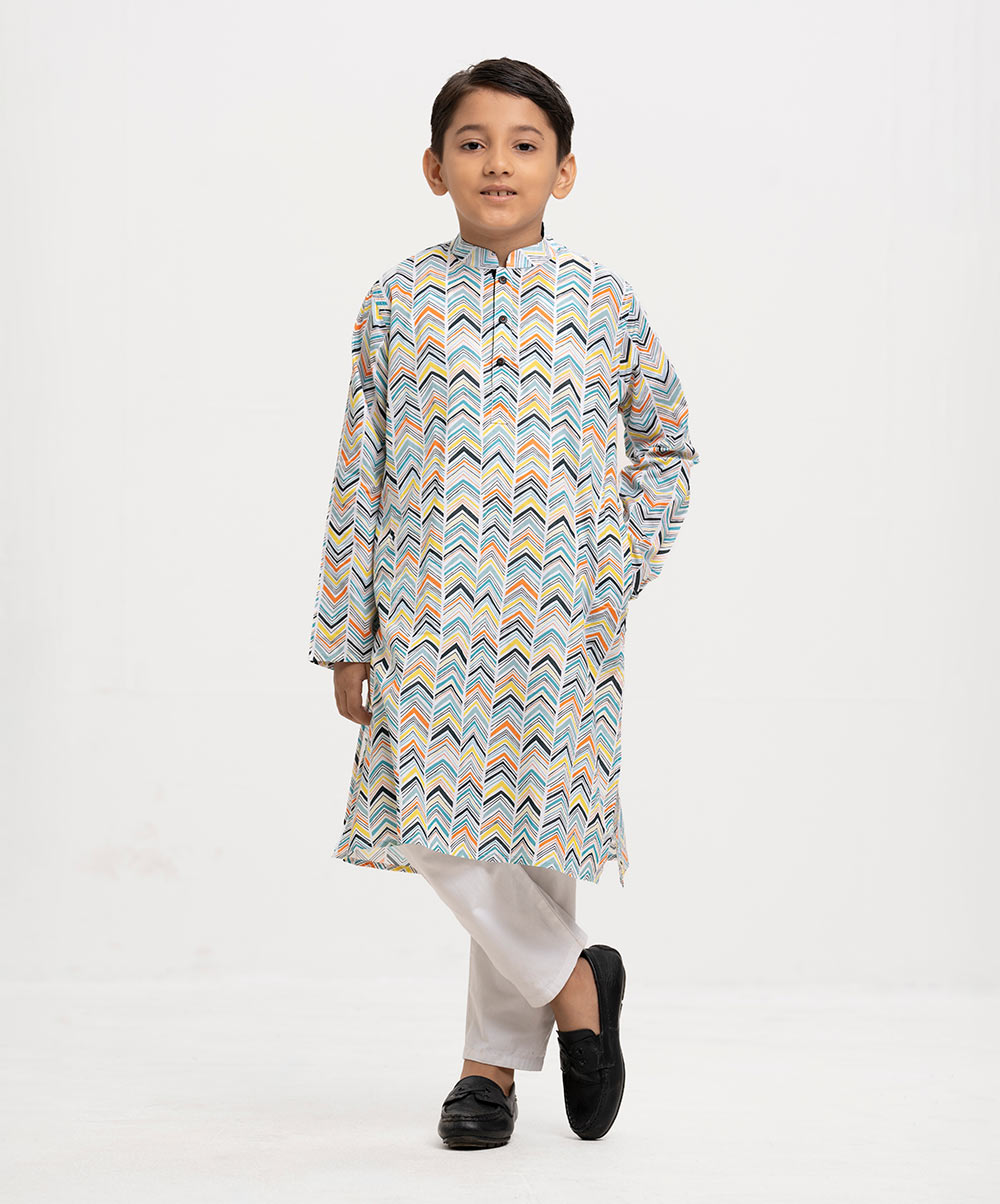Kid boy’s printed panjabi in cotton fabric. Mandarin collar, inseam pockets and long sleeves.