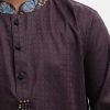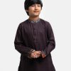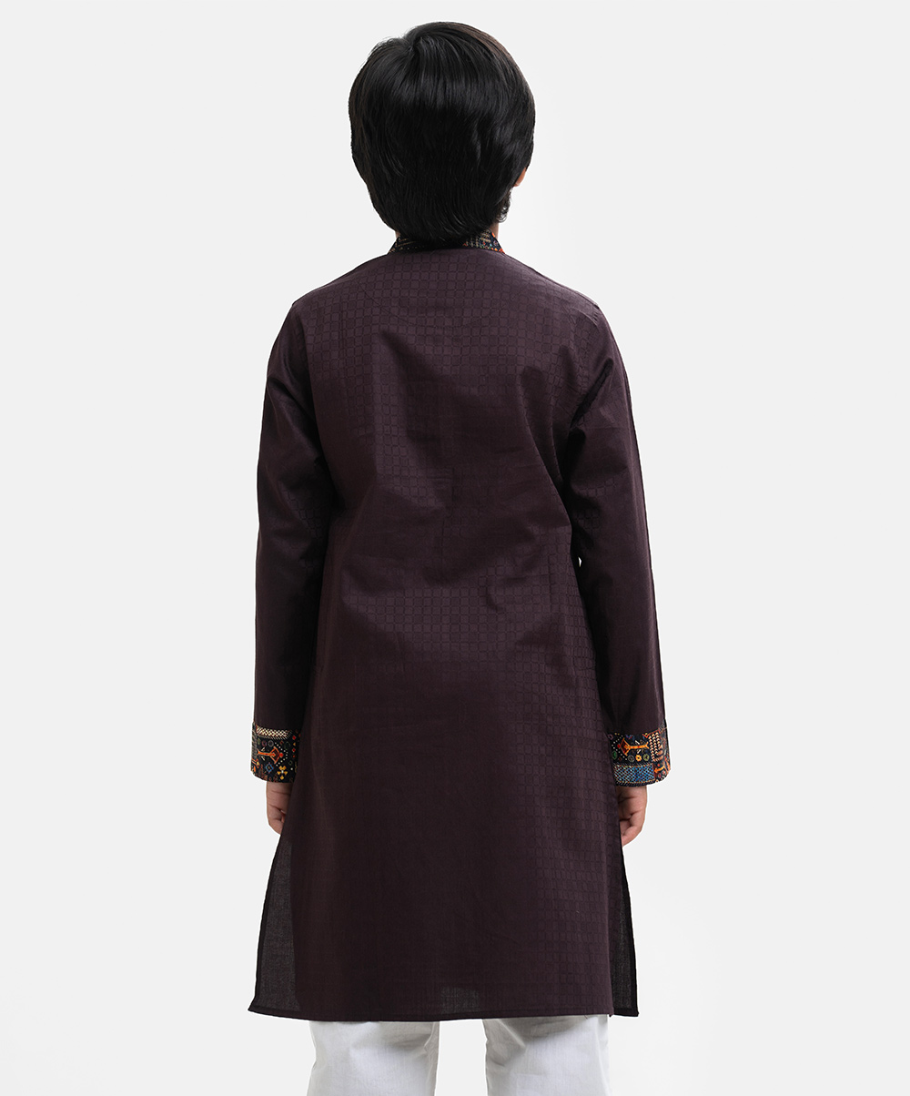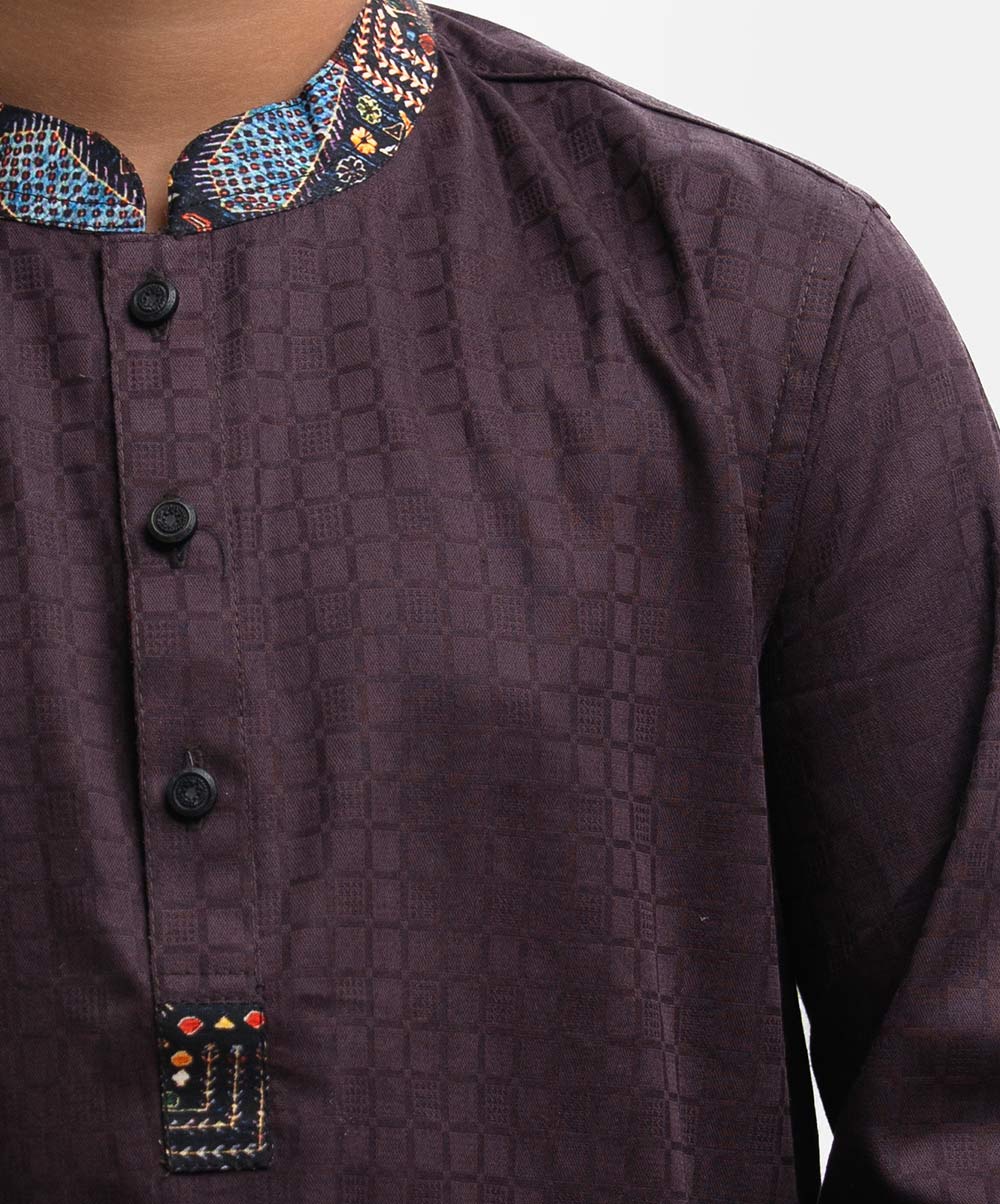 Kid boy’s panjabi in cotton jacquard fabric. Printed cotton patch at mandarin collar & placket. Full sleeves & inseam pockets.