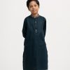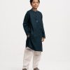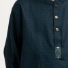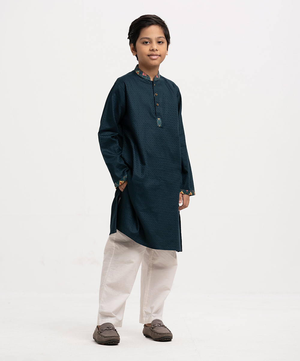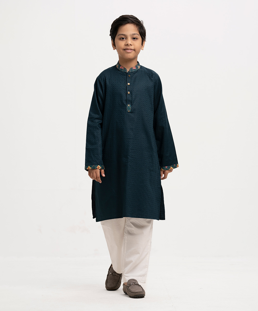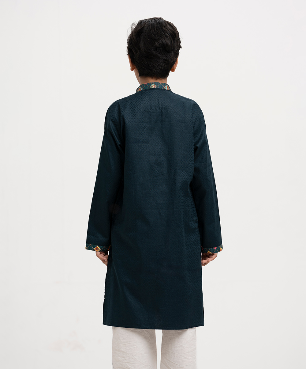 Kid boy’s panjabi in Jacquard fabric. Patchwork at mandarin collar, buttons placket & full sleeves. Inseam pockets.