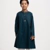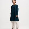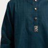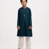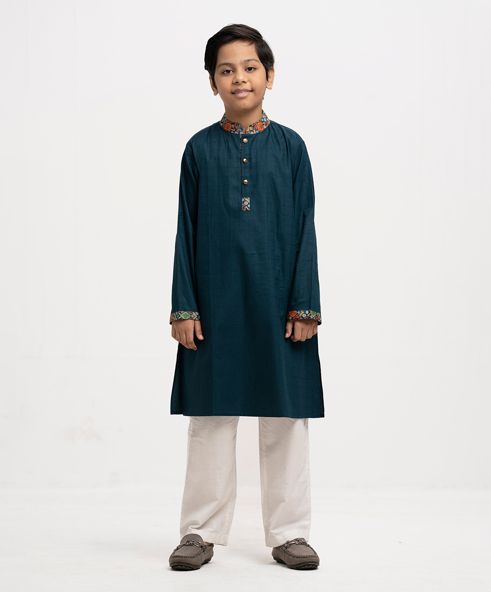 Kid boy’s panjabi in cotton jacquard fabric. Printed cotton fabric patch at mandarin collar, buttons placket & full sleeves cuff. Inseam pockets.