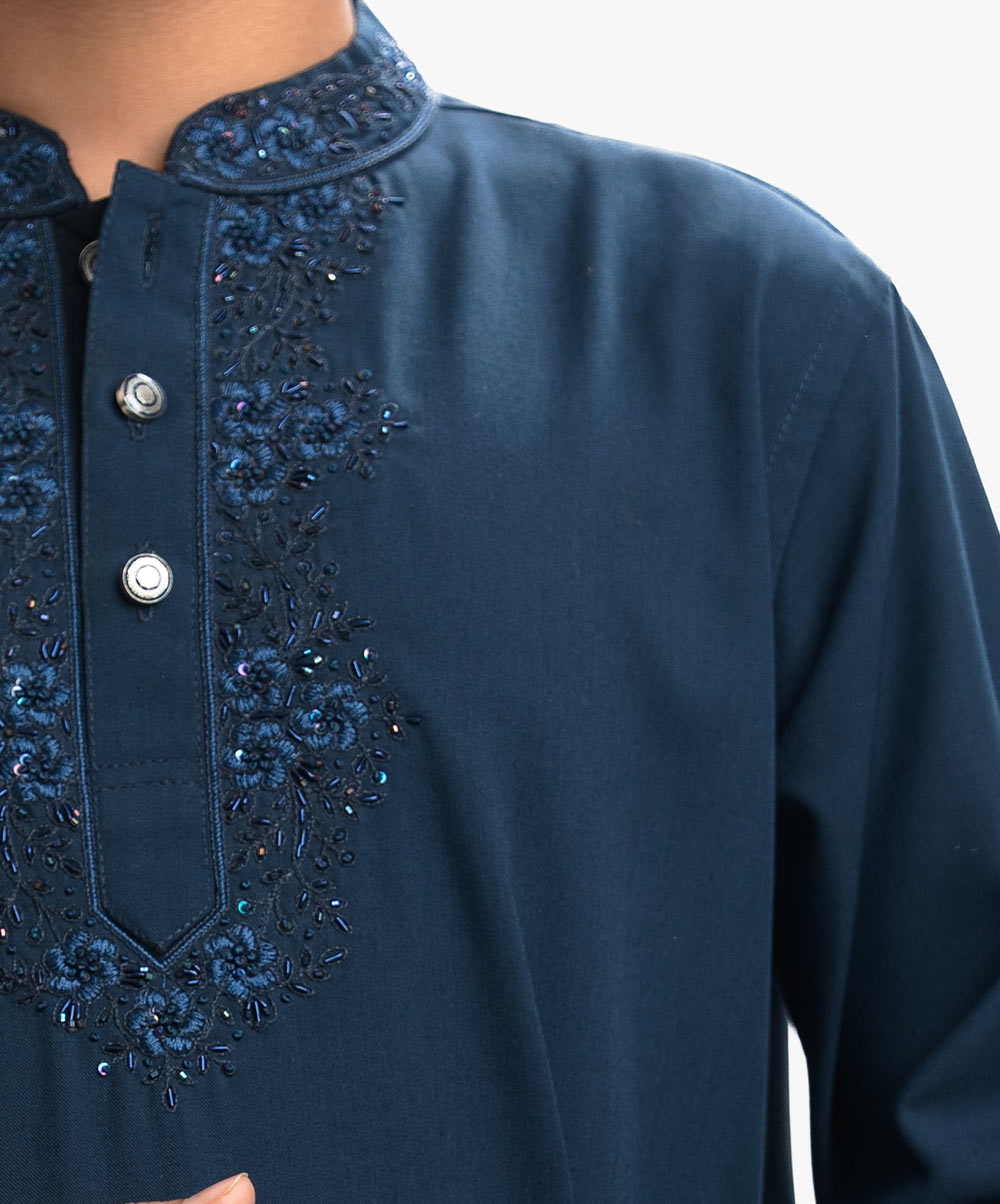Kids’ classic panjabi in blended fabric.Karchupi on the collar and placket.