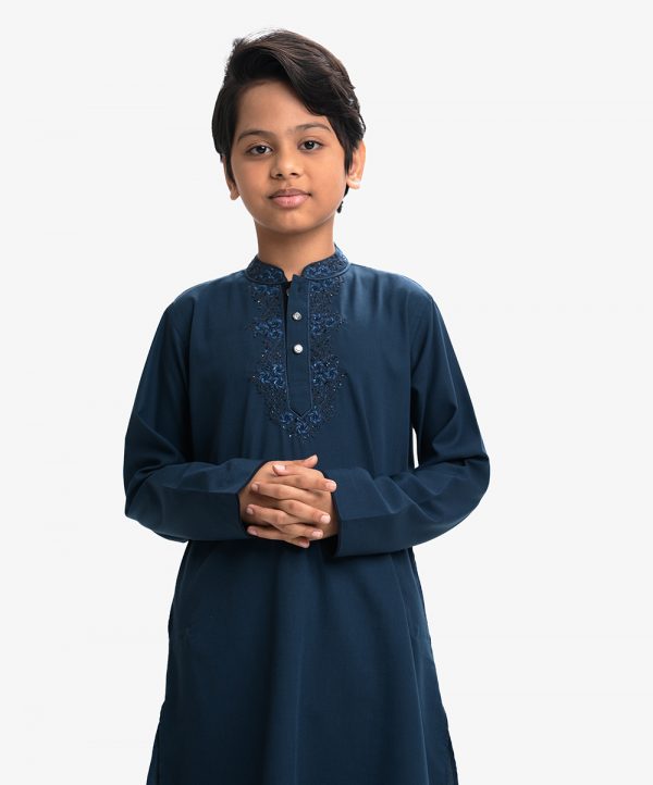 Kids’ classic panjabi in blended fabric.Karchupi on the collar and placket.