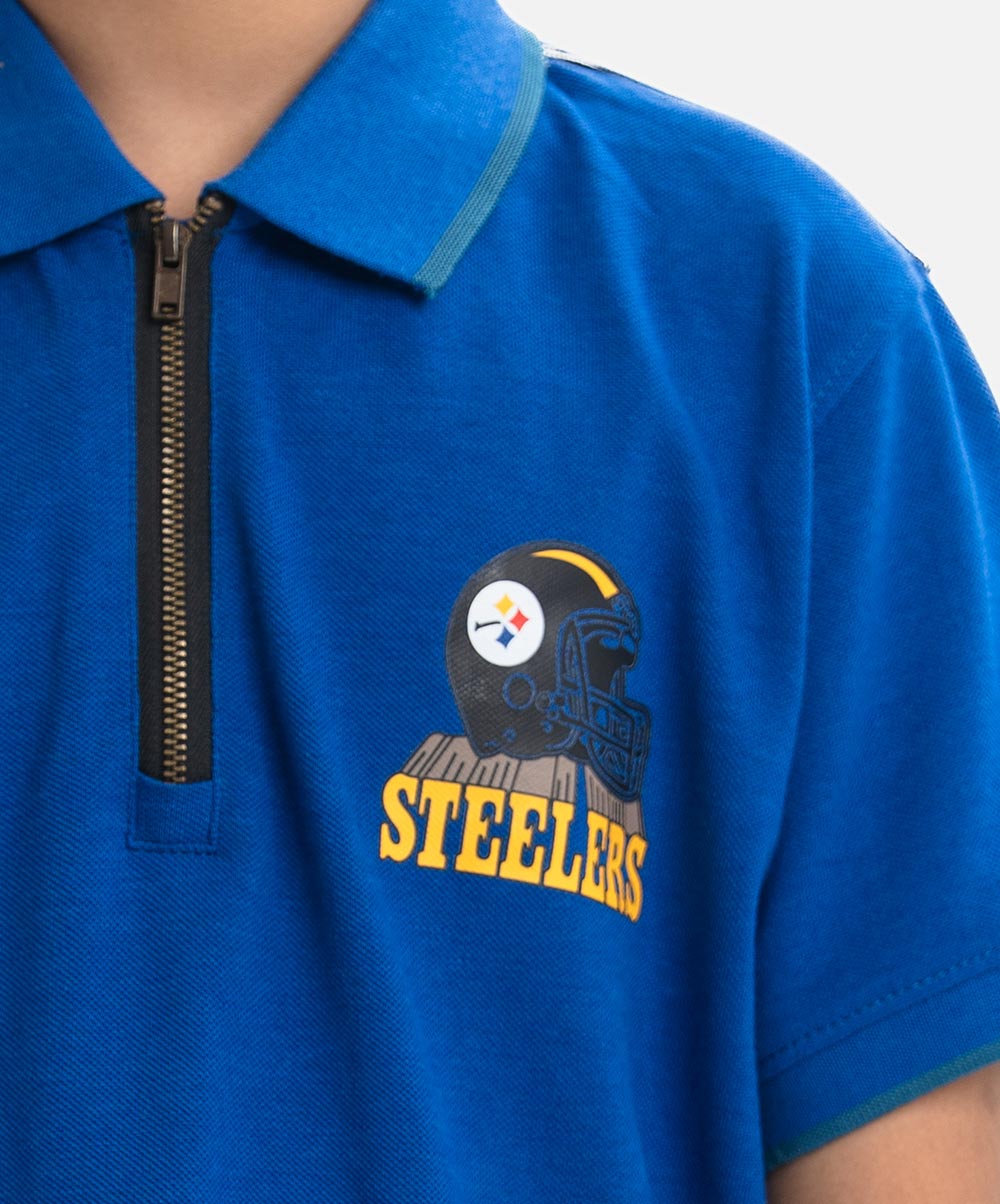 Short-sleeved polo shirt with classic rib collar in cotton-pique knit fabric. Front zip closure.