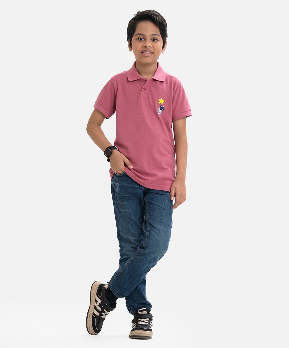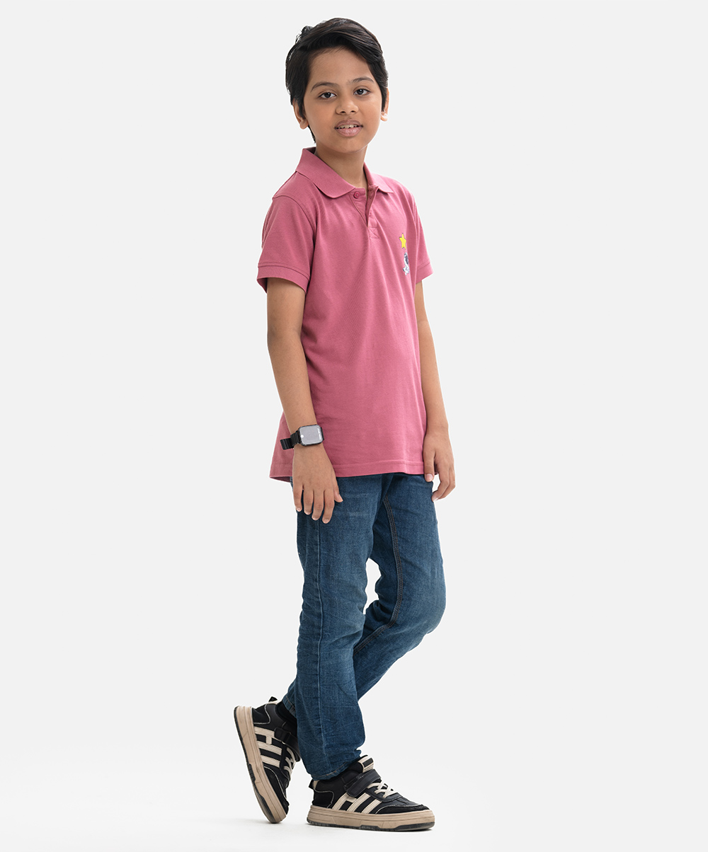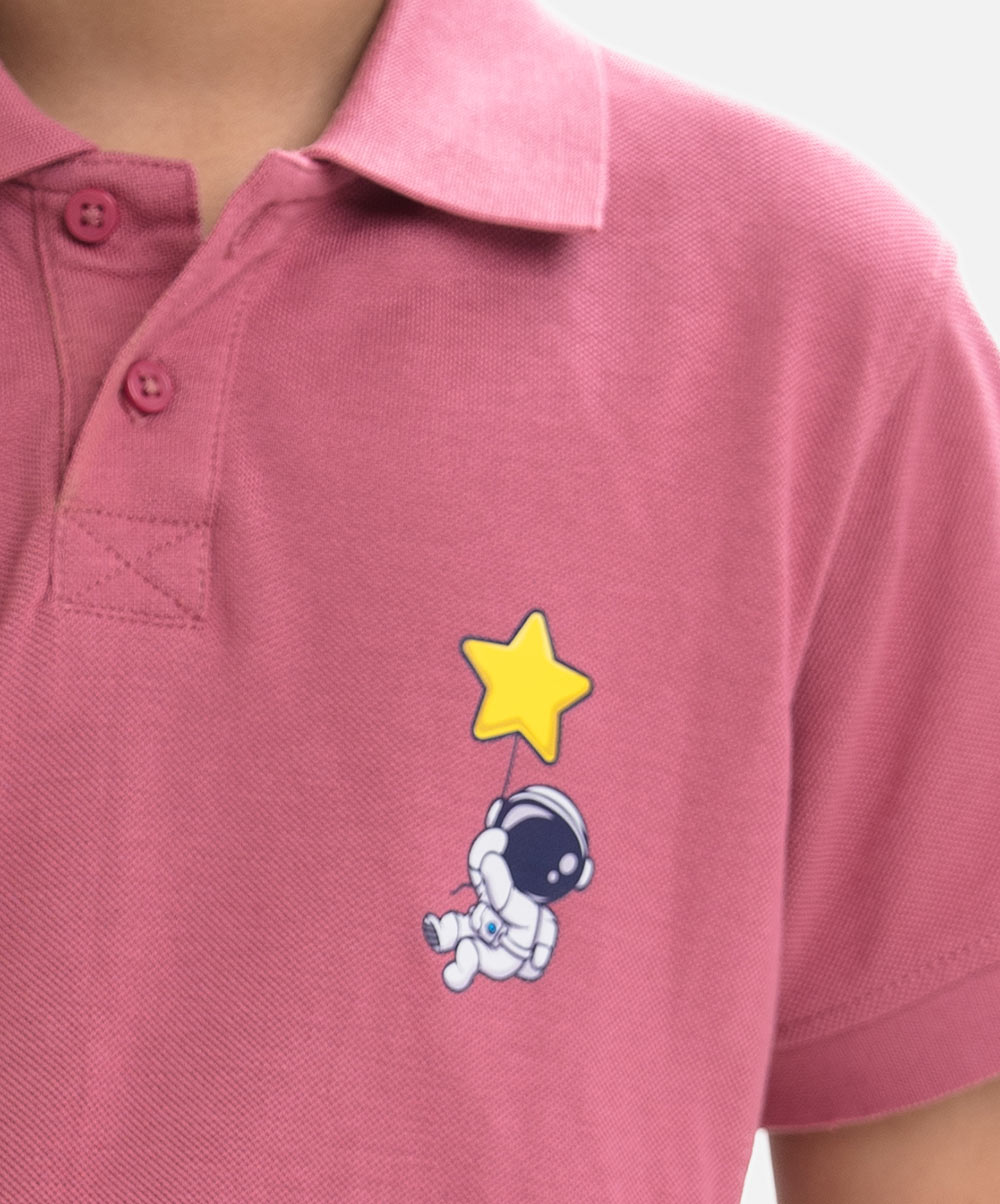 Kid boys Polo in cotton pique fabric. Classic collar, short sleeves and print at front.