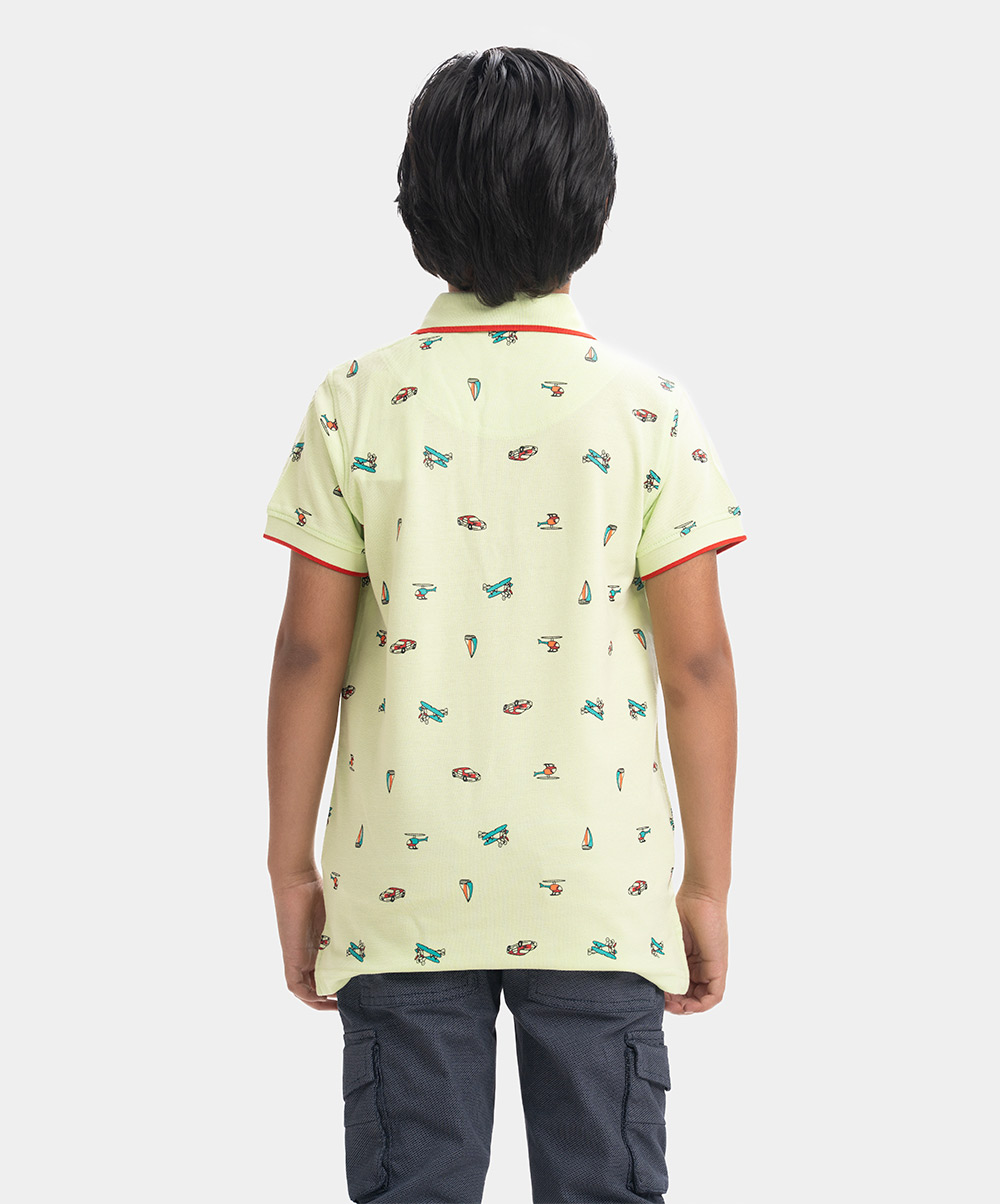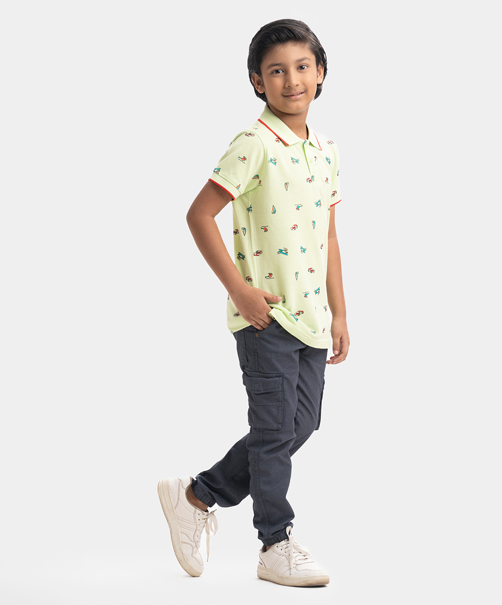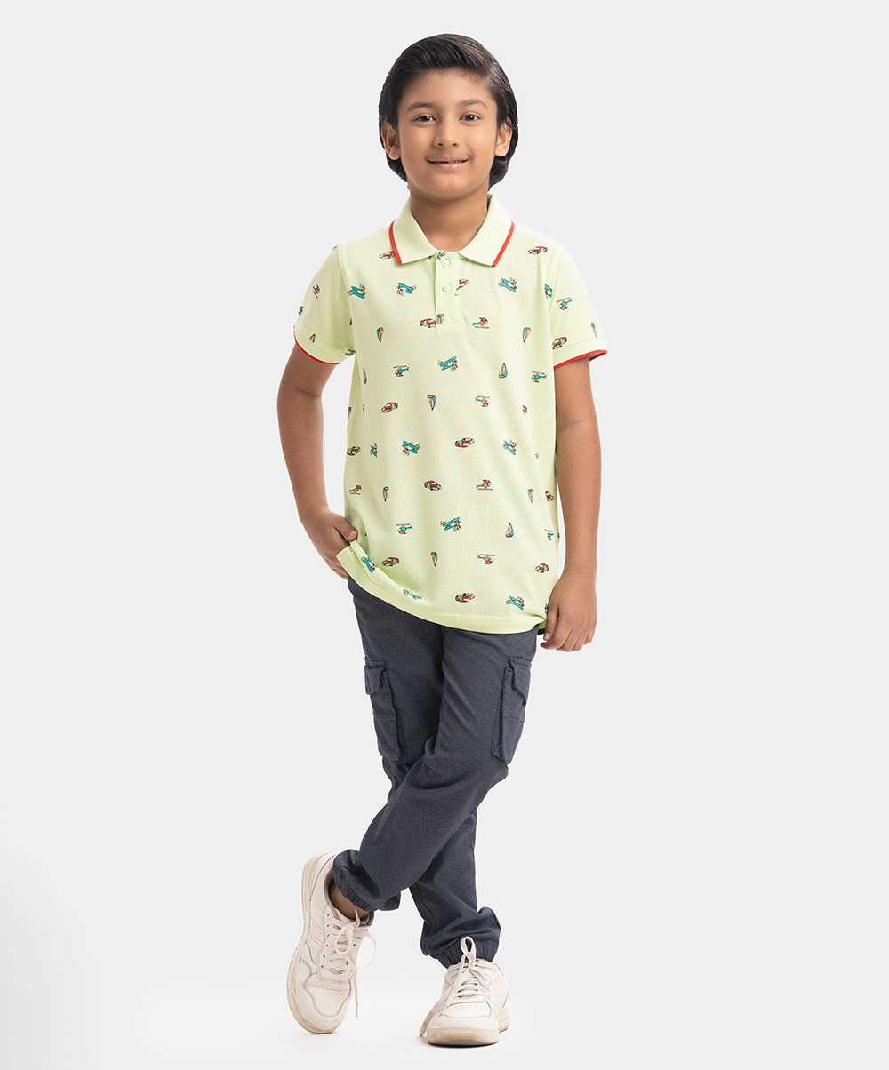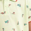 Kid boys Polo in cotton pique fabric. Classic collar, short sleeves and all-over vehicle printed.