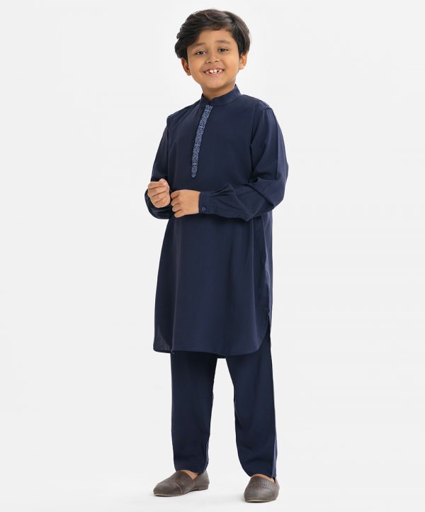 Kid boys panjabi set in viscose fabric. Mandarin collar, inseam pockets. Button fastening at the front and a viscose pajama.