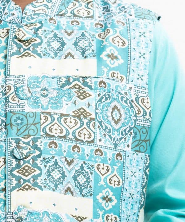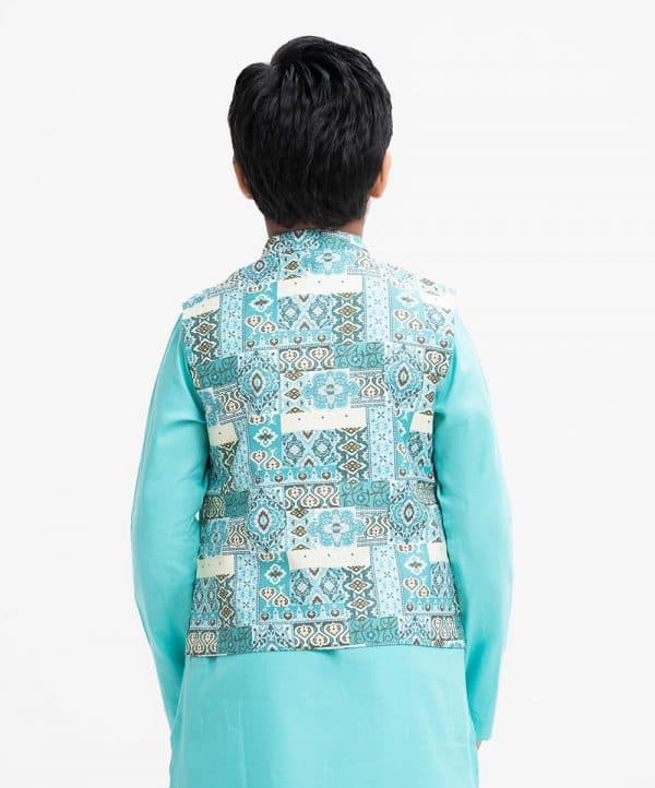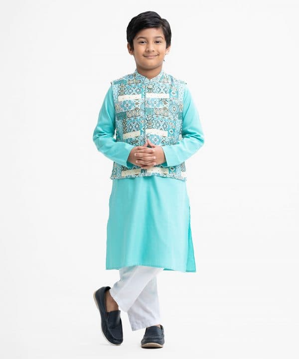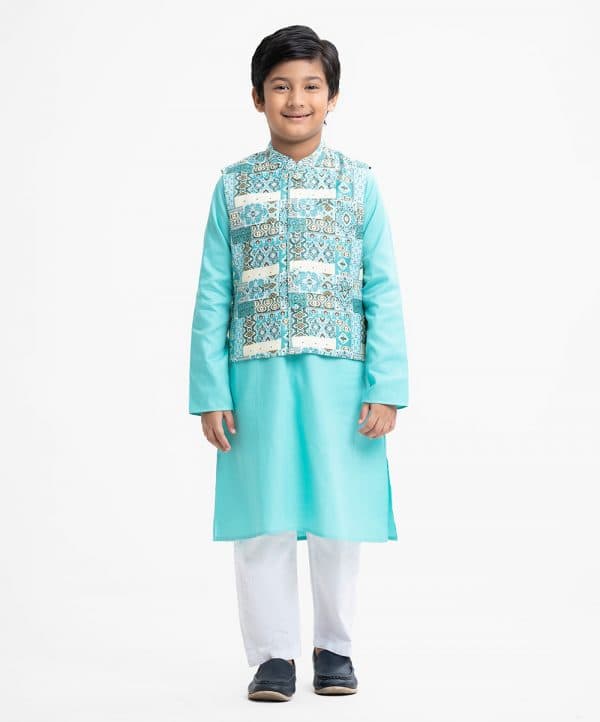Kid boys’ panjabi set in cotton-blended fabric. Mandarin collar, inseam pockets and long sleeves panjabi. Paired with a cotton-blended waistcoat and cotton pant.