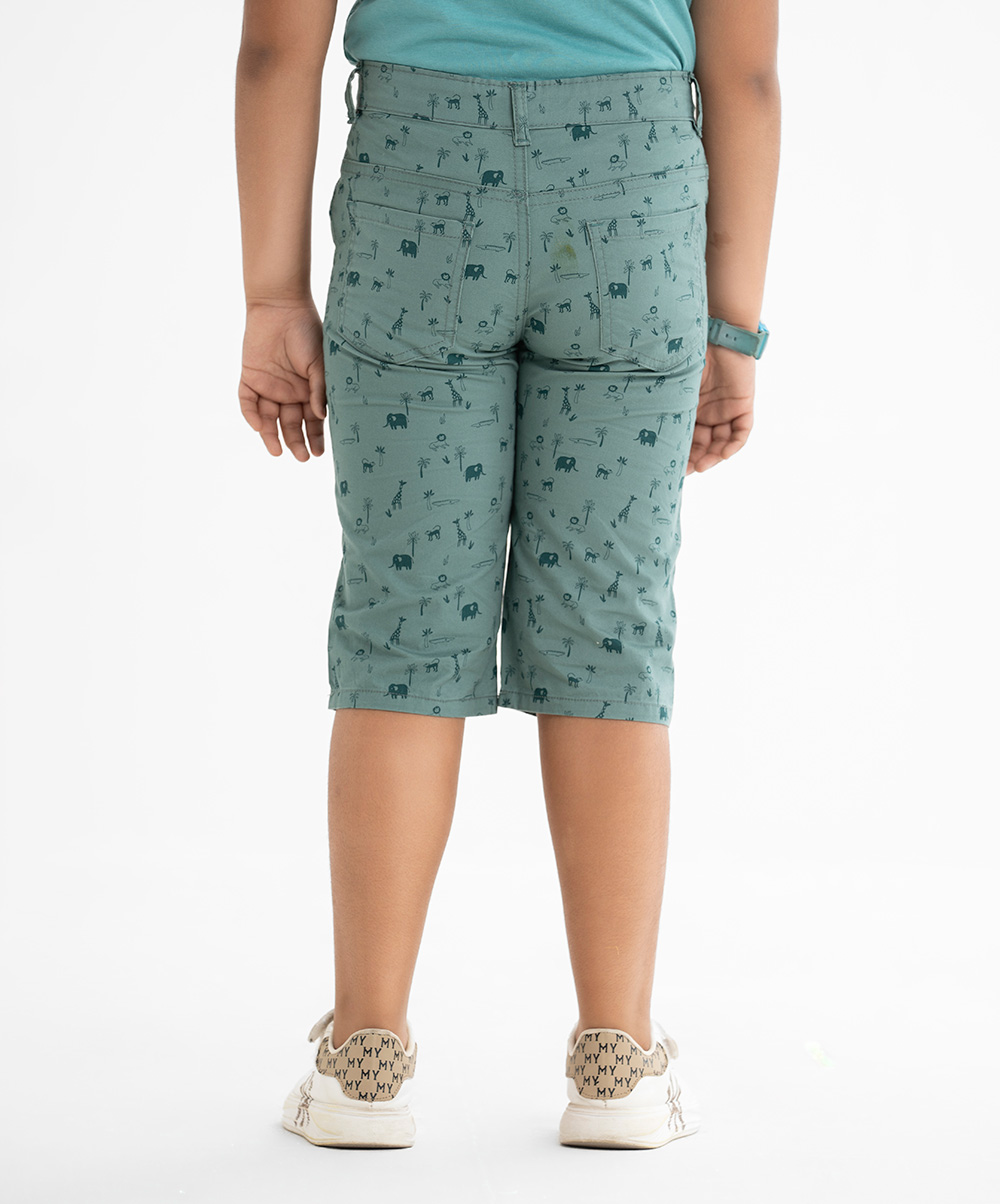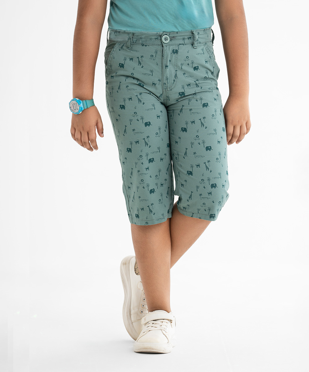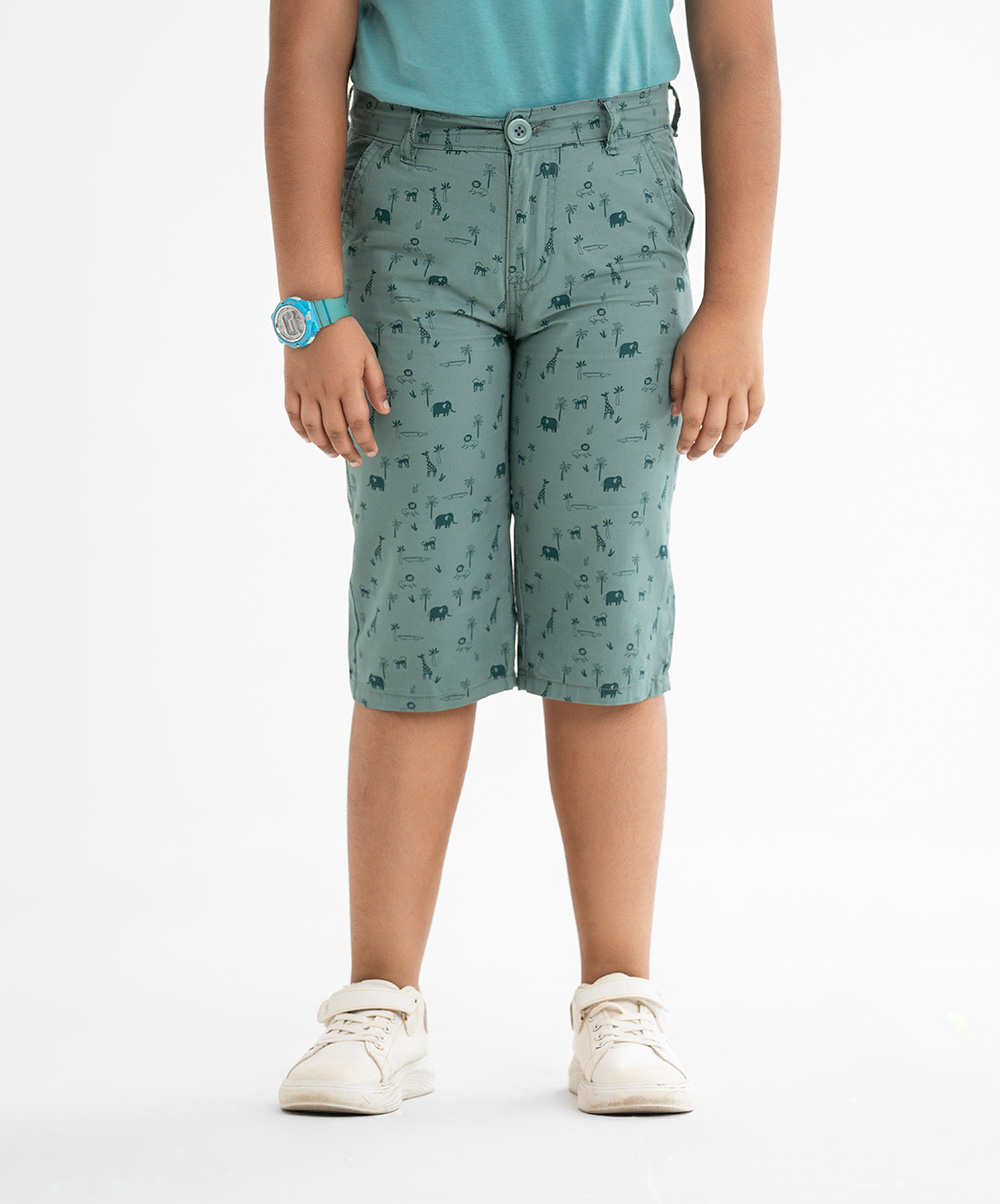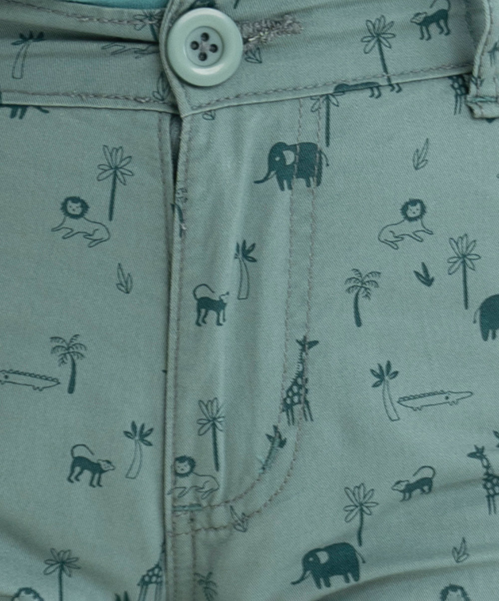 Kid boys printed three-quarter pant in cotton fabric. Zipperfly and a button fastening at the front. Two side pockets and two patch pockets on the back.