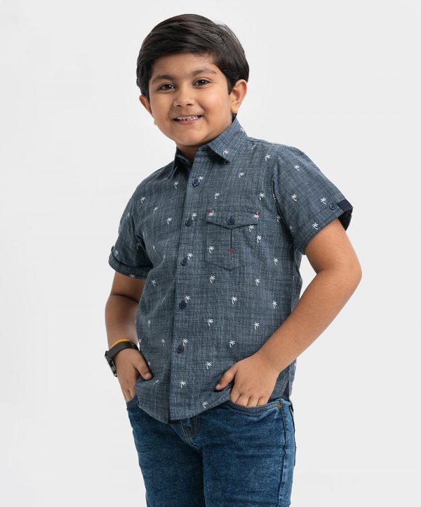 Kid boys short-sleeved casual shirt in printed cotton fabric. Classic collar and a chest pocket.