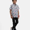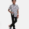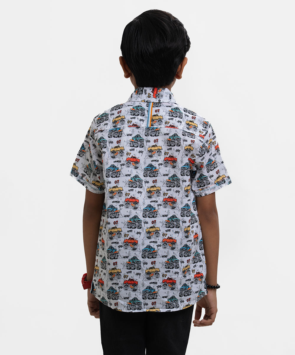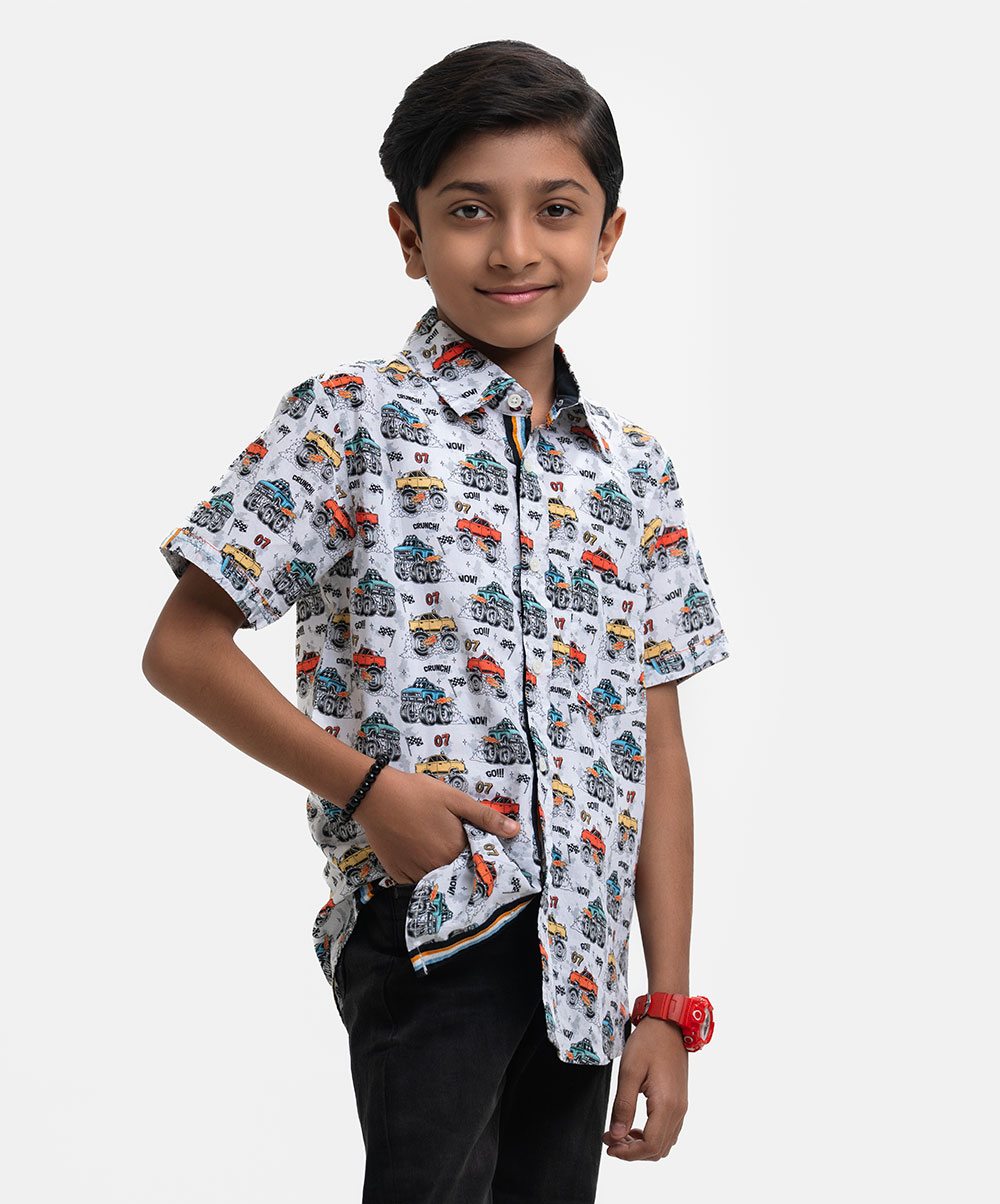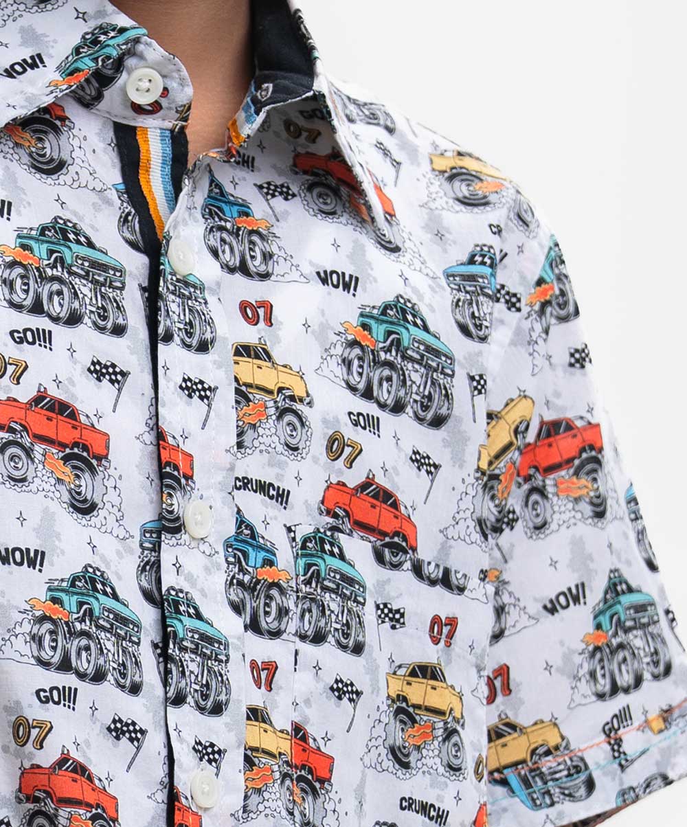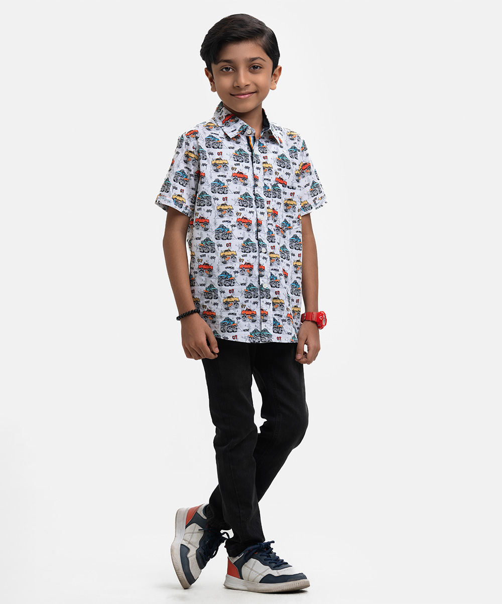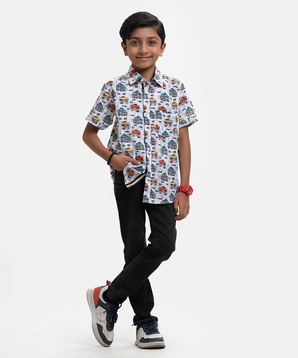 Kid boys short-sleeved casual shirt in printed cotton fabric. Classic collar and a chest pocket.