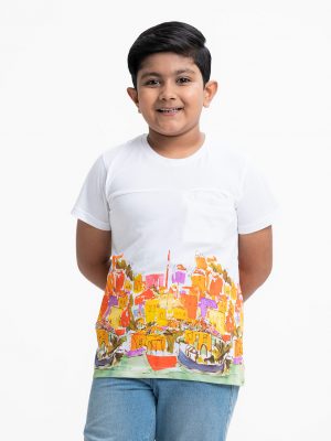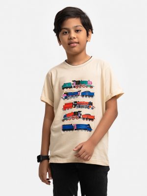 Kid boys t-shirt in cotton single jersey fabric. Round neck, short sleeves. Colorful print at front.