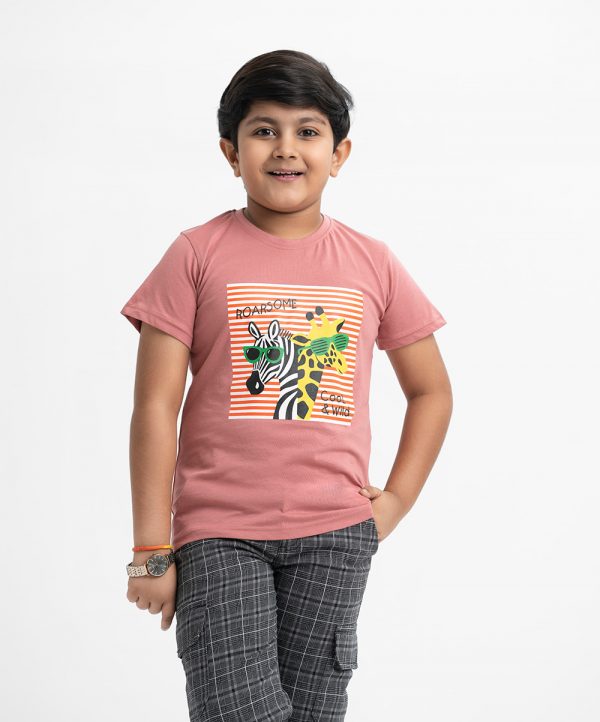 Kid boys’ t-shirt in cotton single jersey kint fabric. Crew neck, short sleeves, and print on the chest.