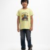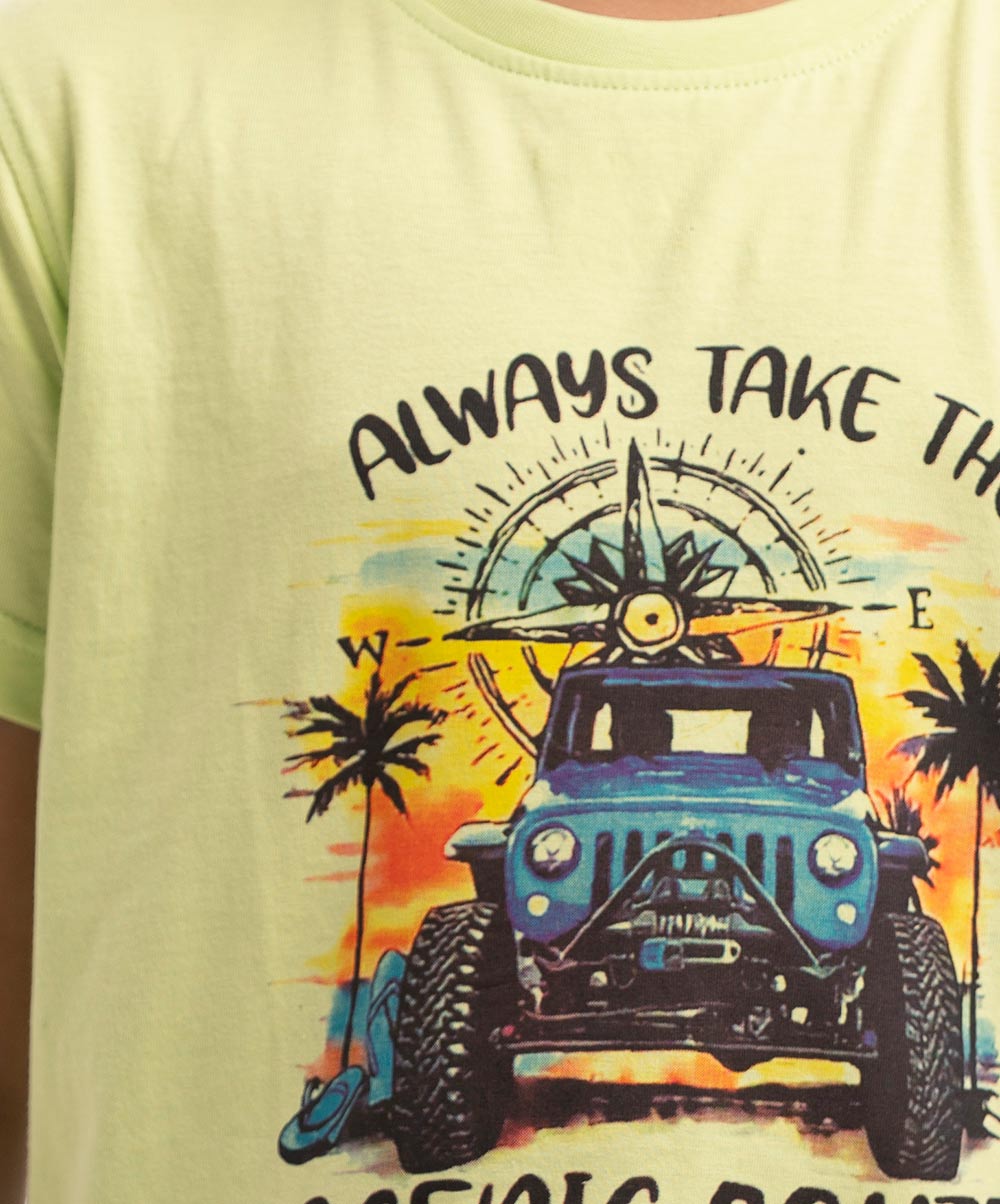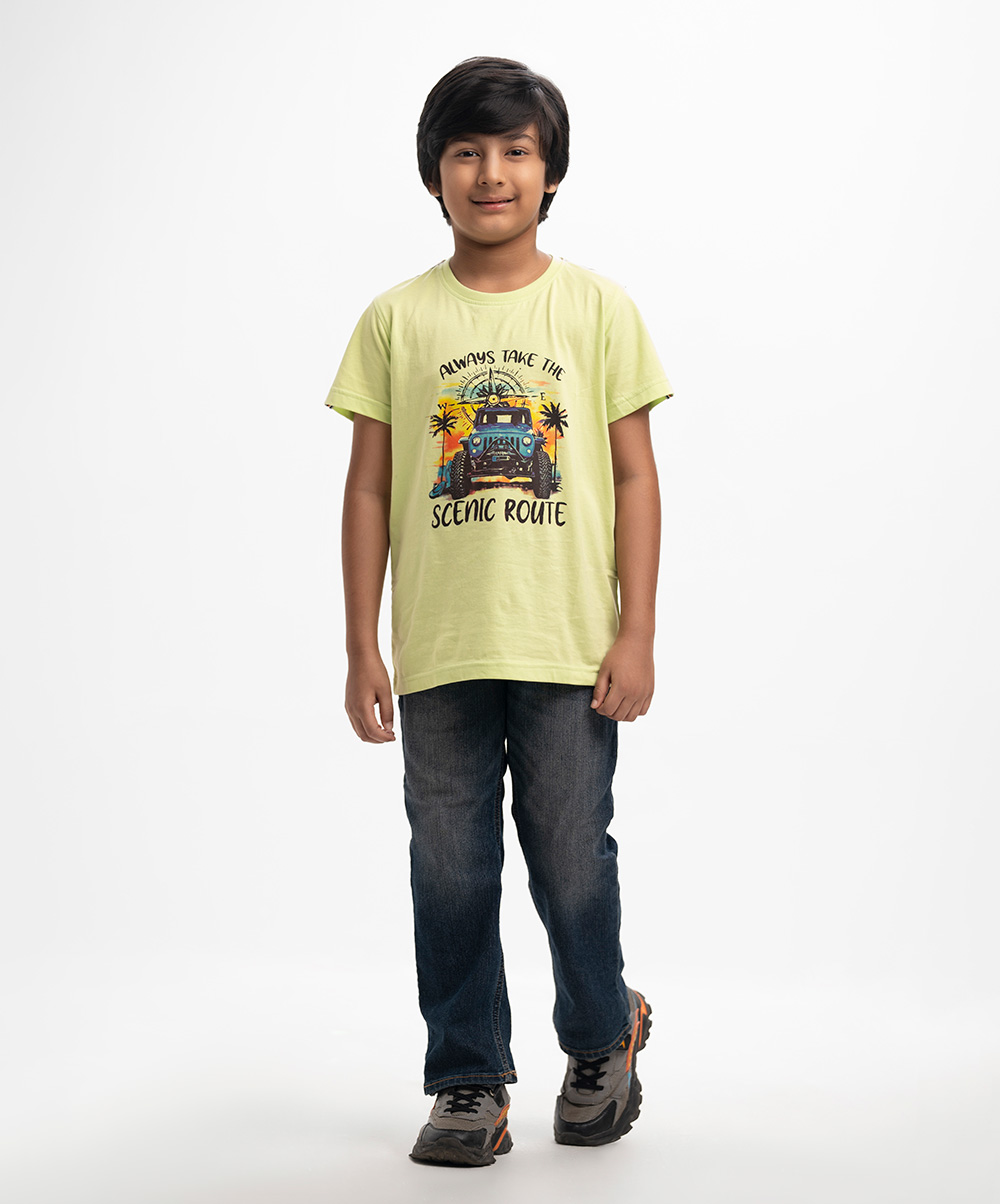 Boys’ short-sleeved t-shirt in cotton single jersey fabric. Twill tape attached over the shoulders. Printed on the chest.