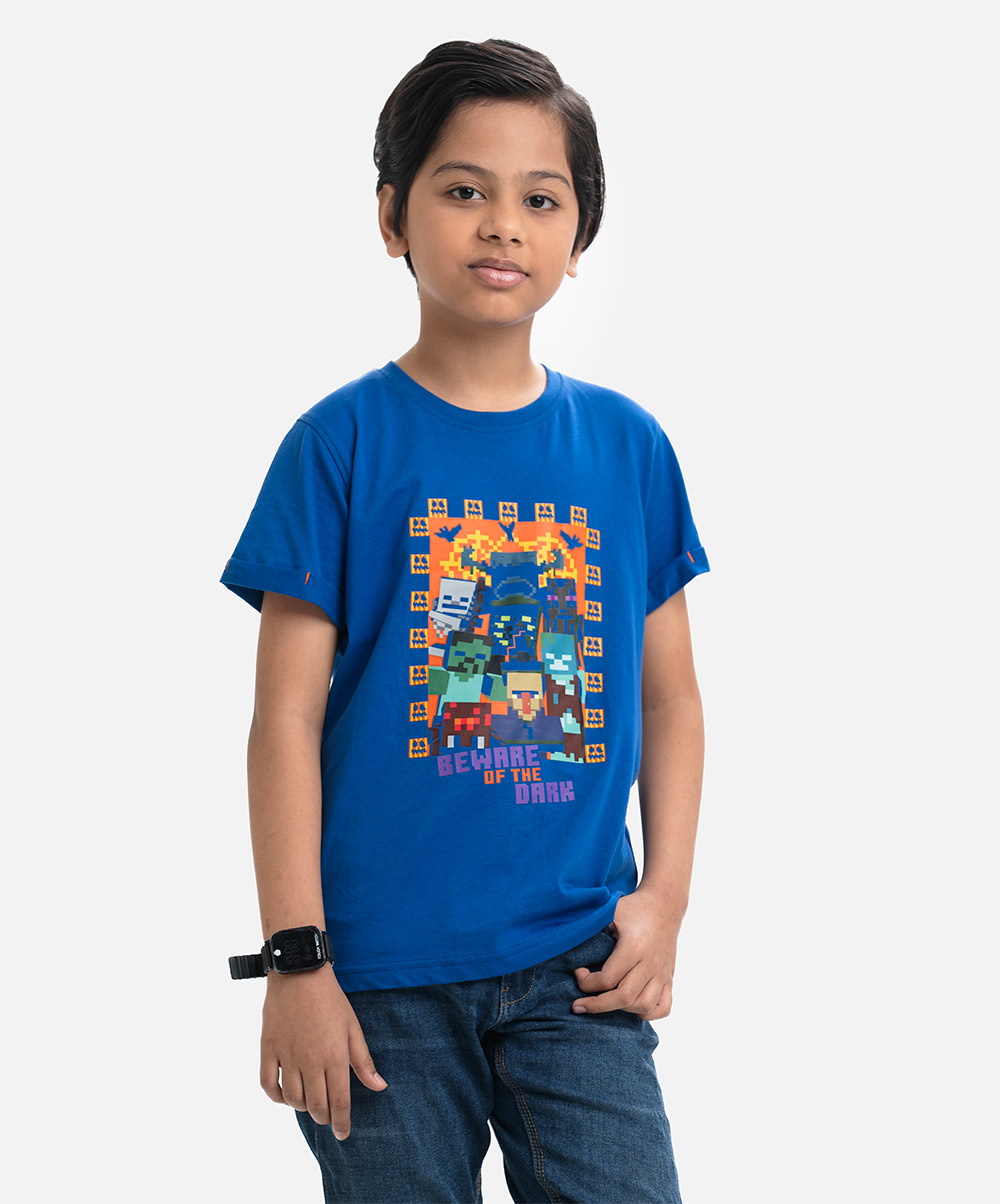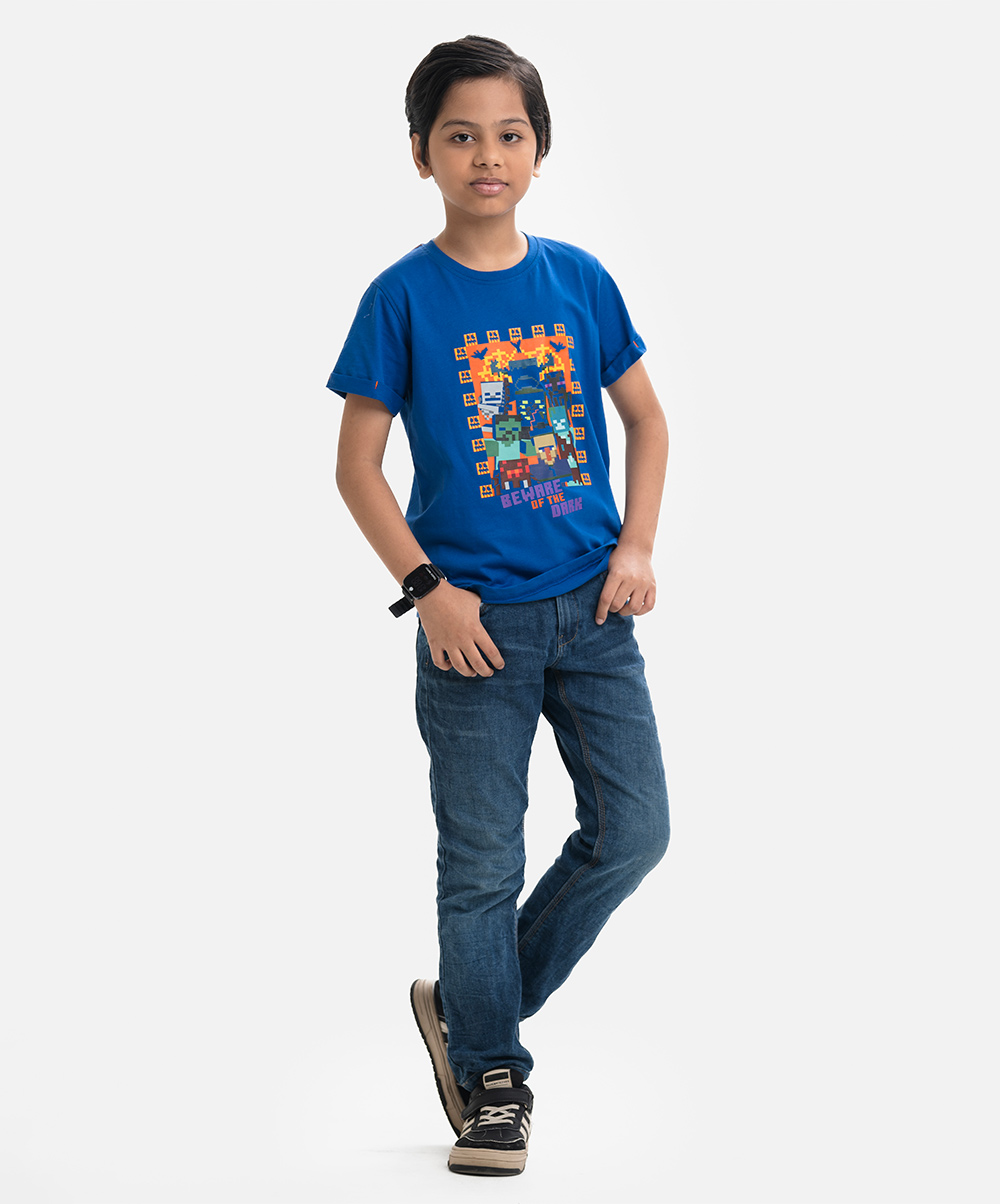 Kid boys t-shirt in cotton single jersey fabric. Round neck, short sleeves. Print at the front.