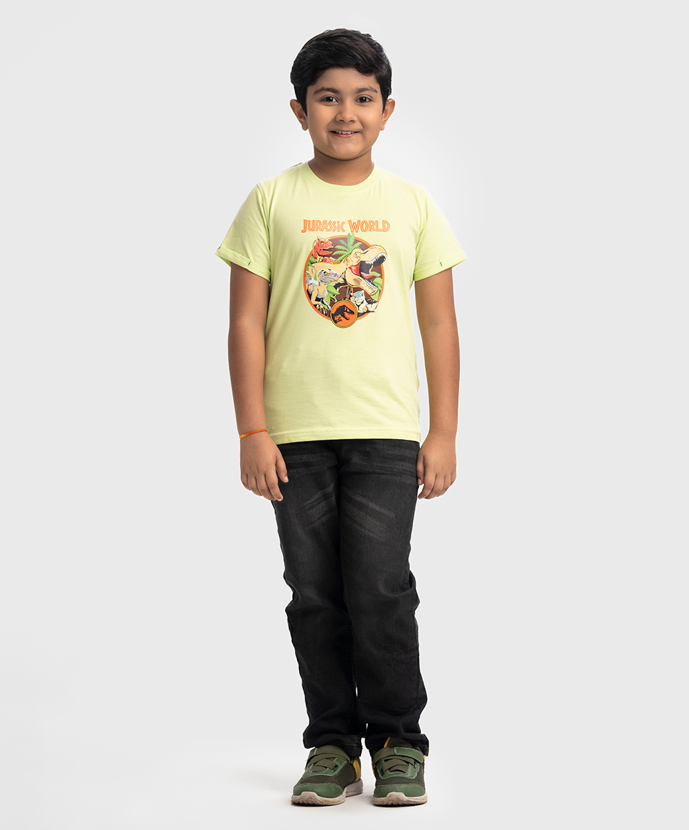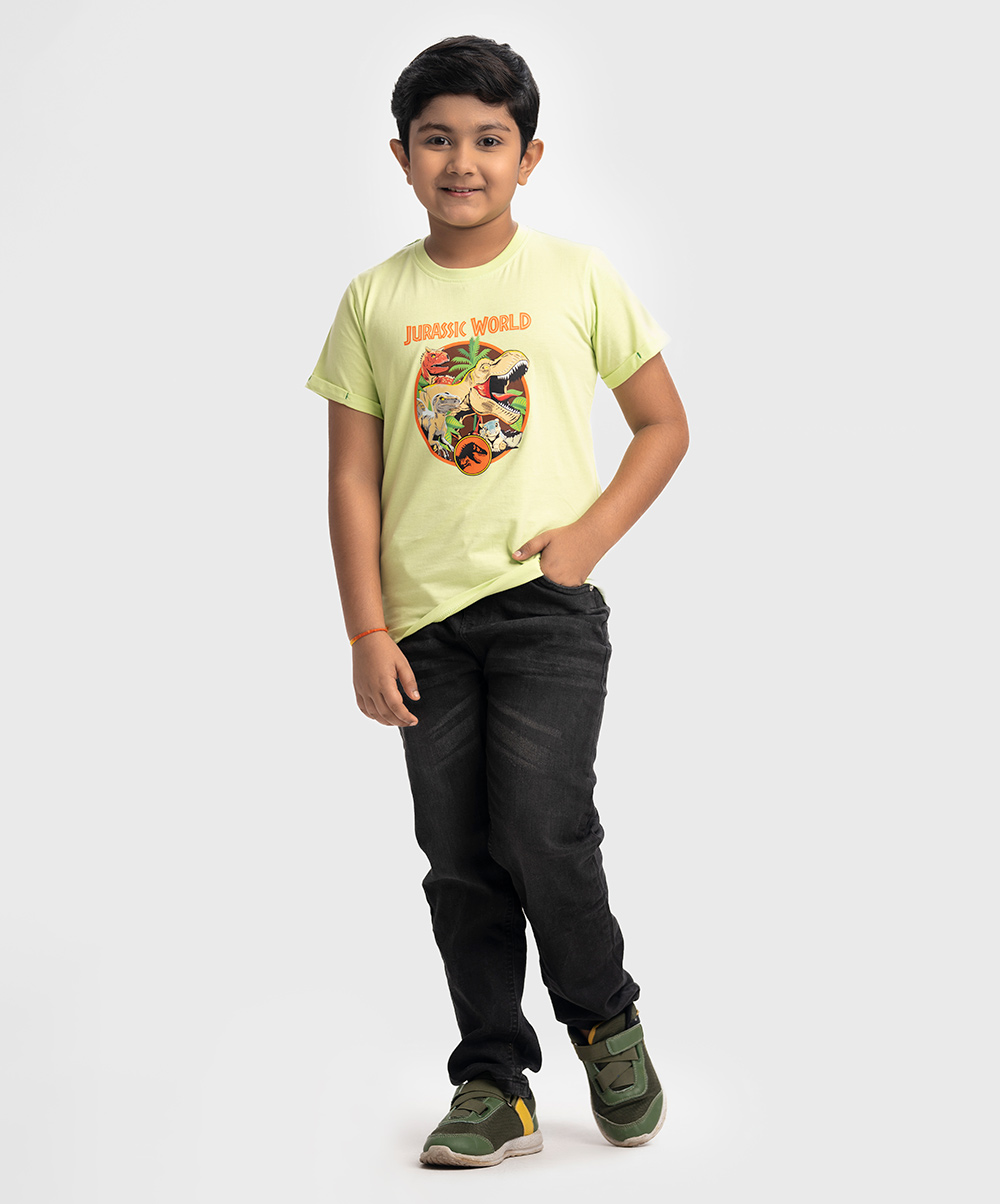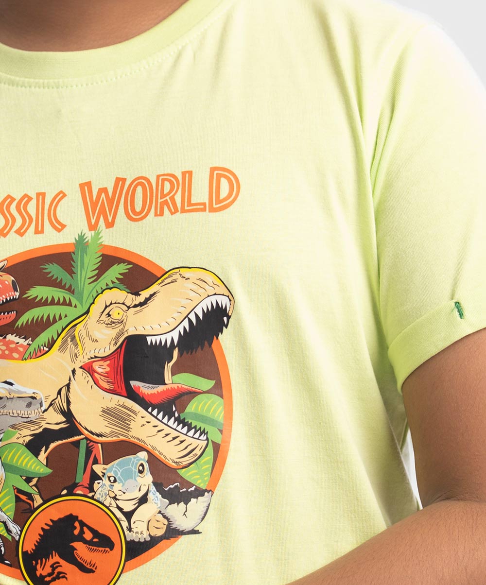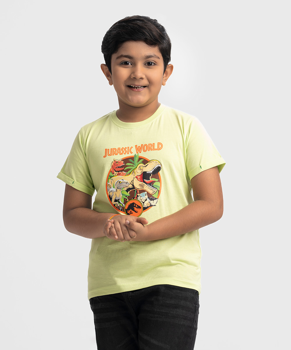 Kid boys t-shirt in cotton single jersey fabric. Round neck, short sleeves. Jurassic World print at the front.