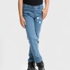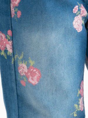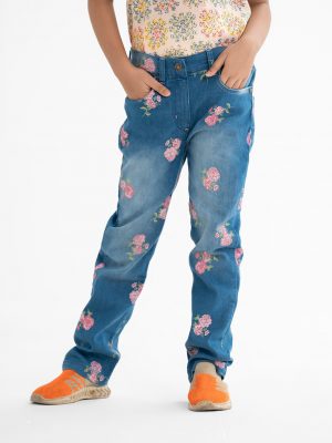 Kid girls heart printed long pants in denim fabric. Consean elasticated waist with button fastening. Five utility pockets at front and back.