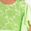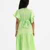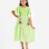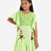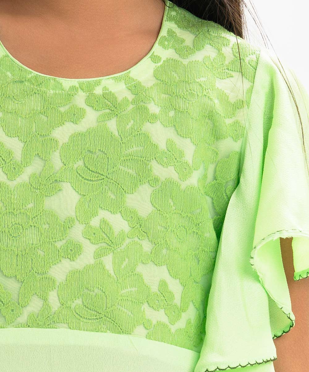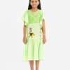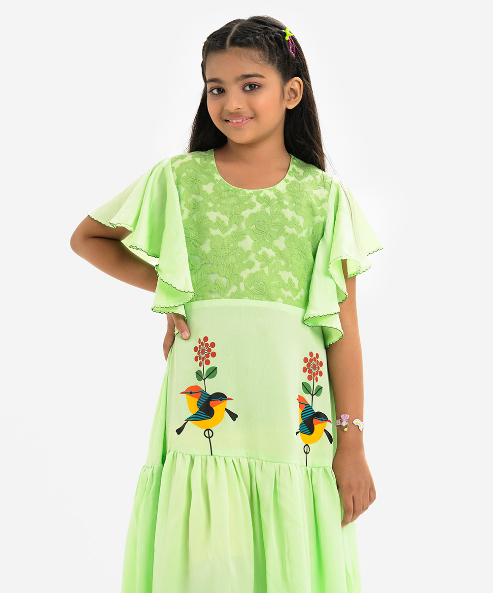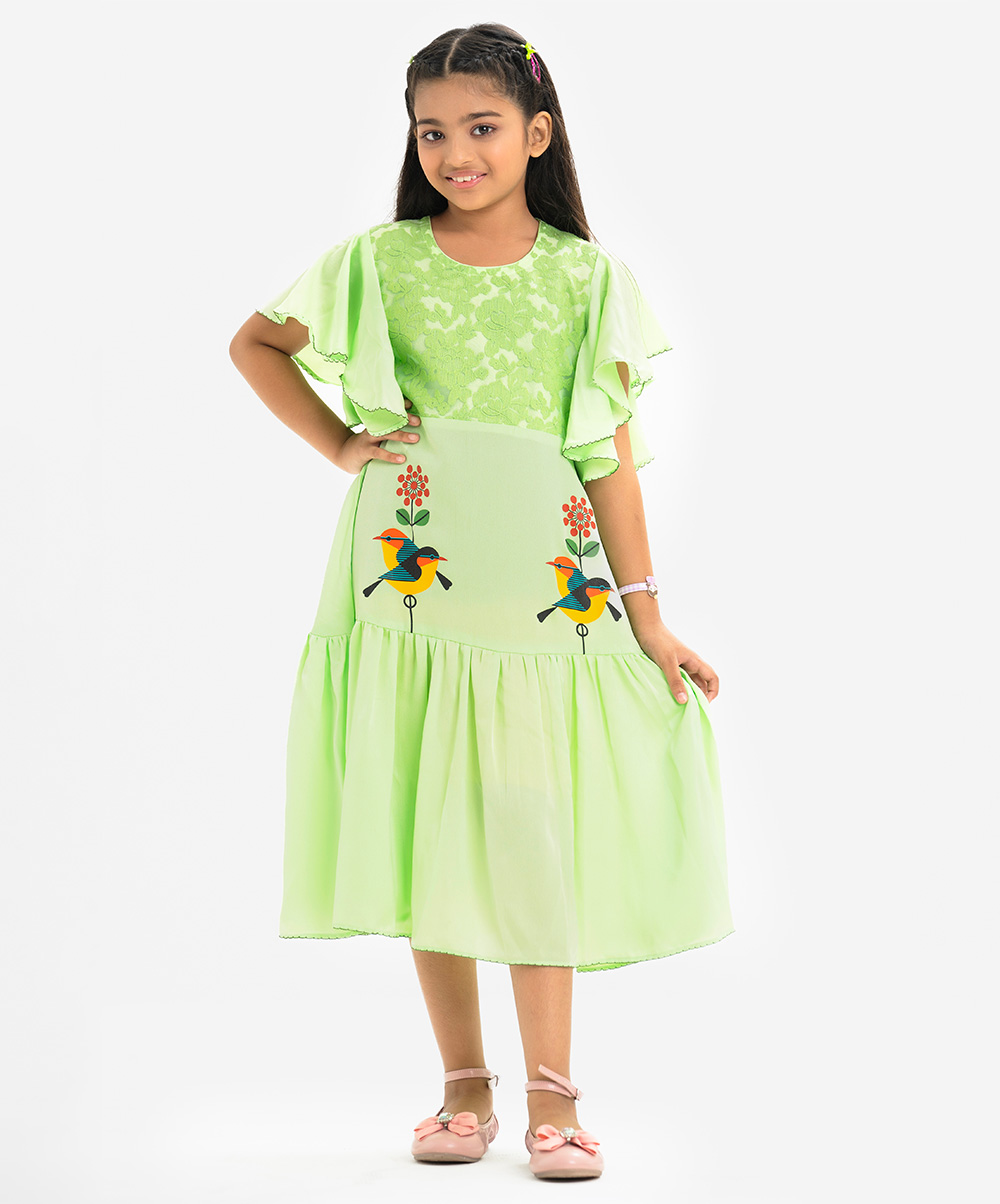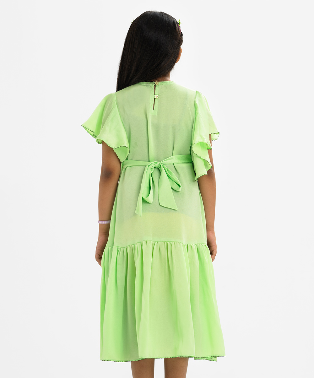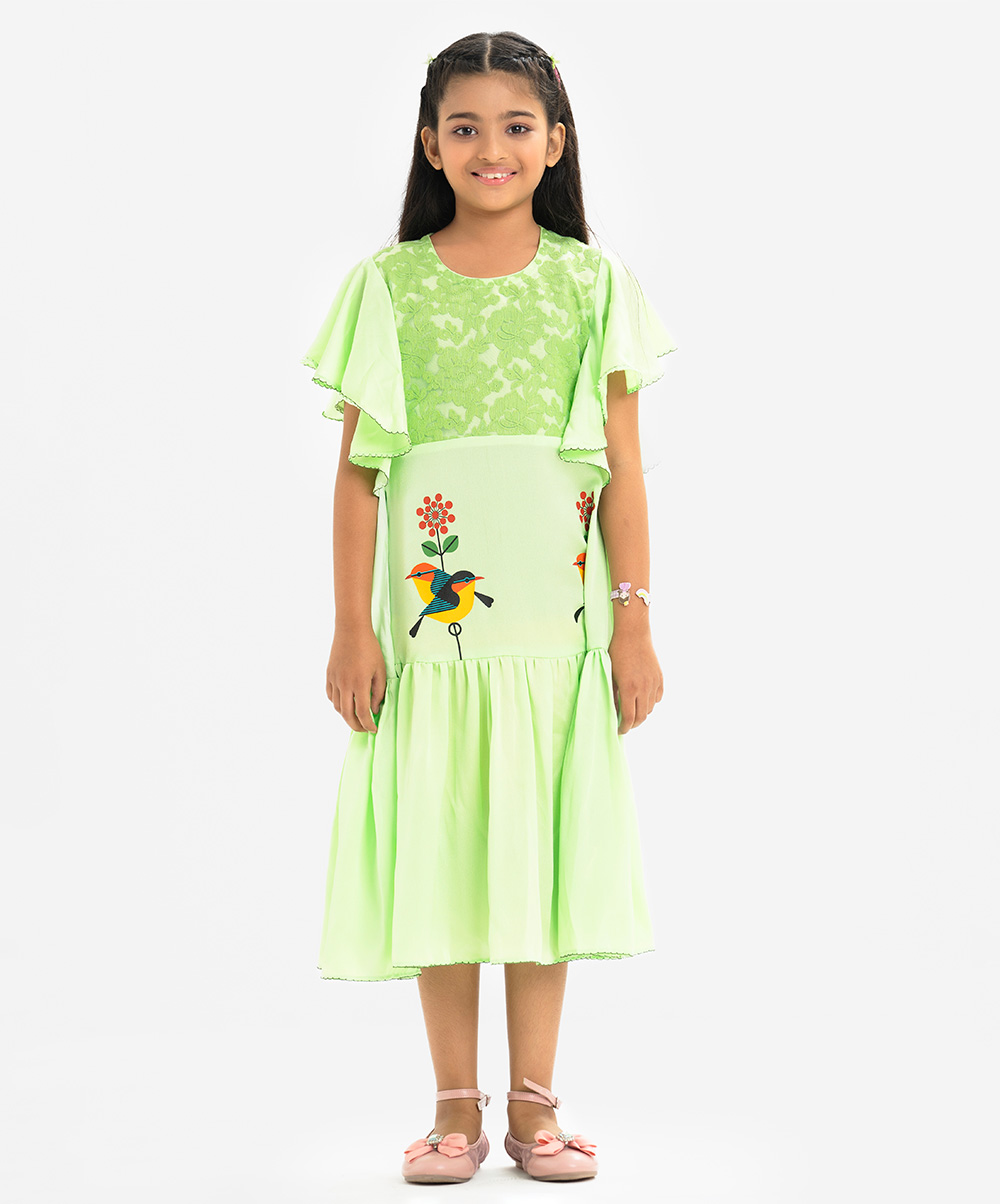 Kid girl’s A-line frock in crepe fabric. Round neck, butterfly sleeved. Attached the patch at the front and waistbelt.