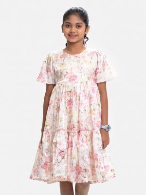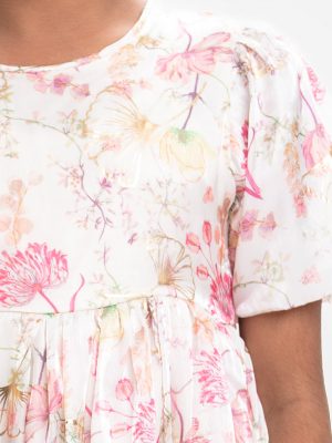 Classic gathered Frock in printed Satin Georgette fabric. Designed with contrast cut and sew patch on neck and hemline. Round neck, cap sleeves and waist belts at both sides. Viscose lining in half body.