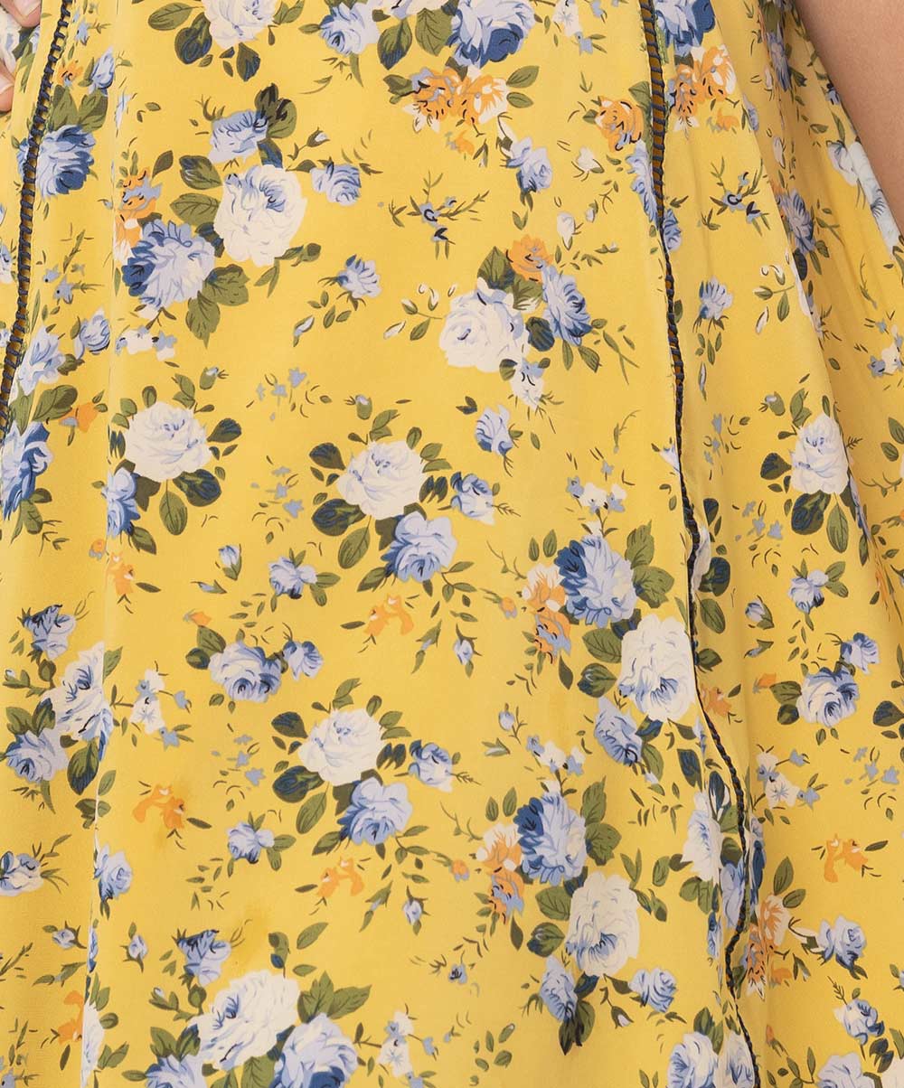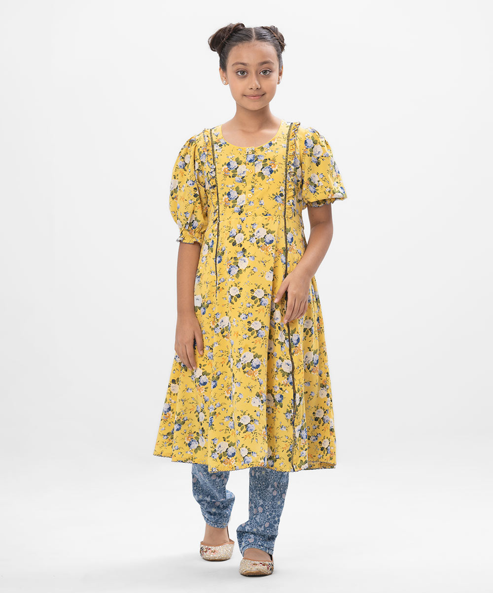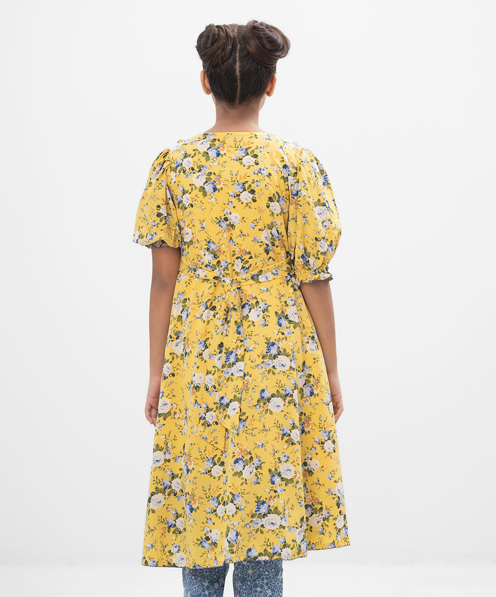 Yellow A-line frock in printed Georgette fabric. Features a round neck with buttons opening at the front and puff sleeves. Lace and frill detailing at the front. Viscose lining in full-body.