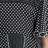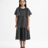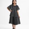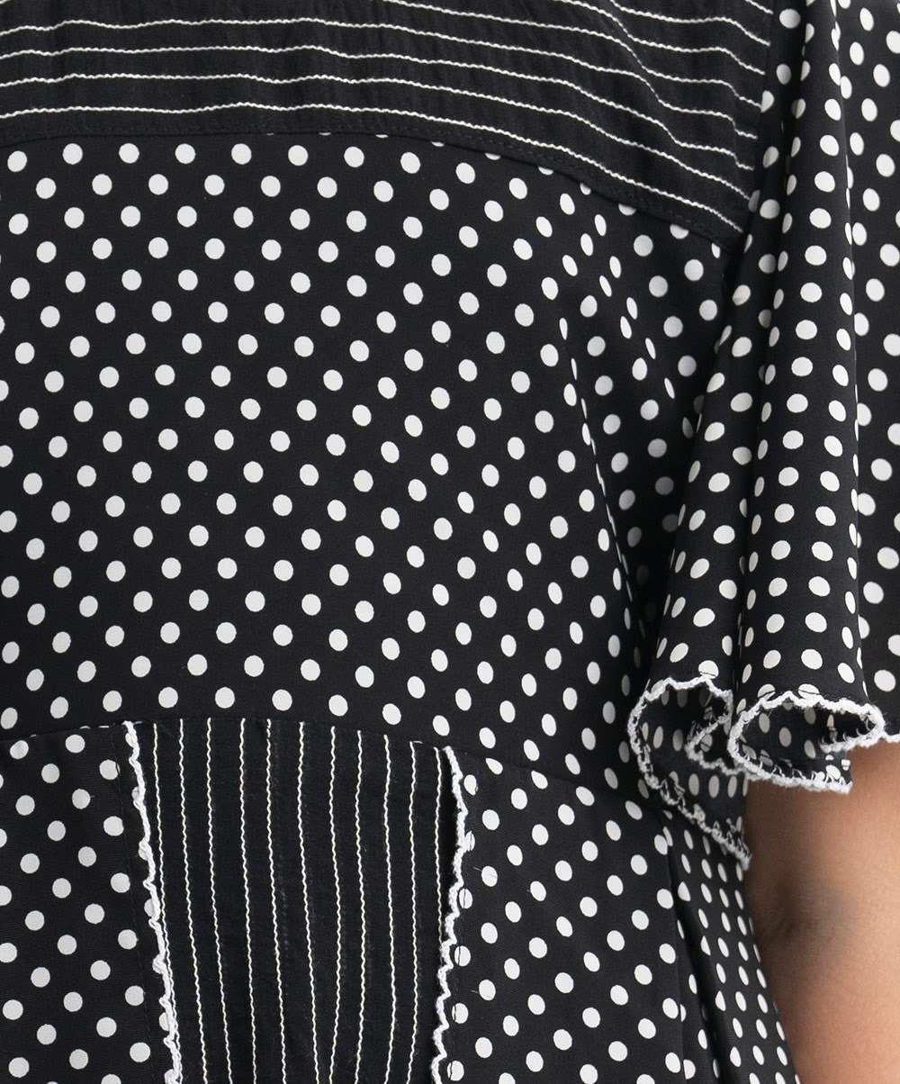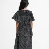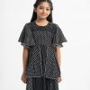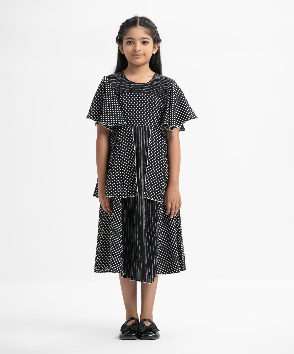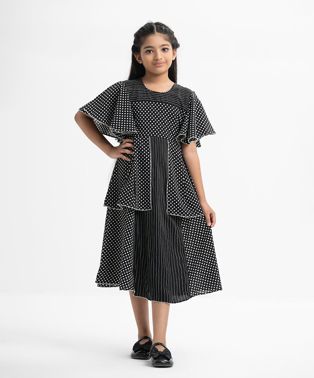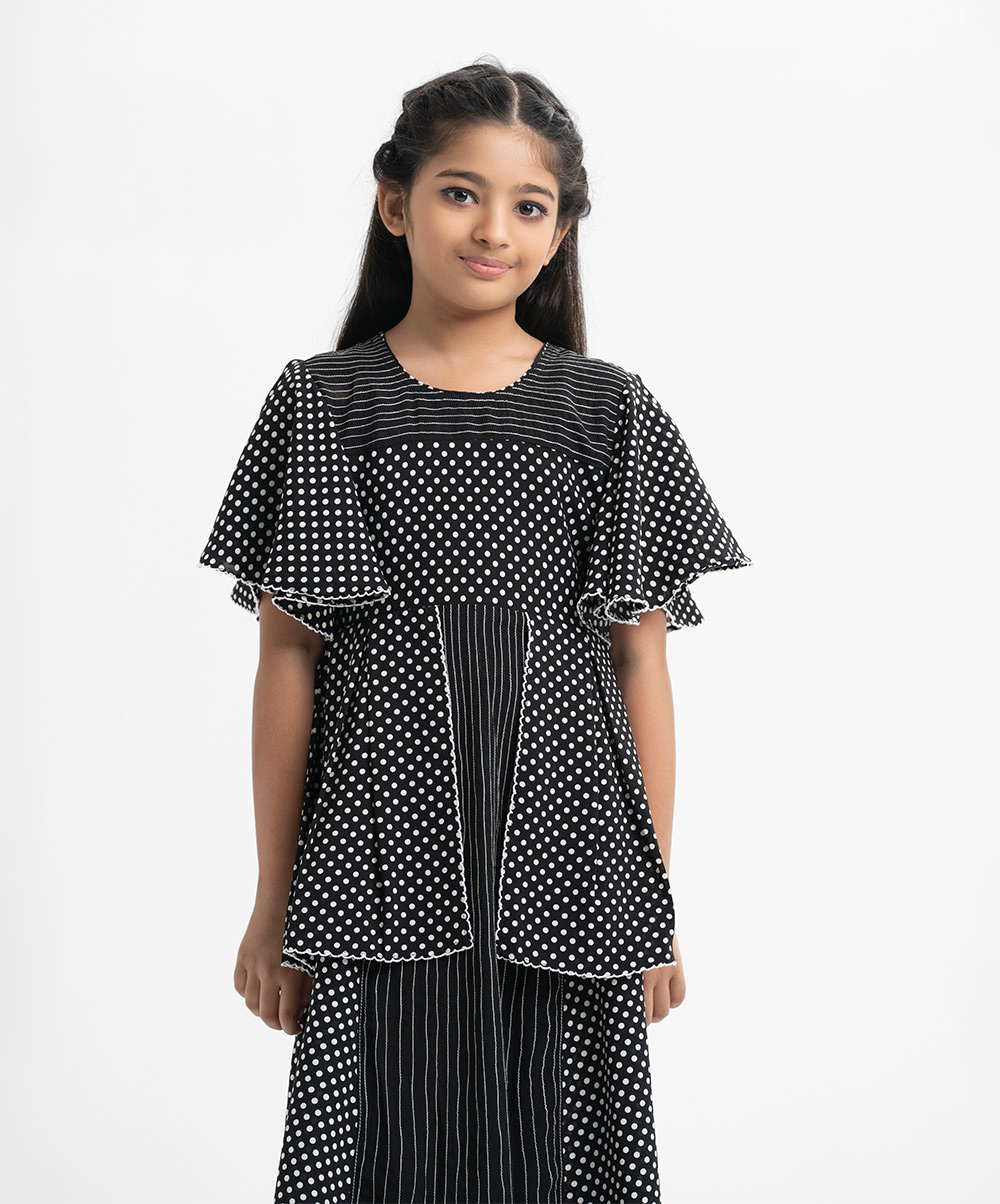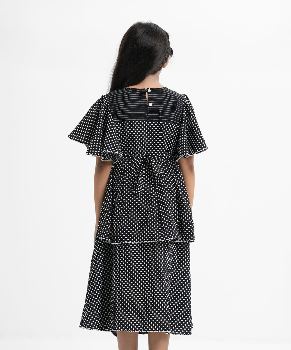 Kid girls frock in polka dot printed georgette fabric with half body viscose lining. Butterfly sleeves, line stitching at front and tie-cord at waistline.