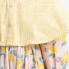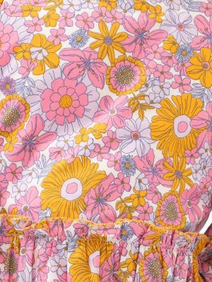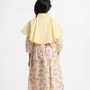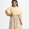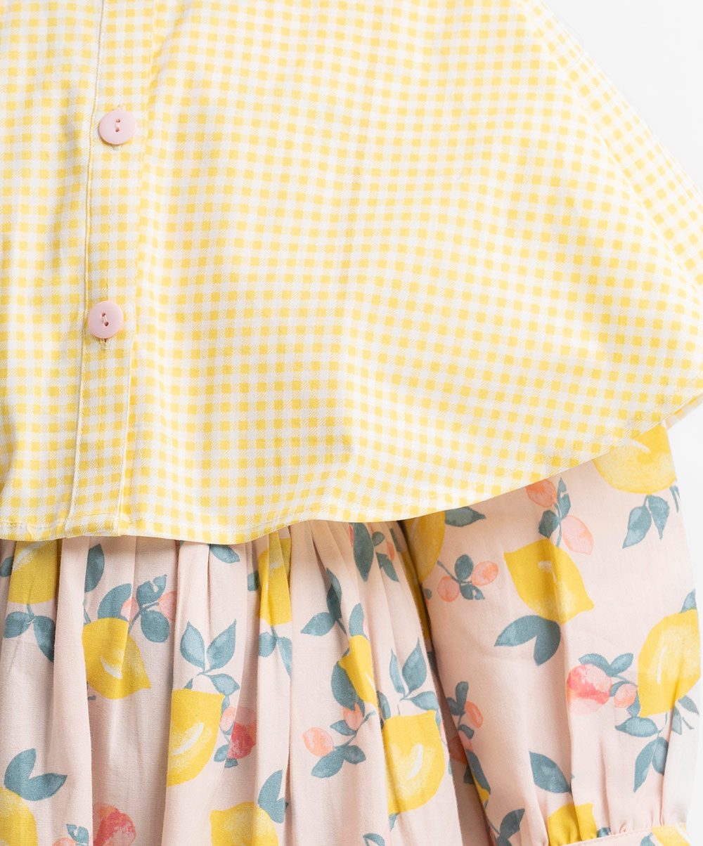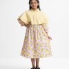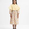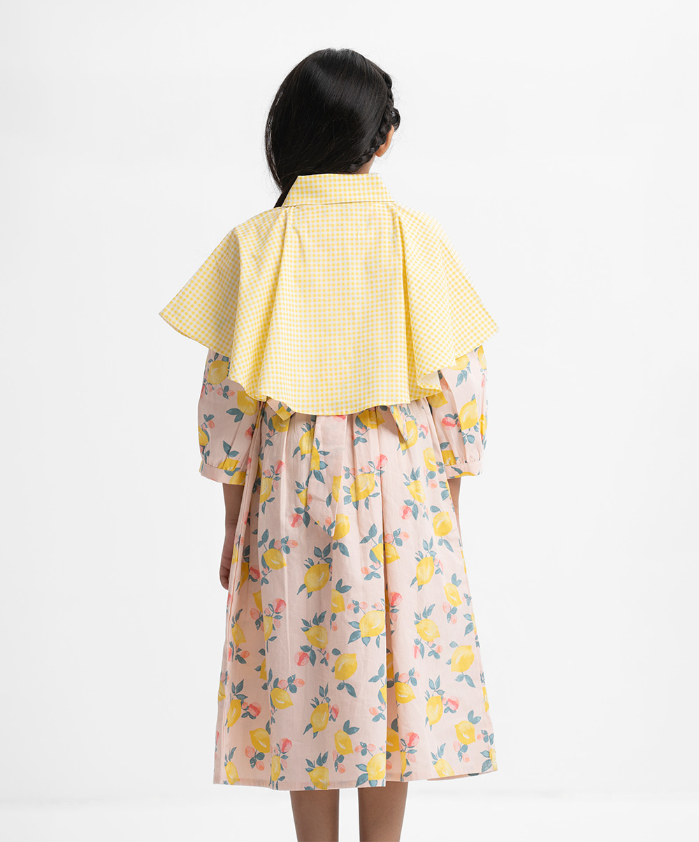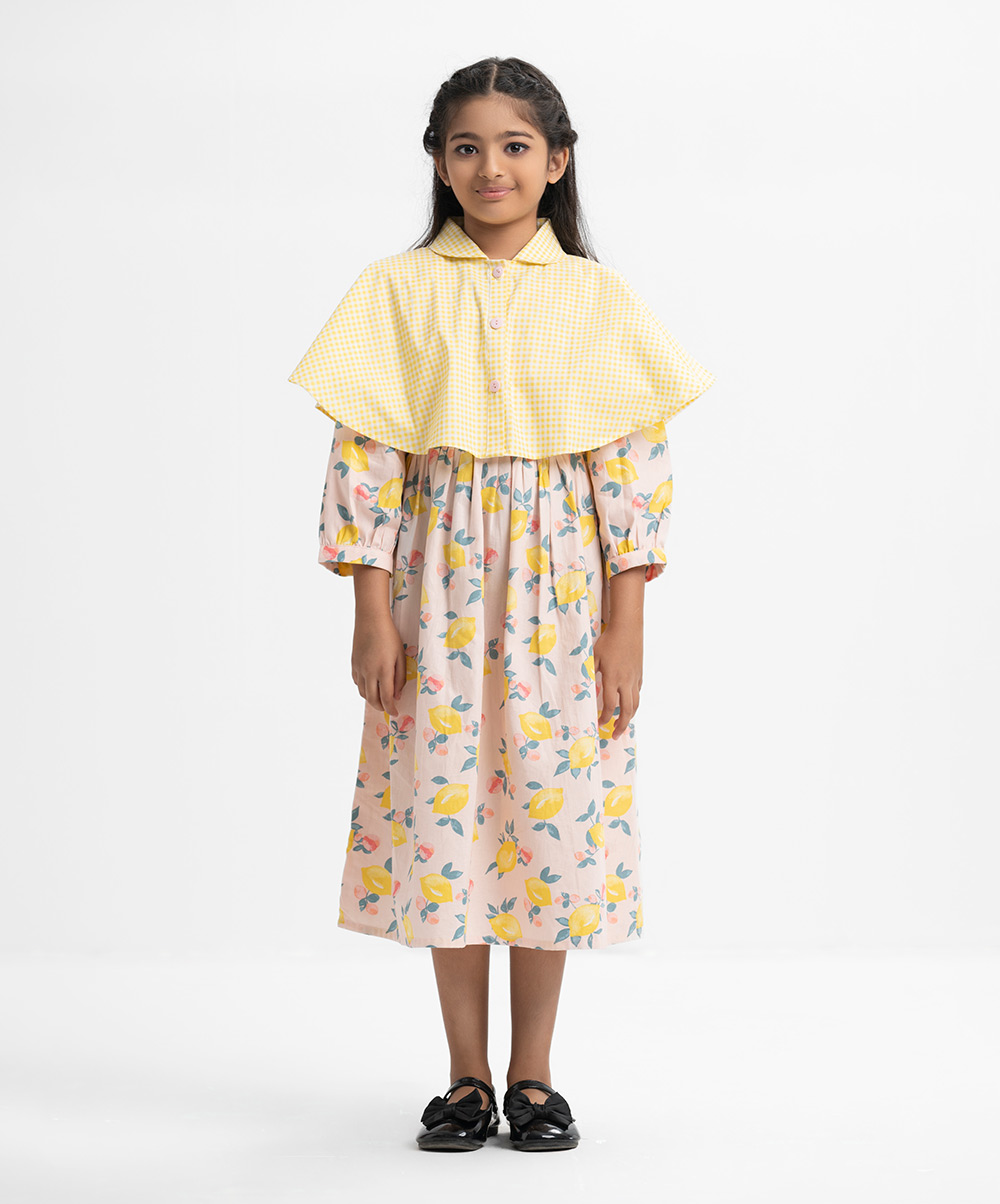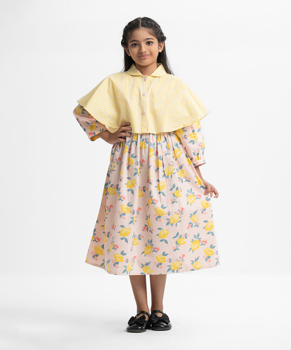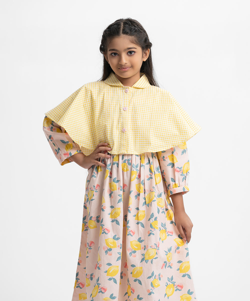 Kid girls printed A-line frock in cotton fabric. Round neck, short sleeves. Gathered at the waistline with belt. Paired with a baby collar cape.