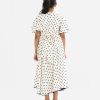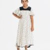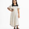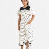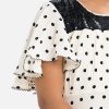 Kid girls A-line polka dot printed frock in georgette fabric. Round neck, butterfly-sleeved. Sequence cut work at the top front.