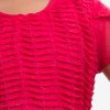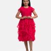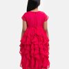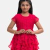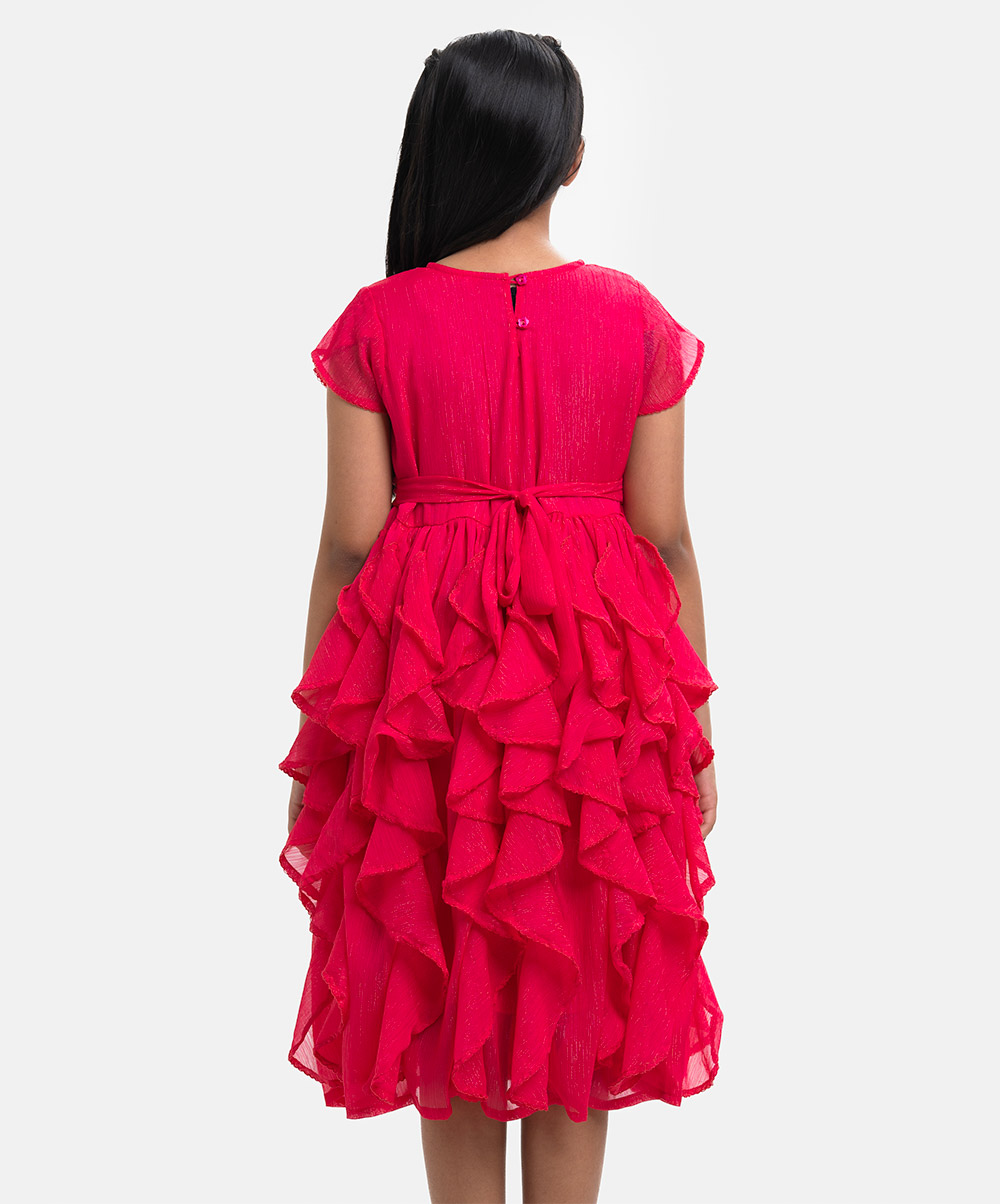 Round neck party frock in georgette fabric. Petal sleeves, wave pintuck with beads at the top front. Ruffle details from the waistline. Full cotton lining inside.