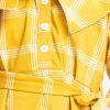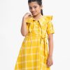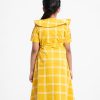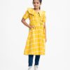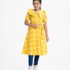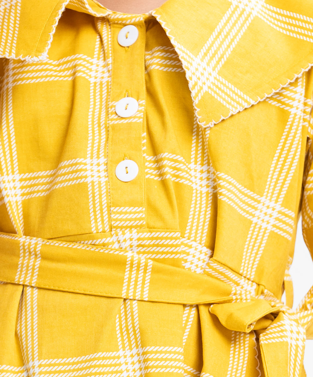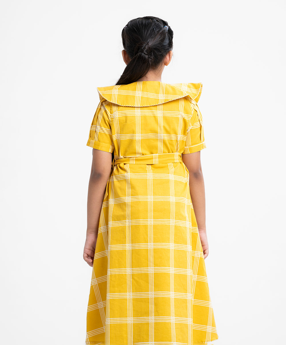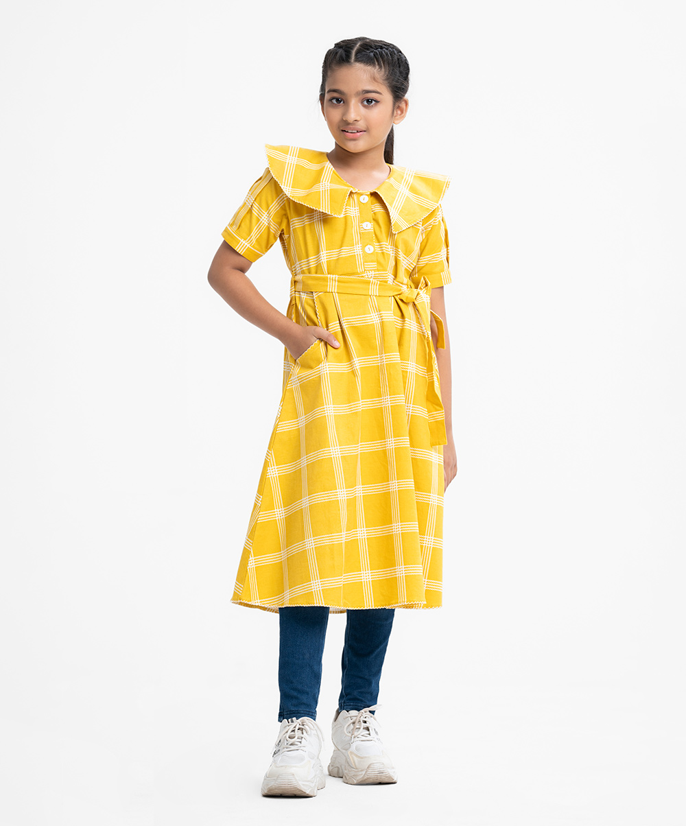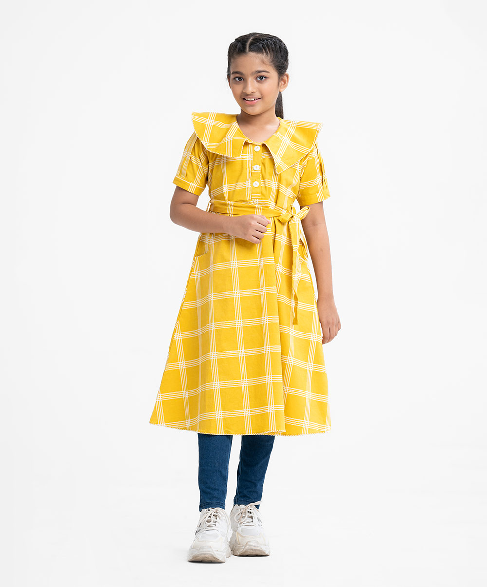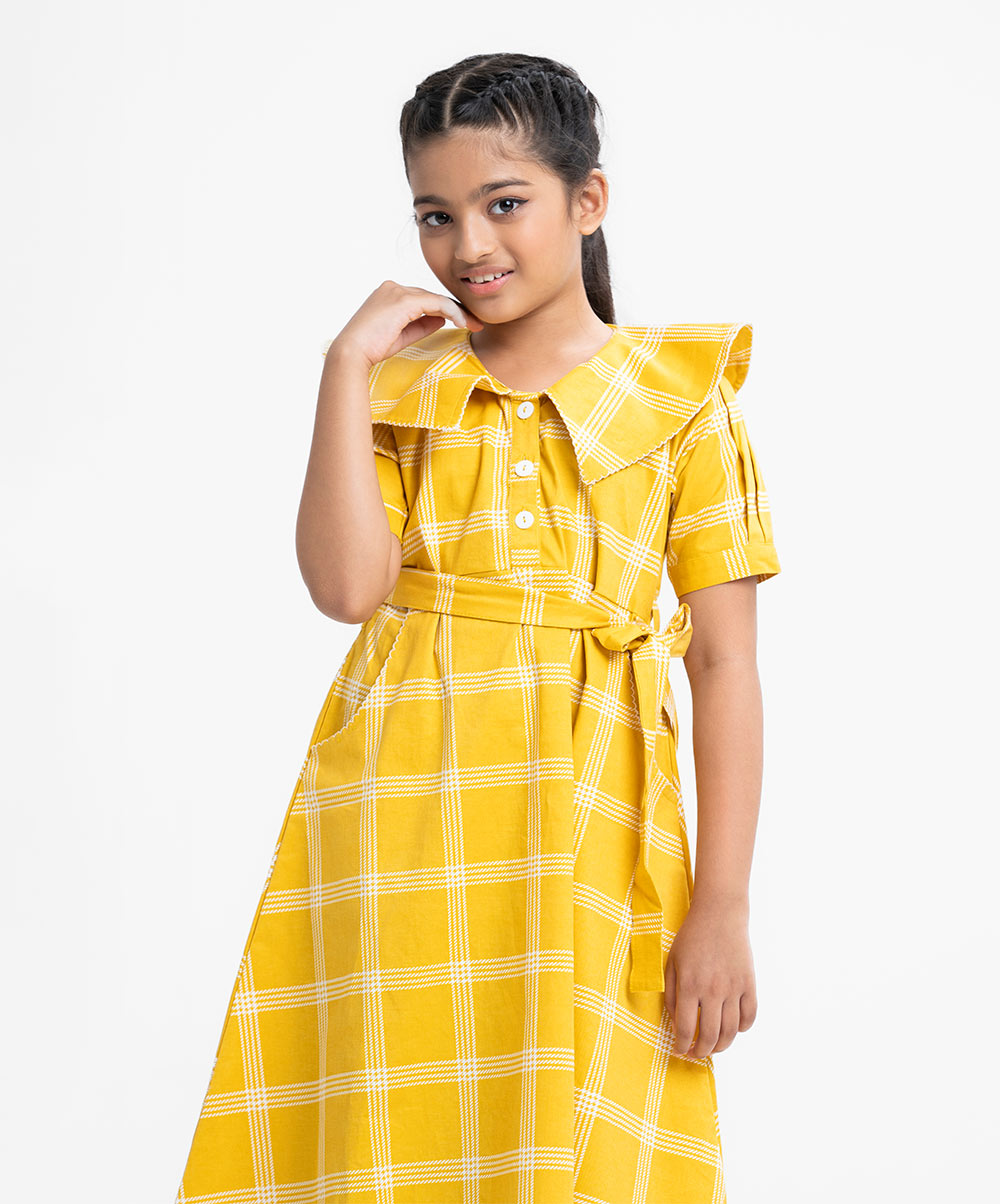 Kid girls printed frock in twill fabric. Short sleeves with pintuck detail, baby collar, front buttons and tie-cord at back. Inseam pockets.
