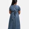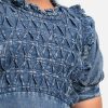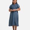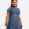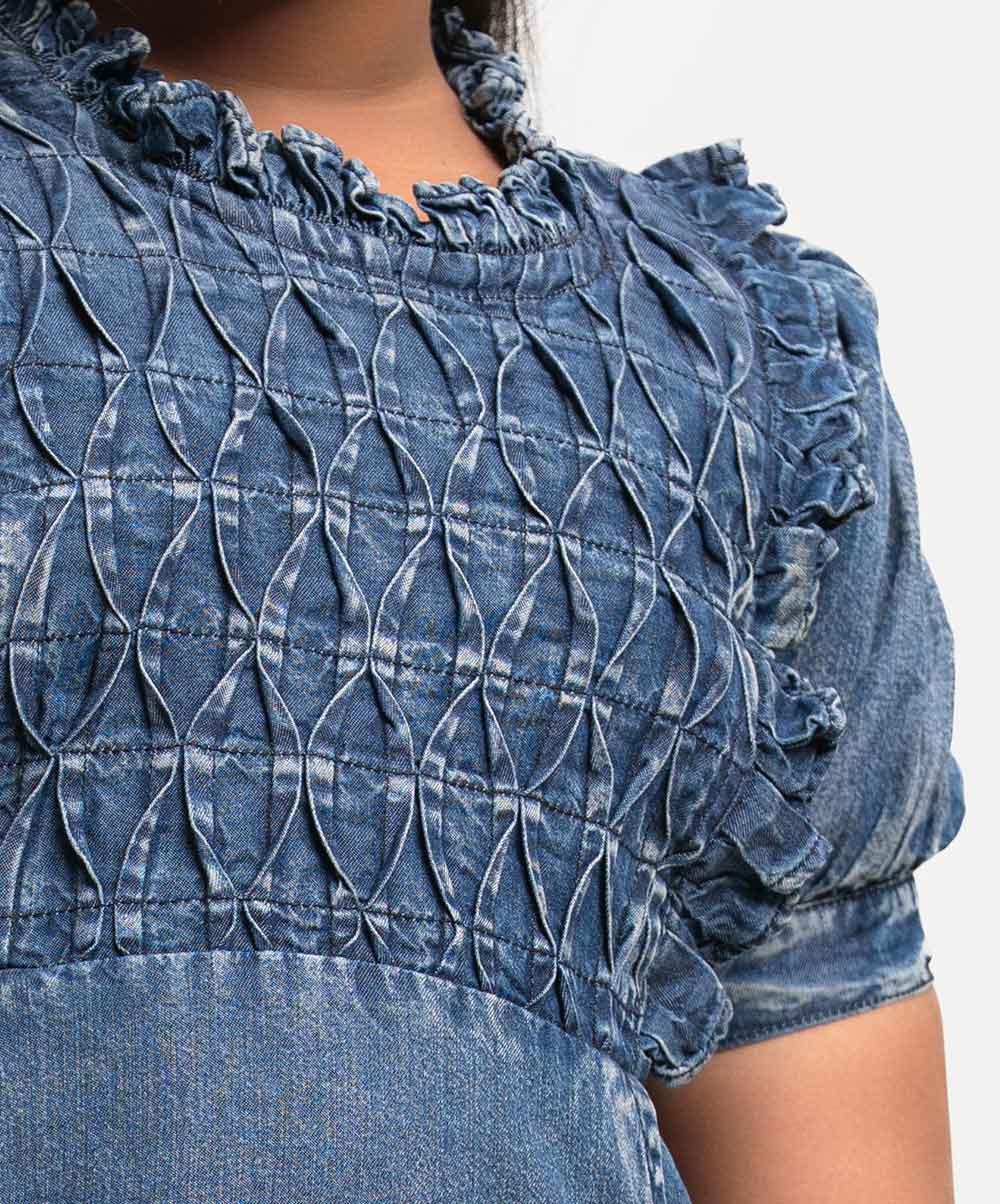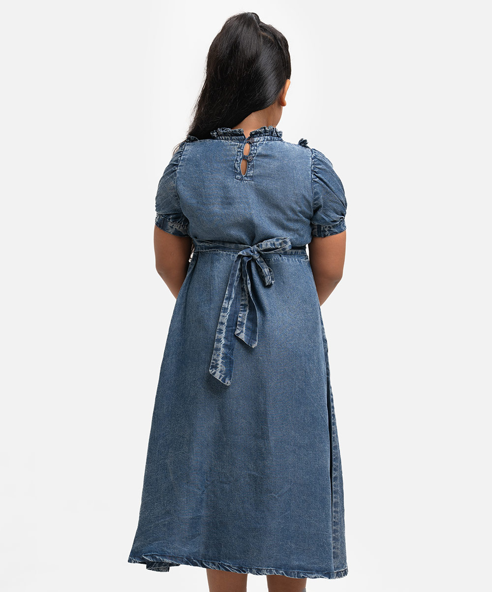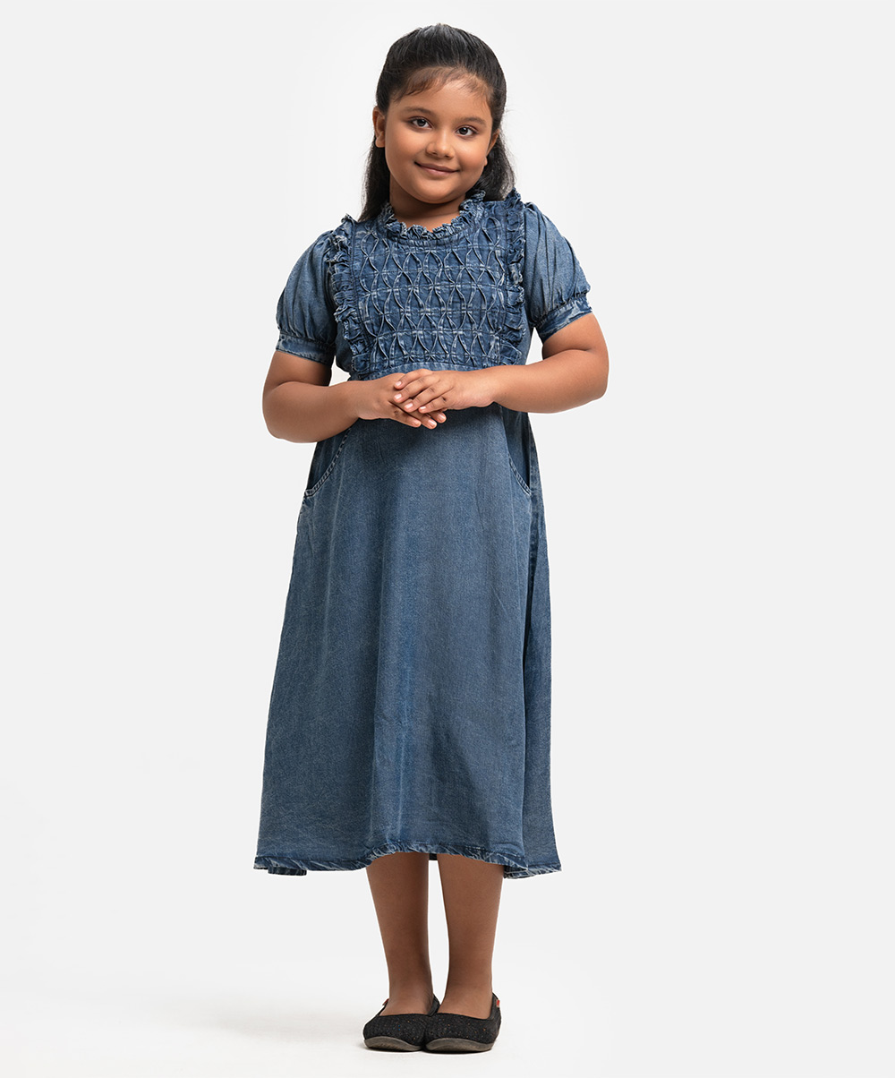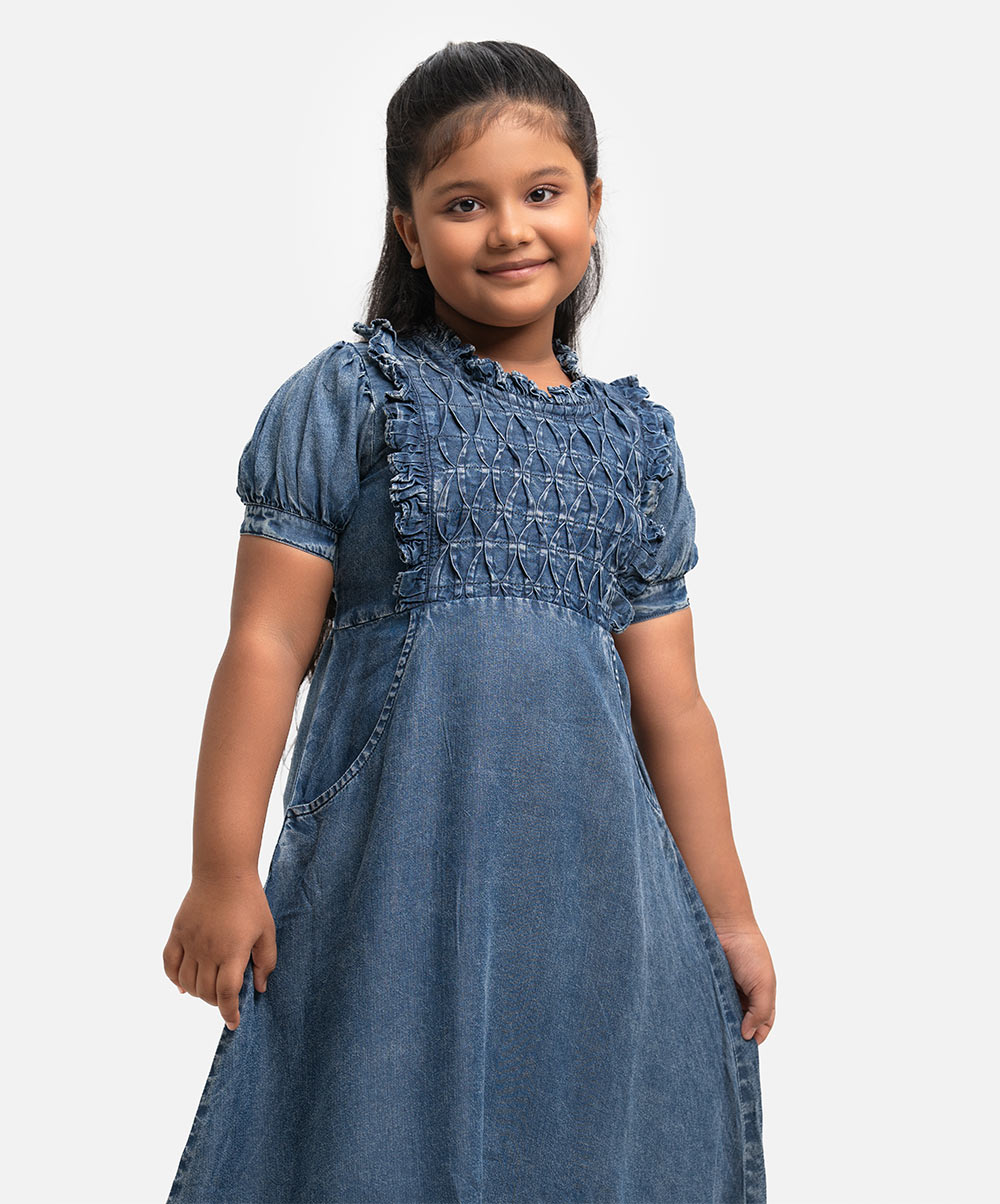 Kid girls A-line frock in denim fabric. Puff sleeves, frill round neck. Diamond pintuck at front. Tie-cord at waistline and inseam pockets.