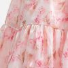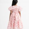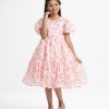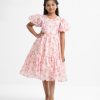 Kid girls fairy tale frock in floral printed organza fabric with full cotton lining and cancan inner. Balloon sleeves, heart neckline. Bow attached and box pleated at waistline. Zipper closing and criss-cross tie-up back with floral tassels.