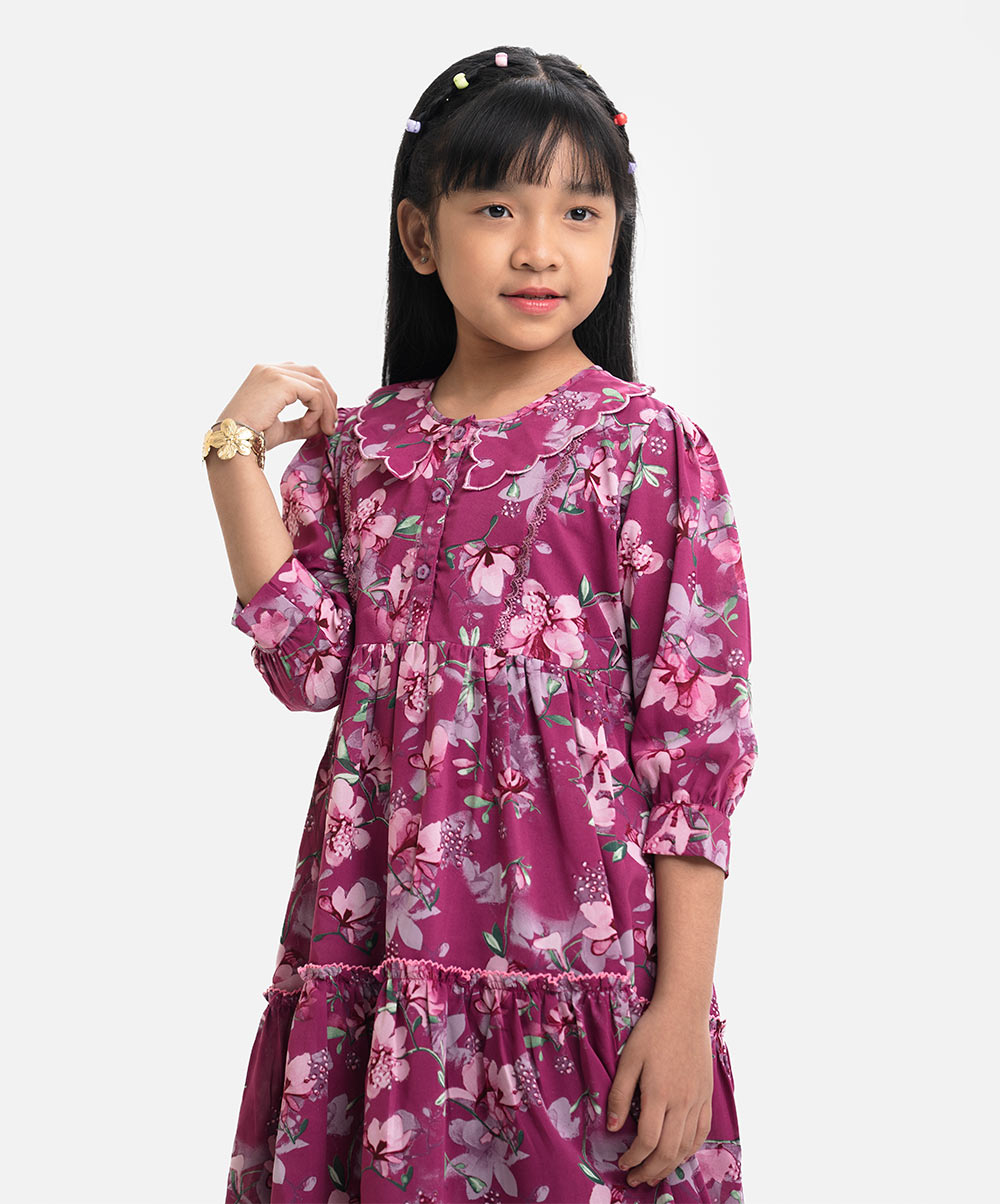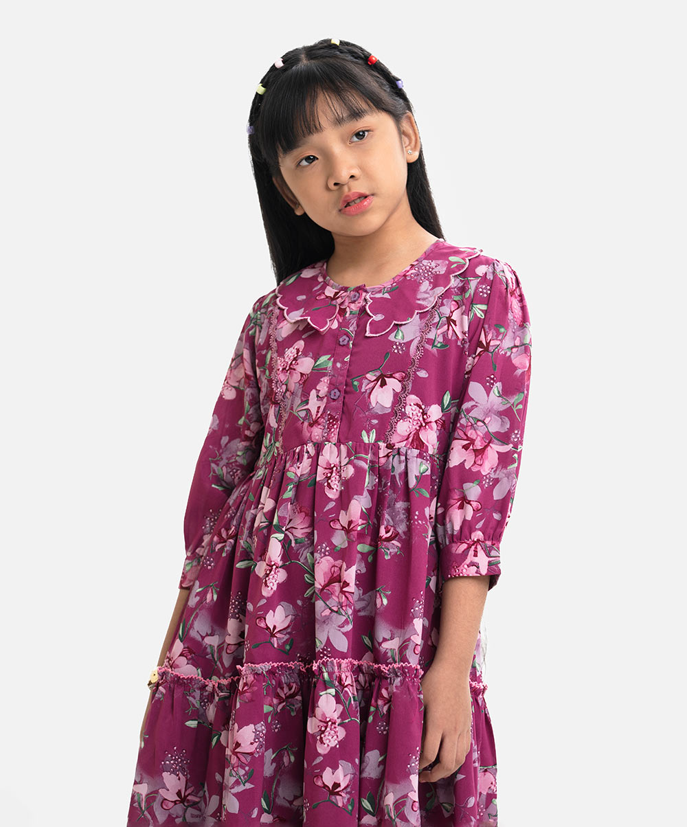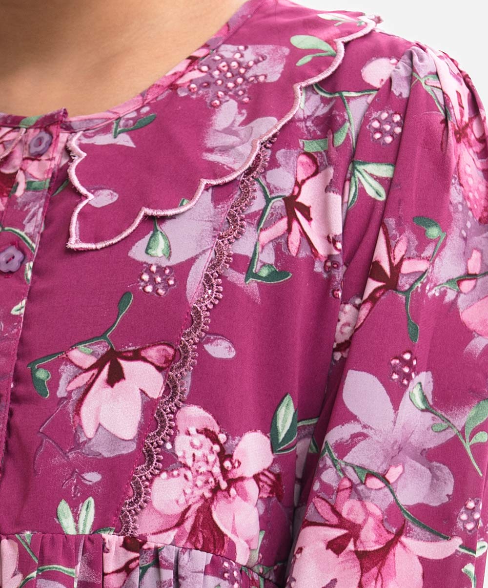 Round neck georgette frock with a scalloped Peter Pan collar. Bishop sleeves, lace details.