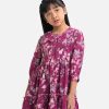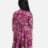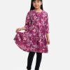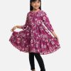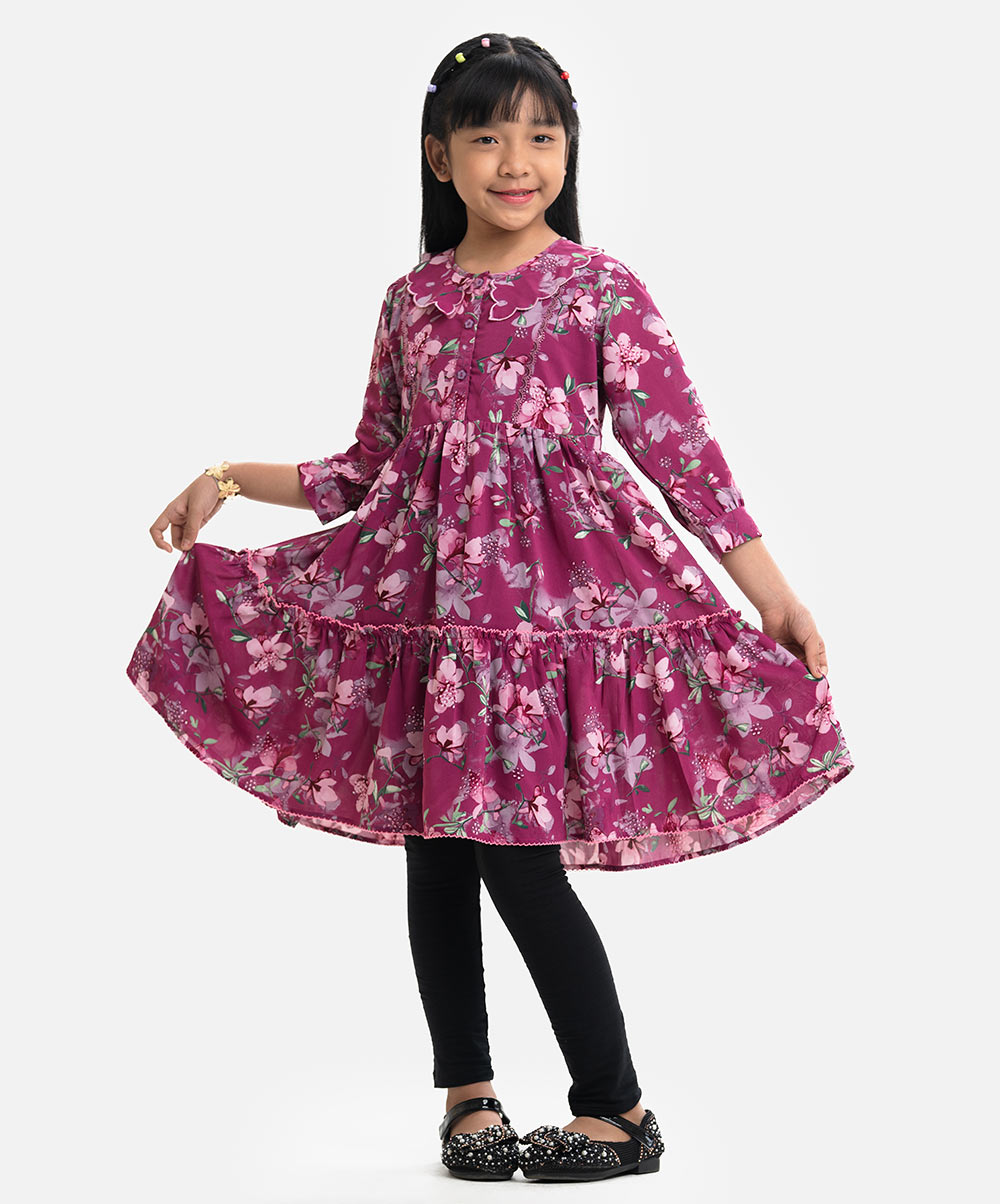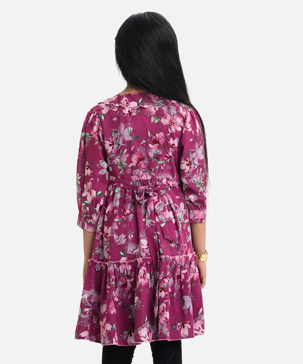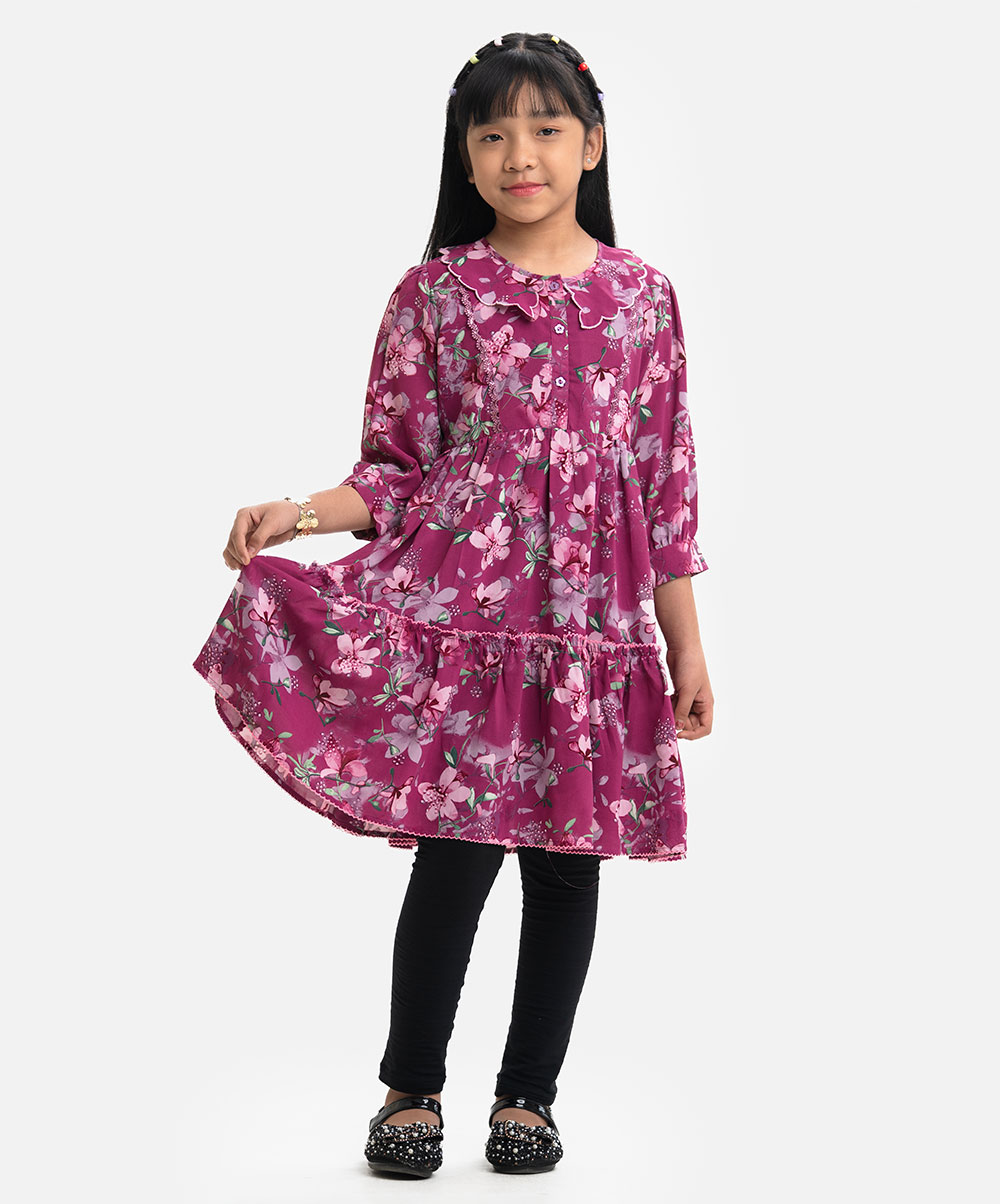 Round neck georgette frock with a scalloped Peter Pan collar. Bishop sleeves, lace details.
