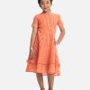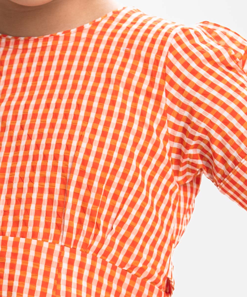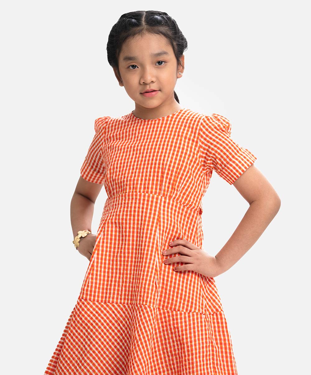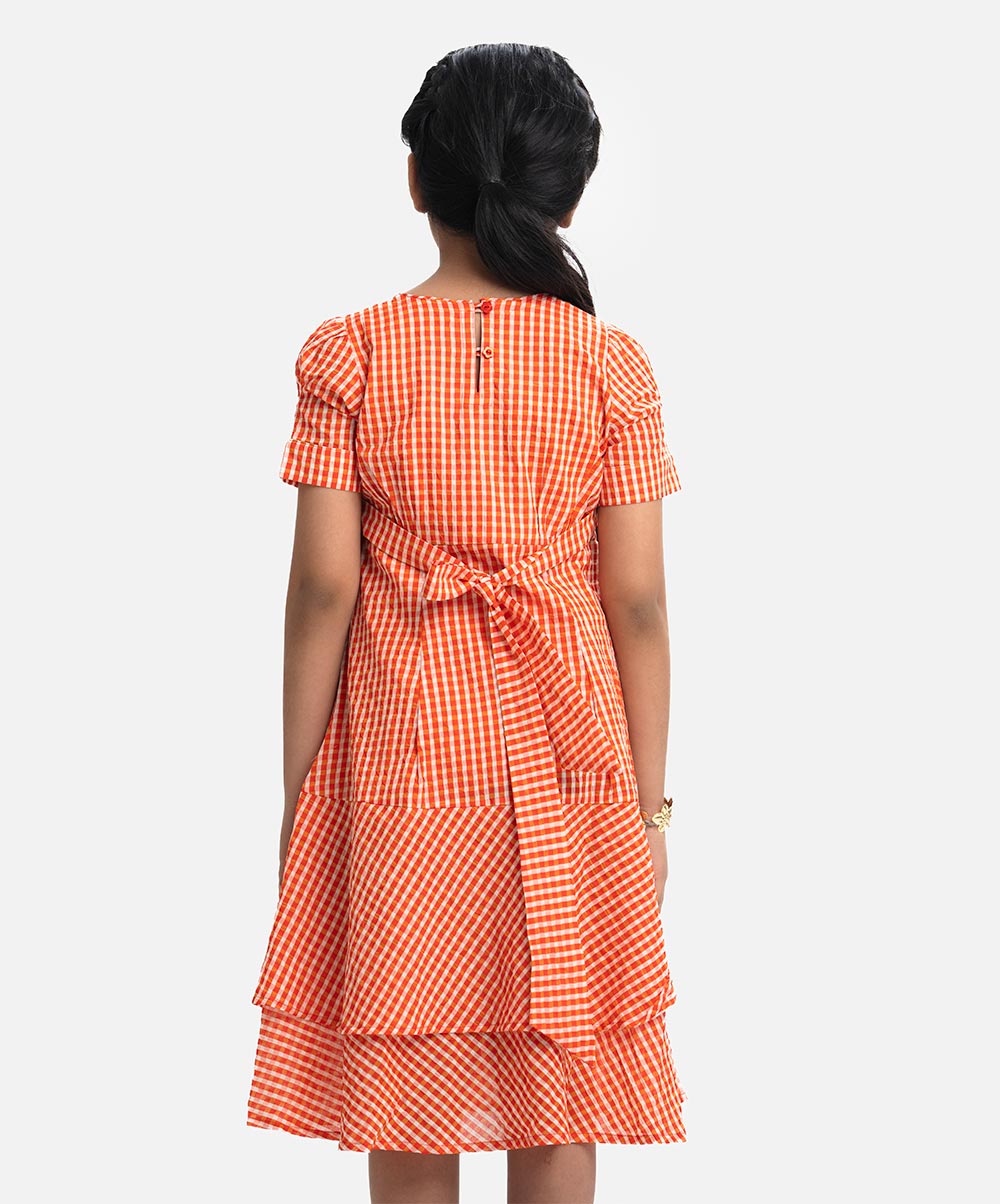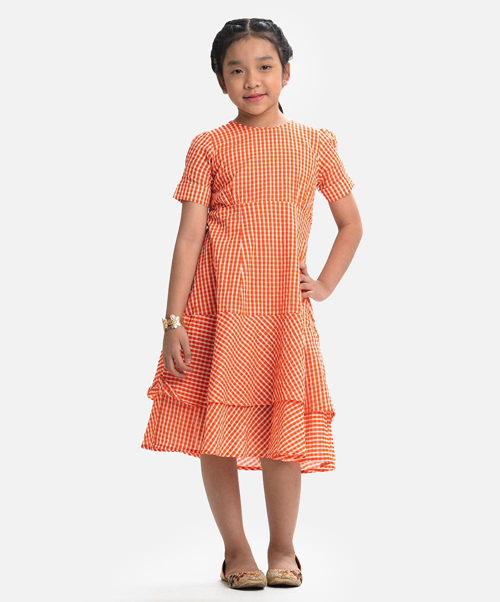 Round neck A-line frock in cotton fabric with a viscose lining. Short sleeves, layers at the hemline.