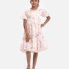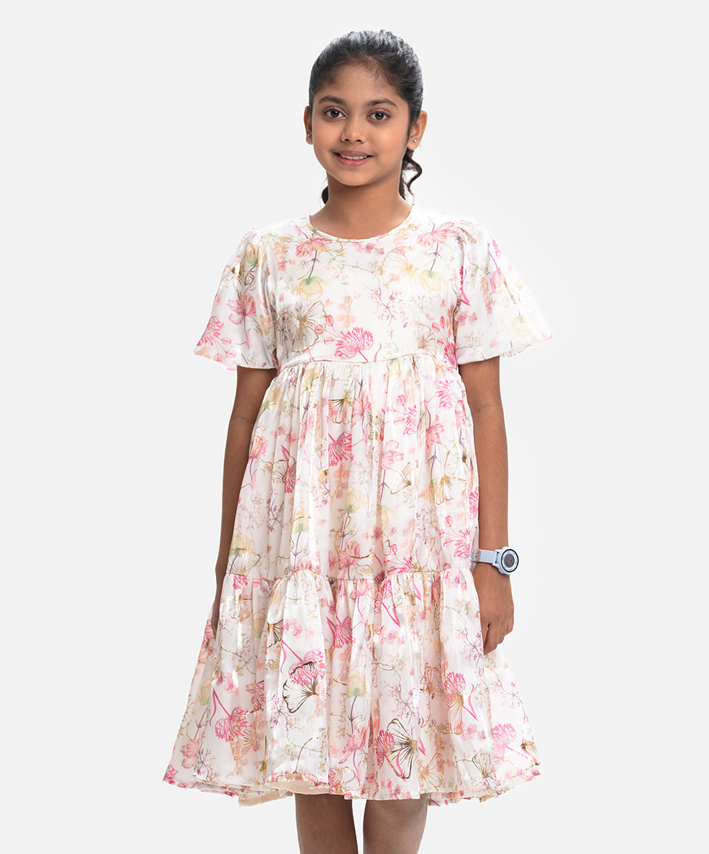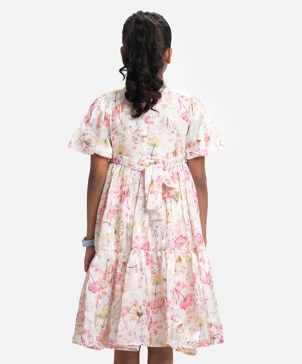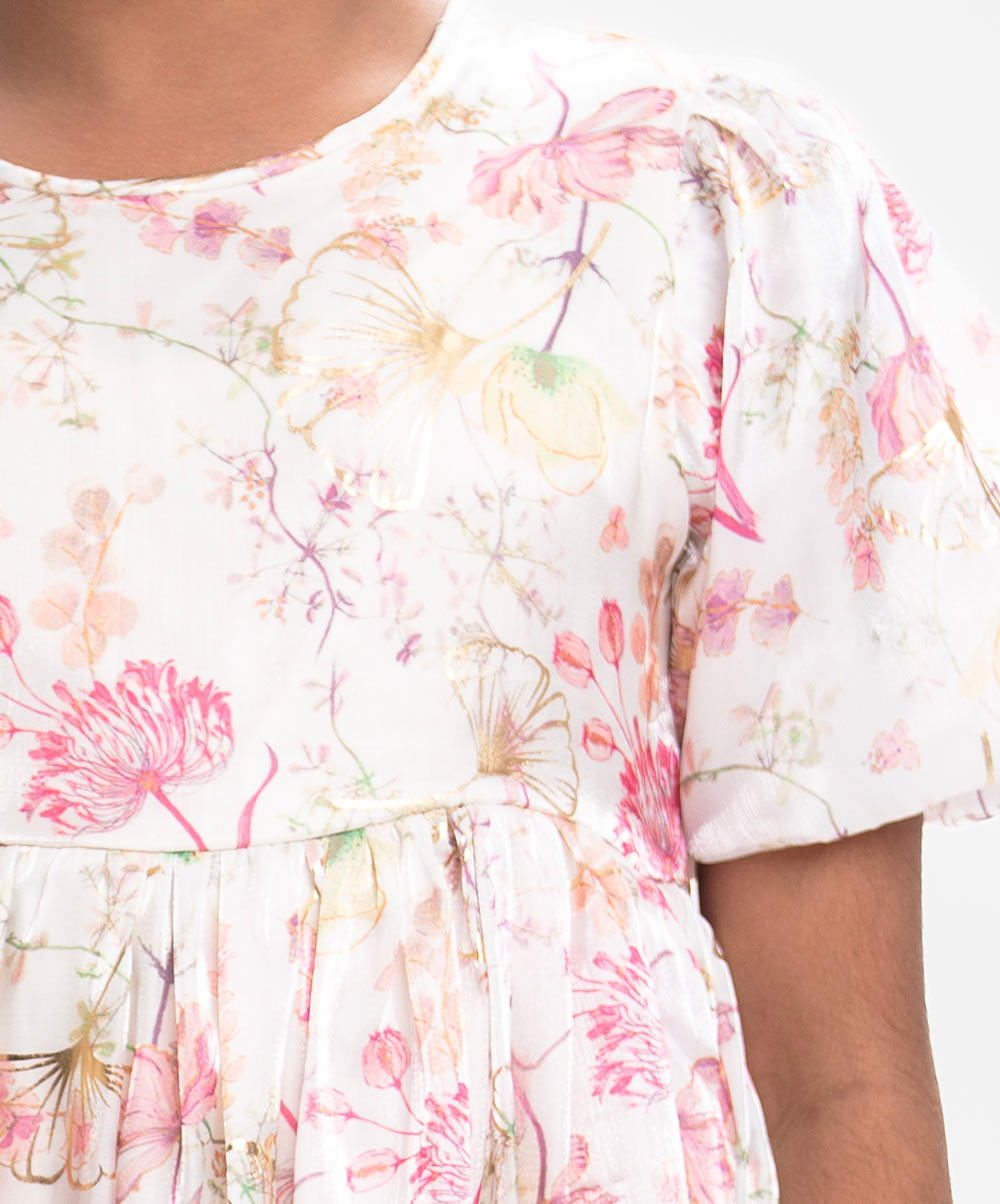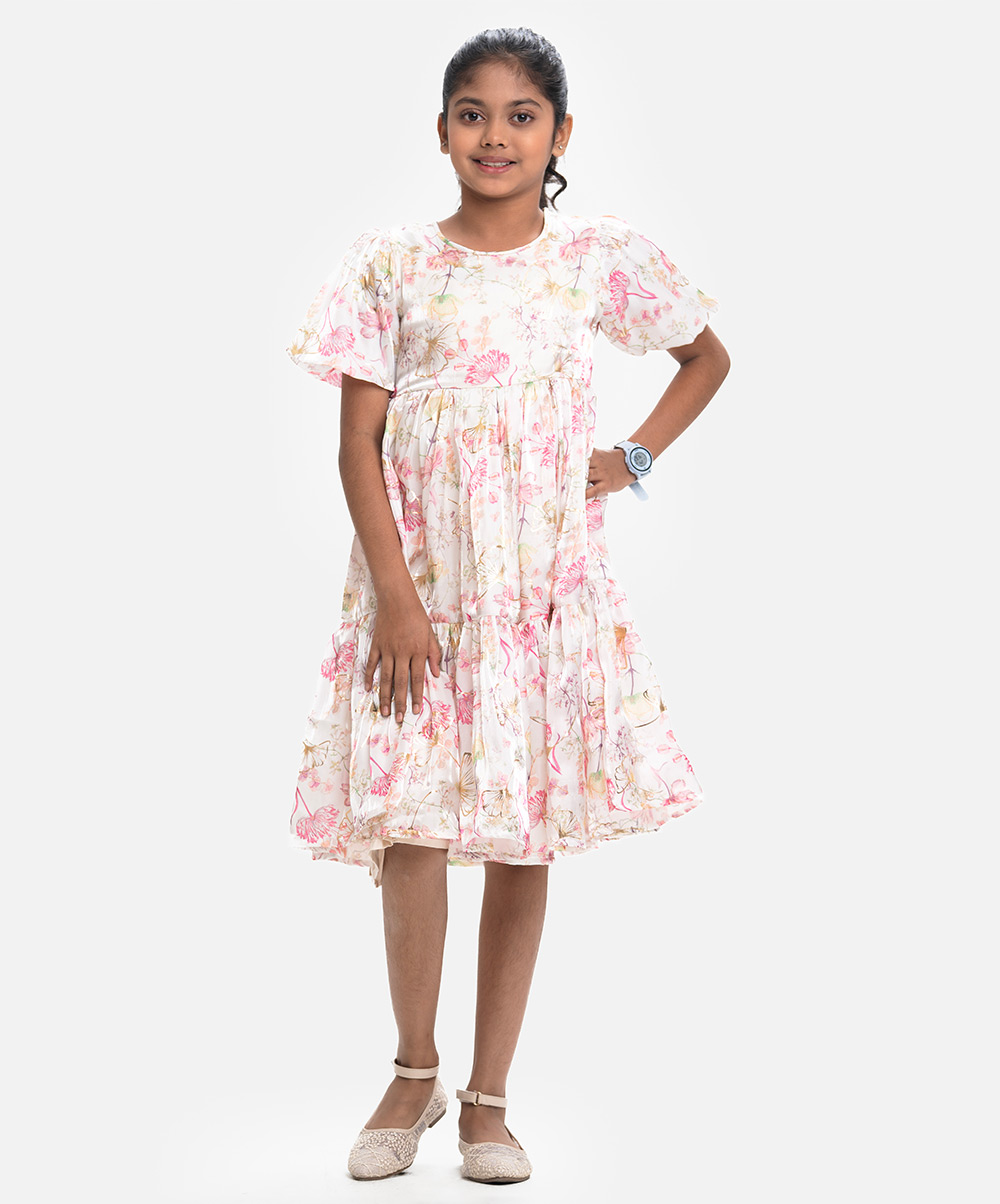 Round neck party frock in smooth georgette fabric with a sheen. Balloon puff sleeves, full viscose lining inside.