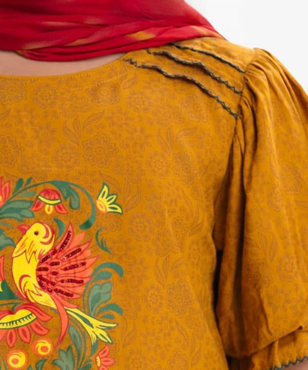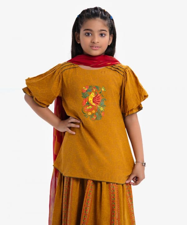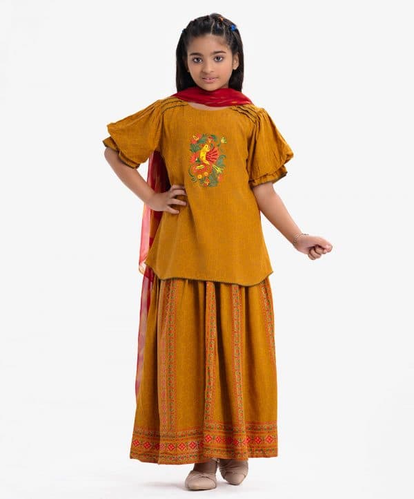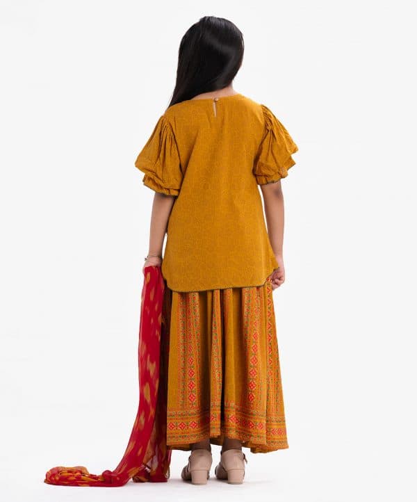 Kid girls printed ghagra choli in viscose fabric. Round neck, puff-sleeved top with karchupi at the front and printed skirt.