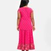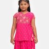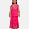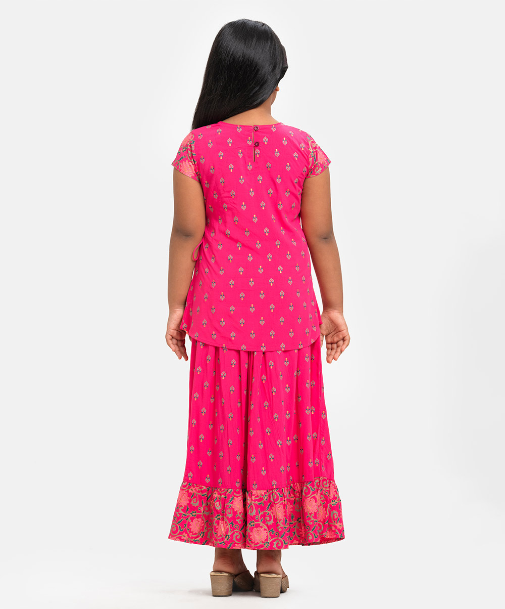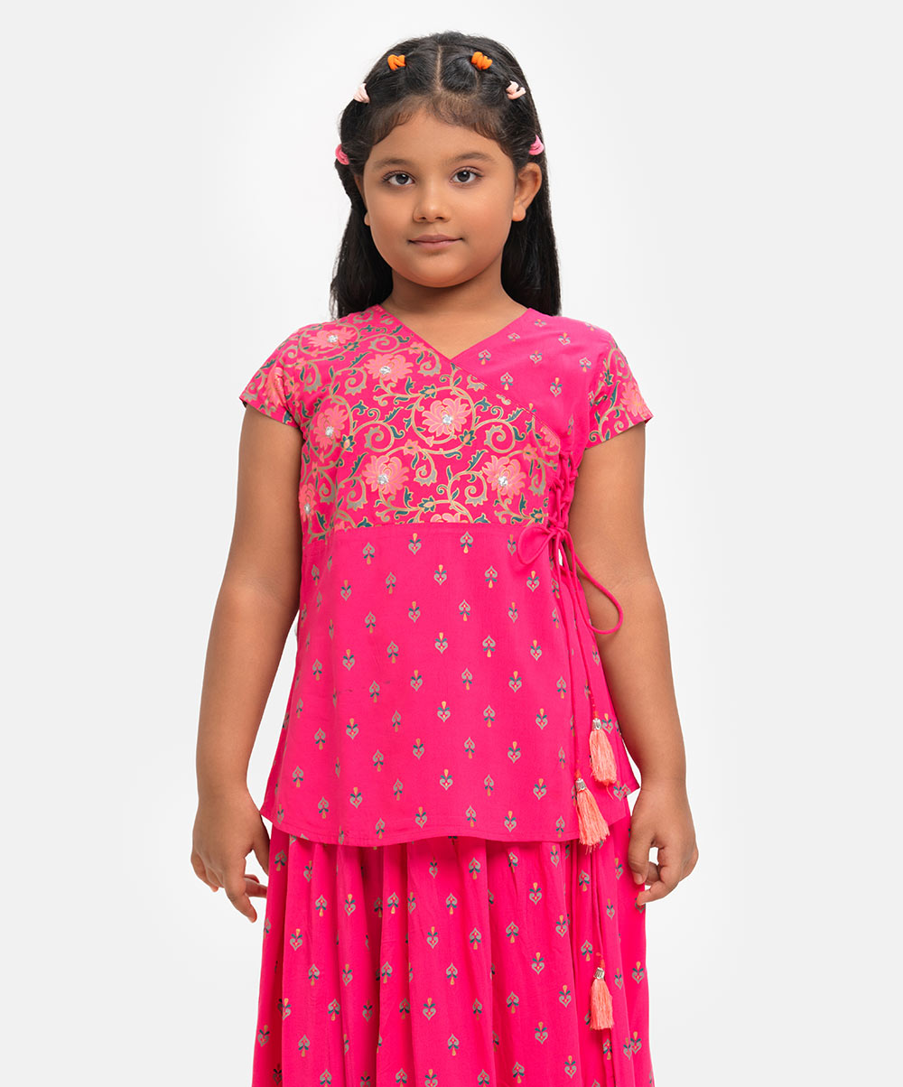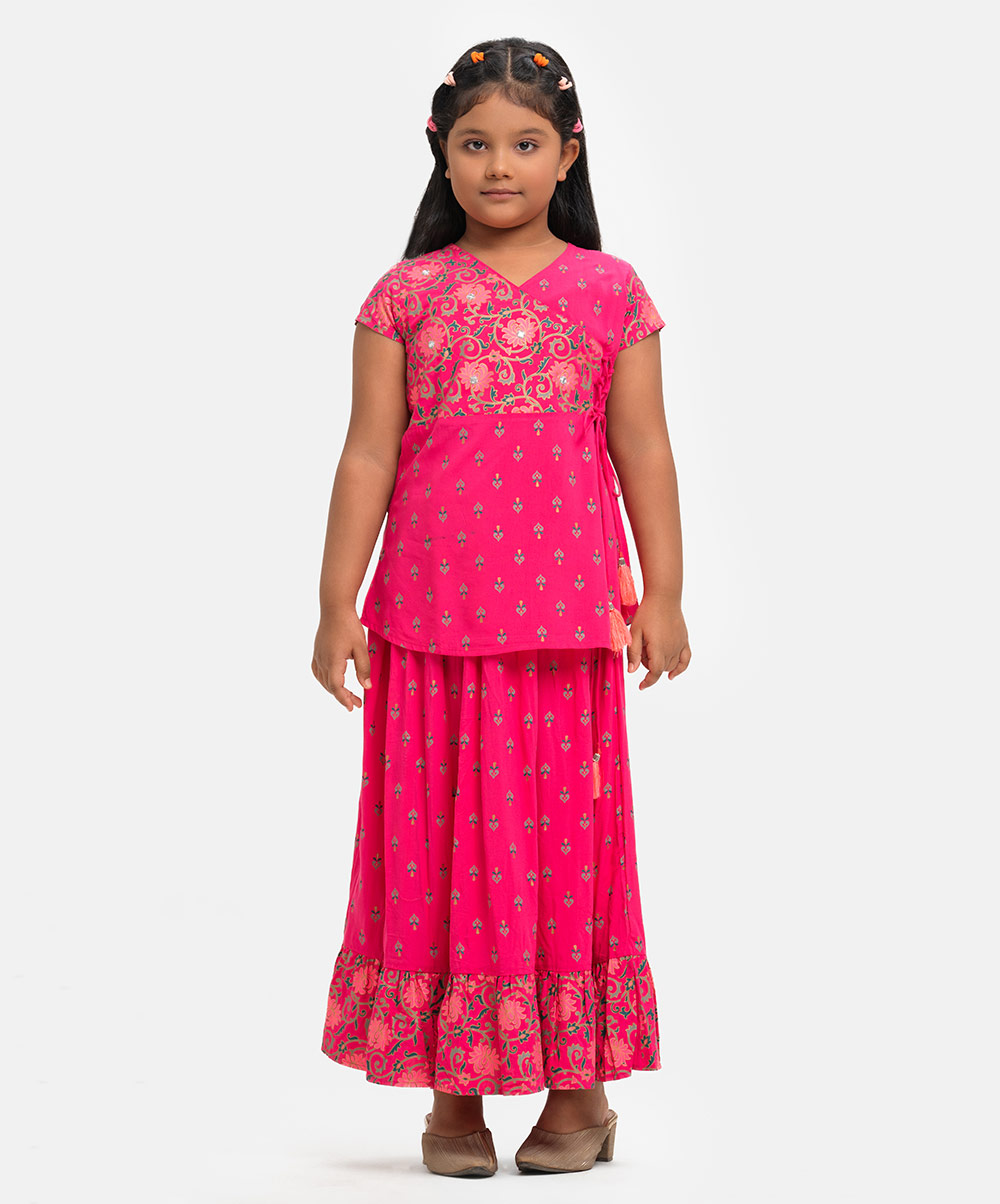 Kid girls printed retro wrap style ghagra choli set in viscose fabric. Cap sleeve, V-neck and embroidery at front of the top. Concealed elasticated flared skirt with attached tassel at waistline.