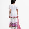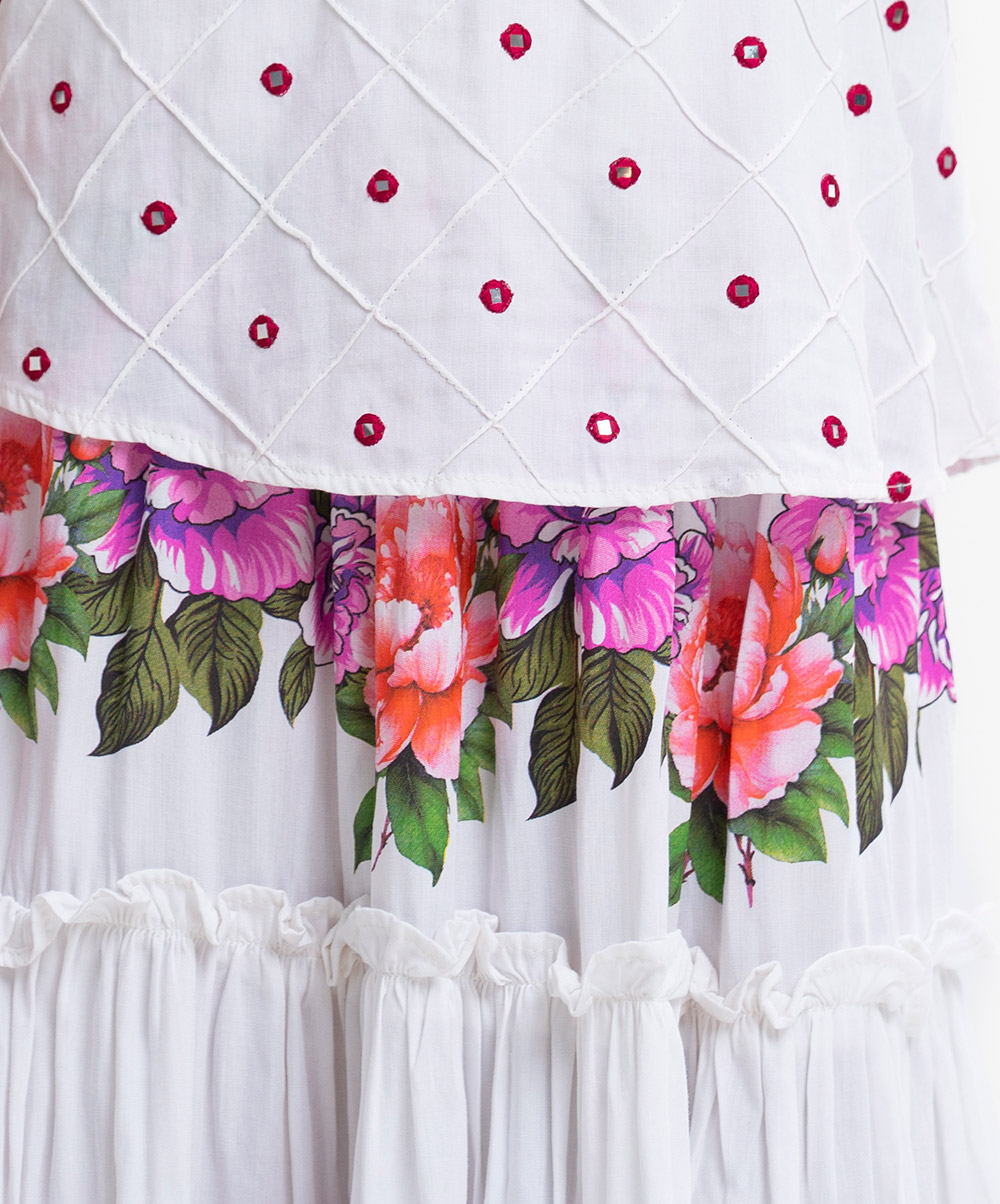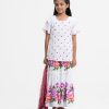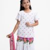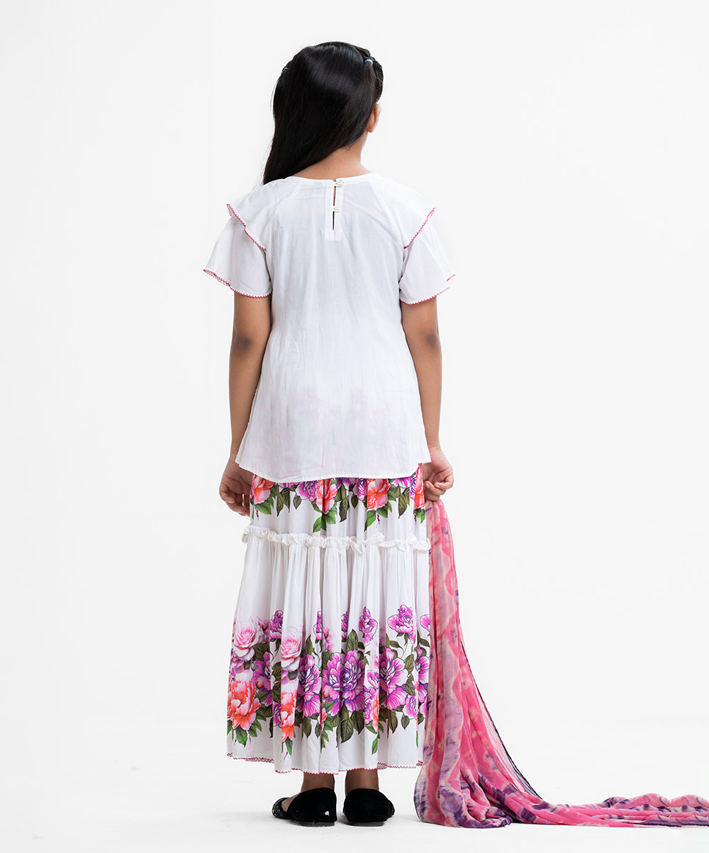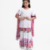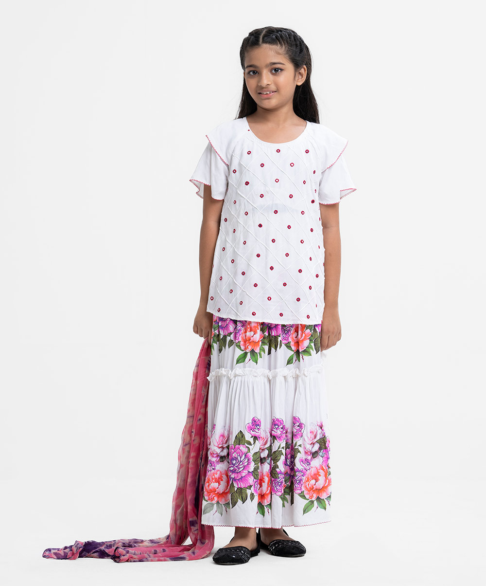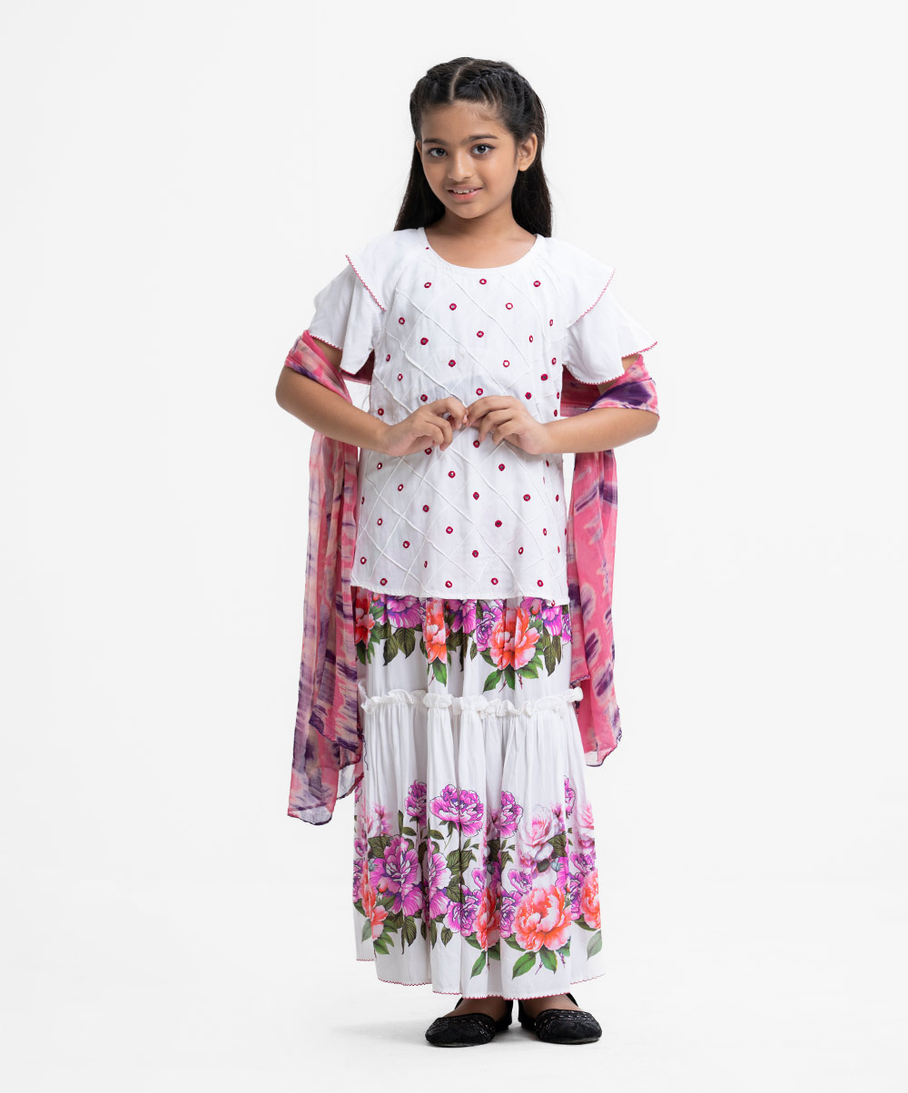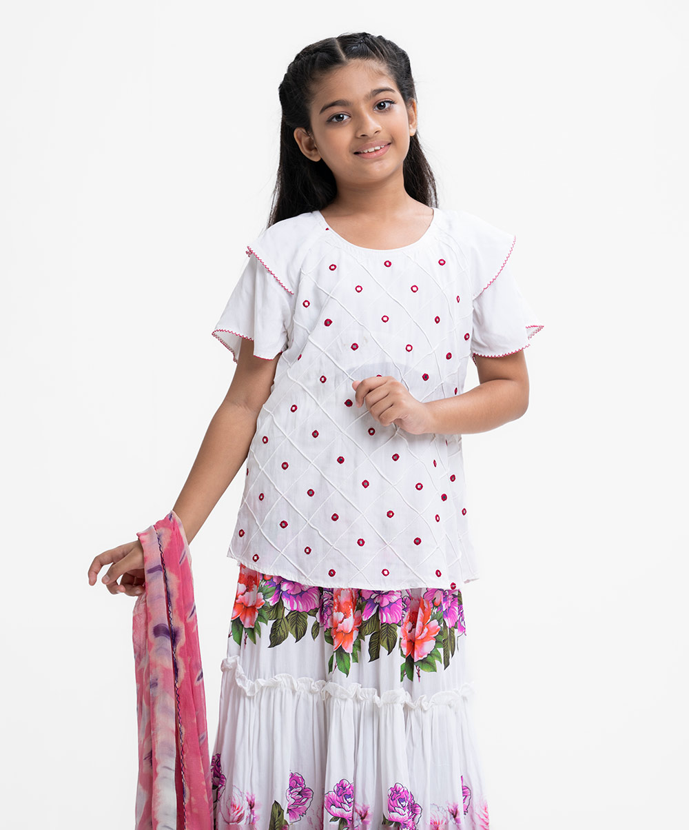 Kid girls ghagra choli set in viscose fabric. Double flutter cap sleeve, round neck and diamond pintuck with embroidery at front of the top. Tie-dye chiffon dupatta with a floral printed detail flared skirt.
